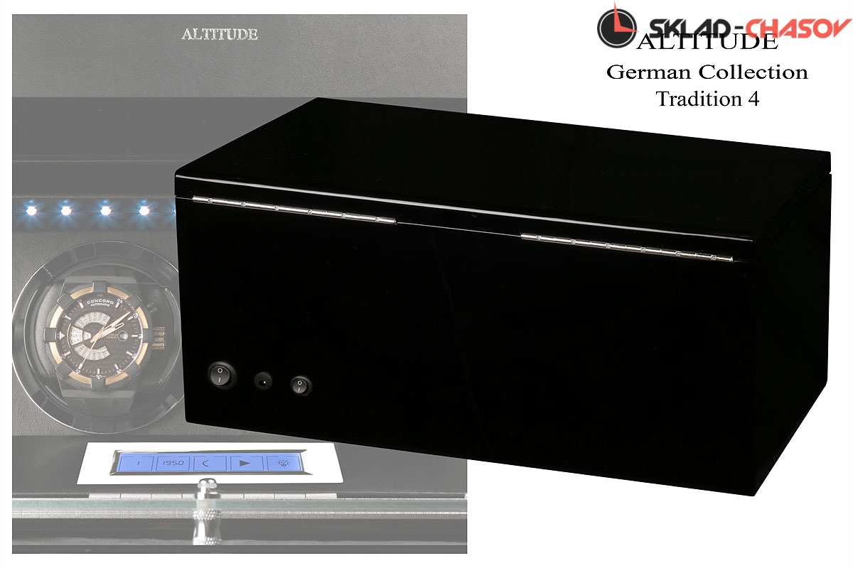 В декоре шкатулки используются такие материалы как благородное черное дерево "венге", минеральное стекло, панель из полированного металла с фирменным логотипом. Декоративная панель в цвет корпуса "венге". Деревянные элементы покрыты множественными слоями рояльного лака. Внутренние поверхности выстлана эко-кожей чёрного цвета. "Стакан" аллюминиевый. В верхней части расположено дополнительное отделение, украшенное логотипом «Altitude», которое можно использовать для хранения наручных часов небольшого размера и ювелирных украшений. Светодиодная подсветка с функцией включения/выключения.