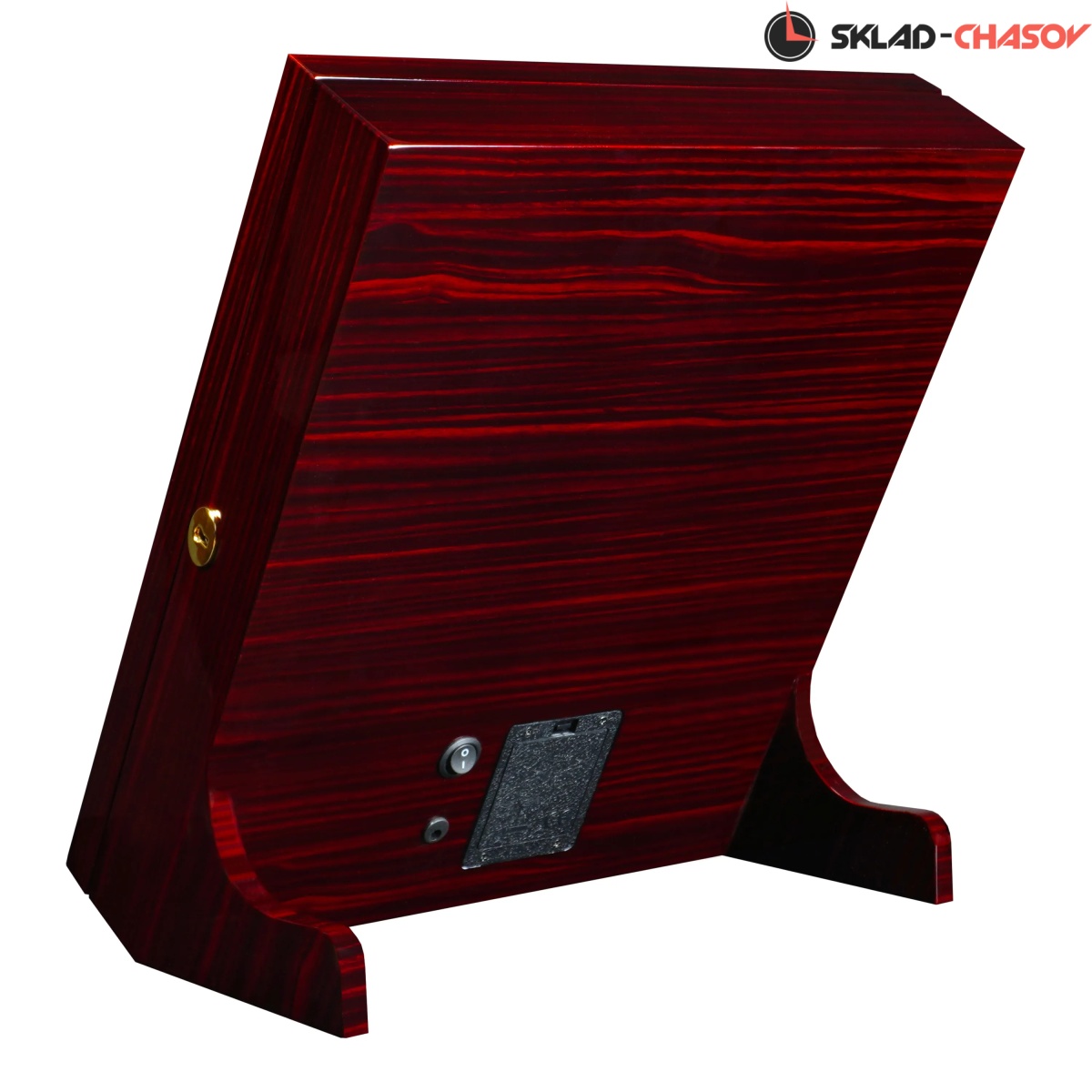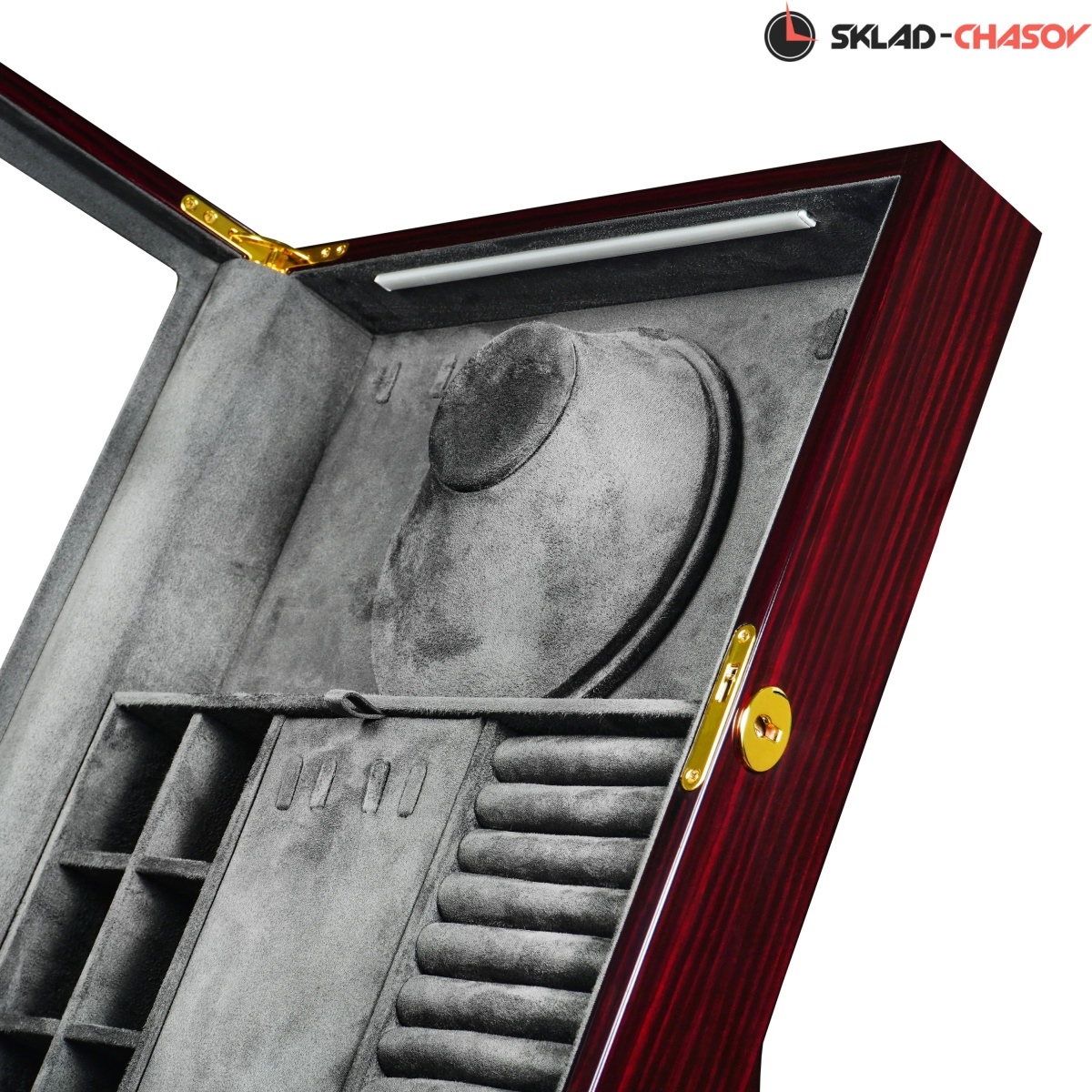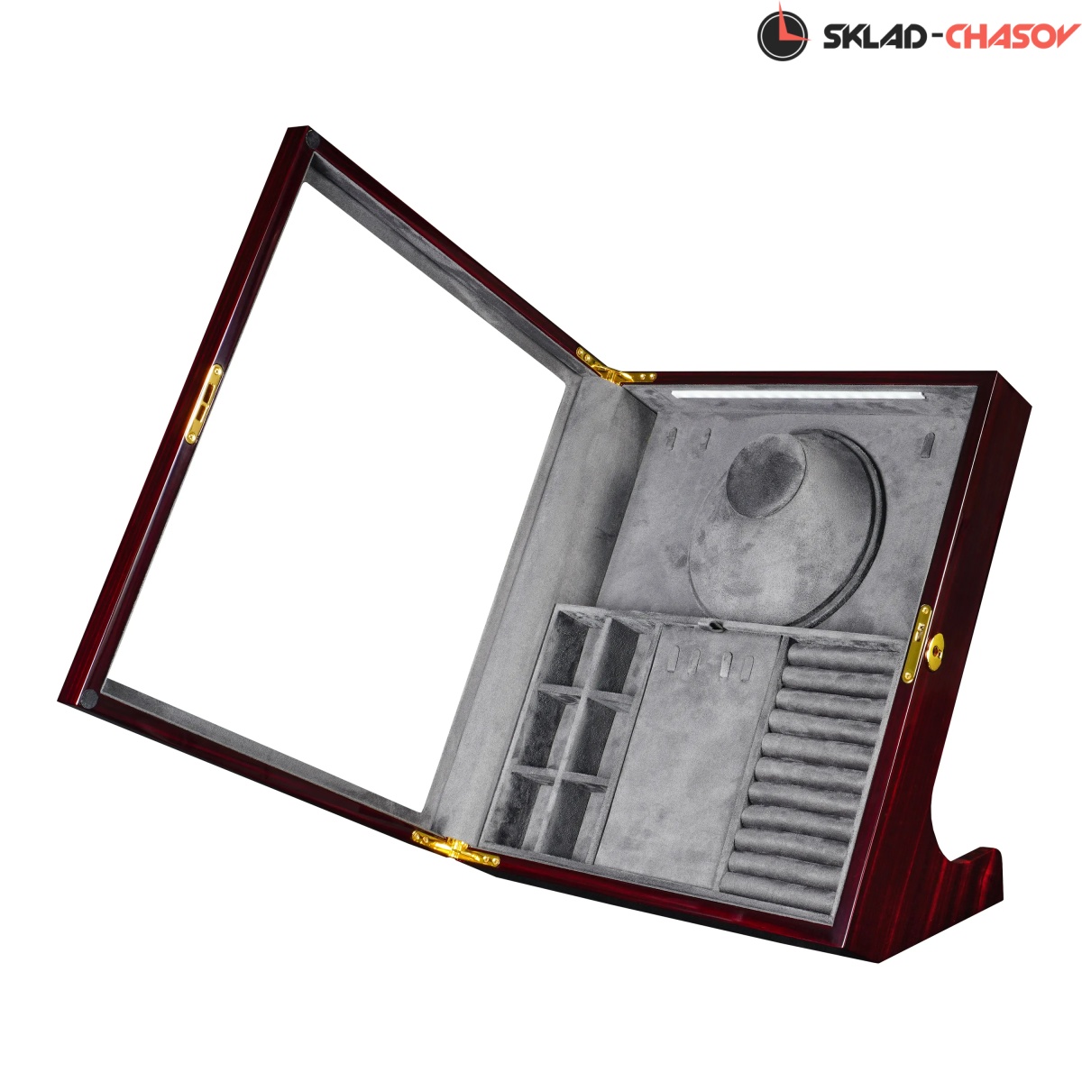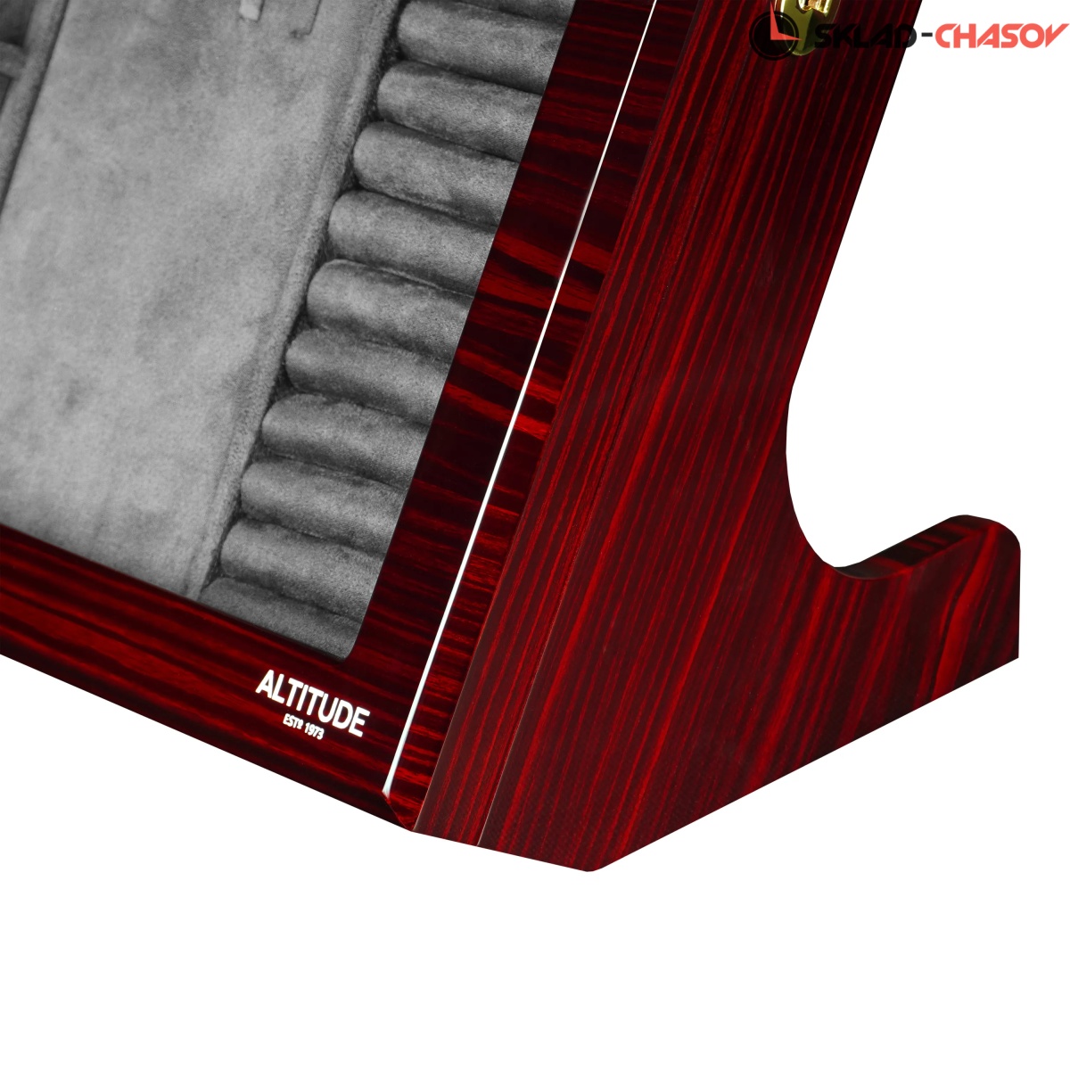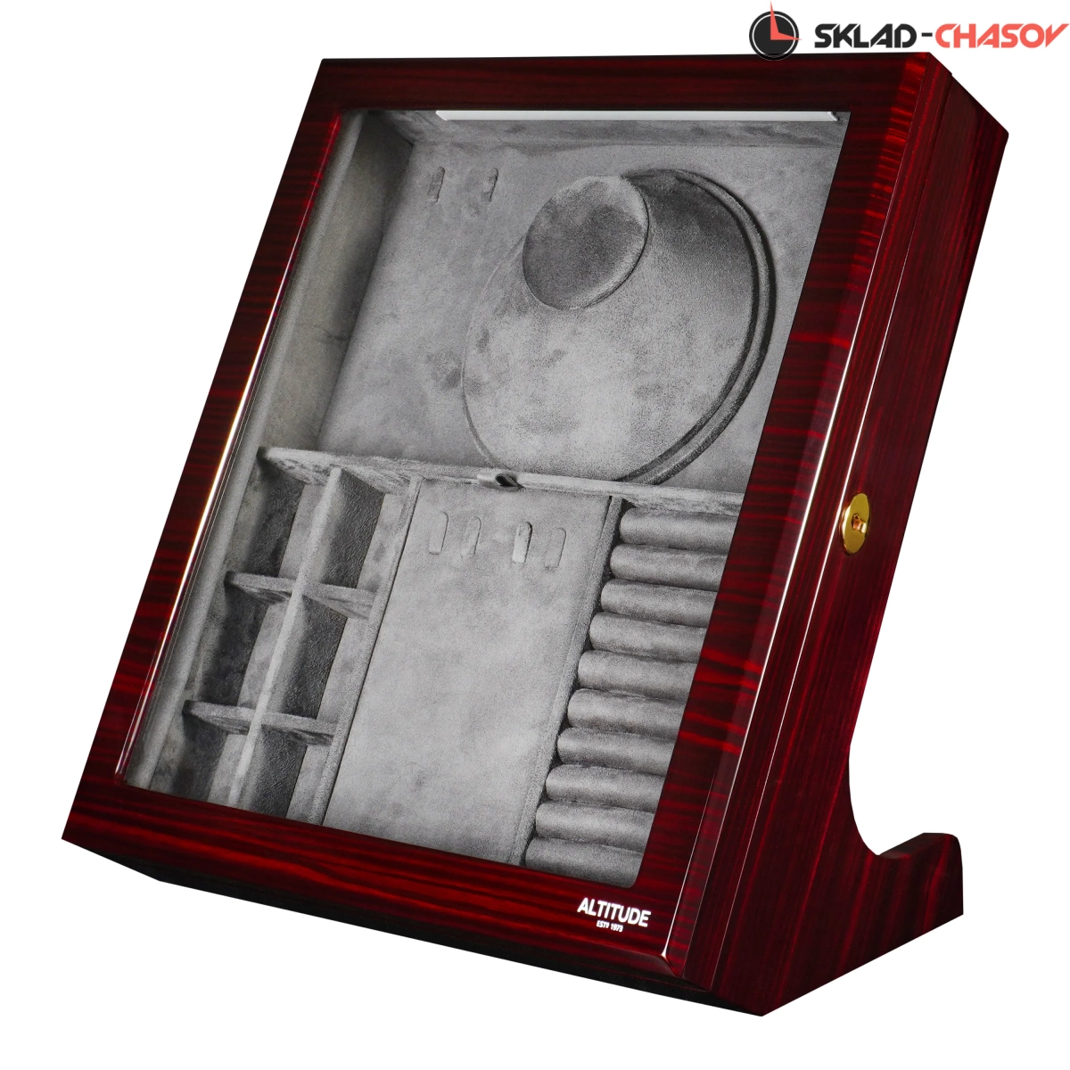Стильная и продуманная до мелочей, шкатулка Altitude YS012-E идеально подойдёт для хранения ваших любимых украшений. Шкатулка для украшений Altitude YS012-E выполнена в бордовом лакированном дереве макассар. Вертикальный корпус с наклоном и стеклянной крышкой придаёт изделию эффектный и современный вид. Крышка из закалённого стекла закрывается на ключ, обеспечивая надёжную защиту. Внутренняя отделка выполнена из мягкого тёмно-серого велюра и включает: 6 ячеек для мелких украшений (серьги, клипсы, запонки), секцию с крючками для цепочек и подвесок, центральное отделение с крышкой для хранения колье, отдел для колец и запонок с мягкими валиками. Встроенная LED-подсветка автоматически включается при открытии крышки, подчёркивая благородство интерьера и красоту украшений. Питание подсветки возможно как от сети 220В, так и от батареек; кнопка включения расположена на задней панели корпуса.