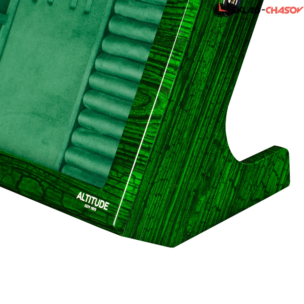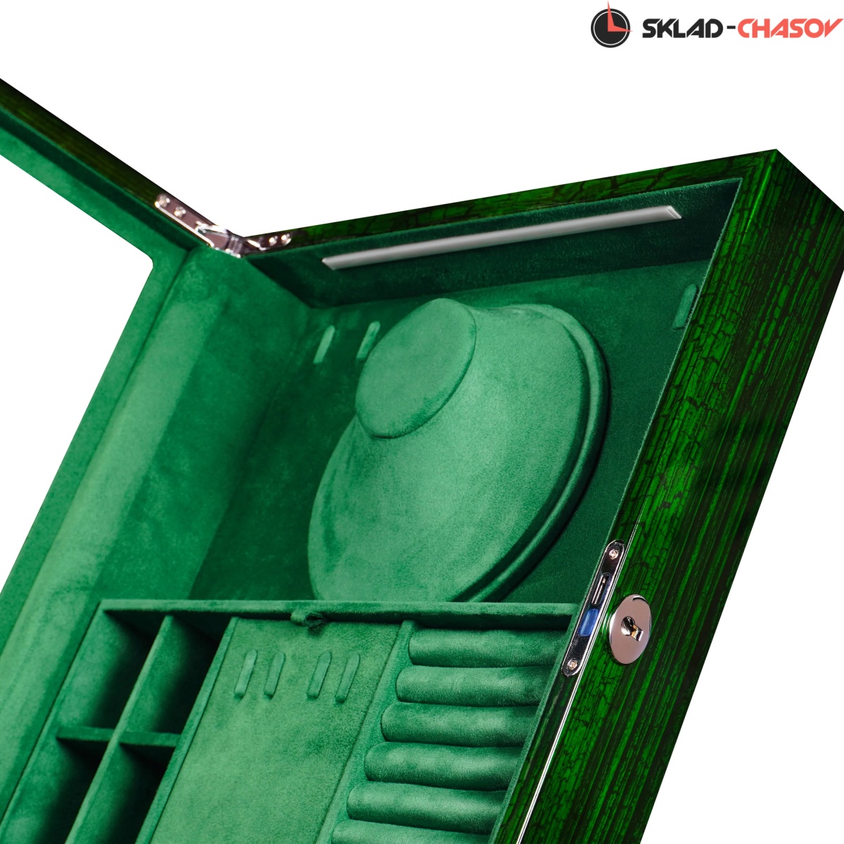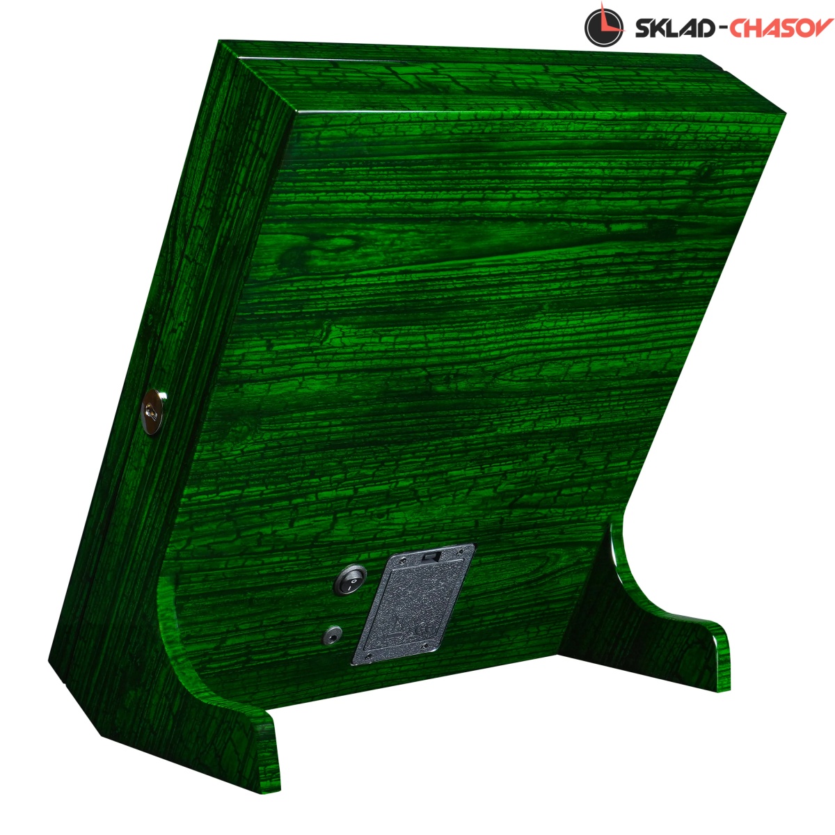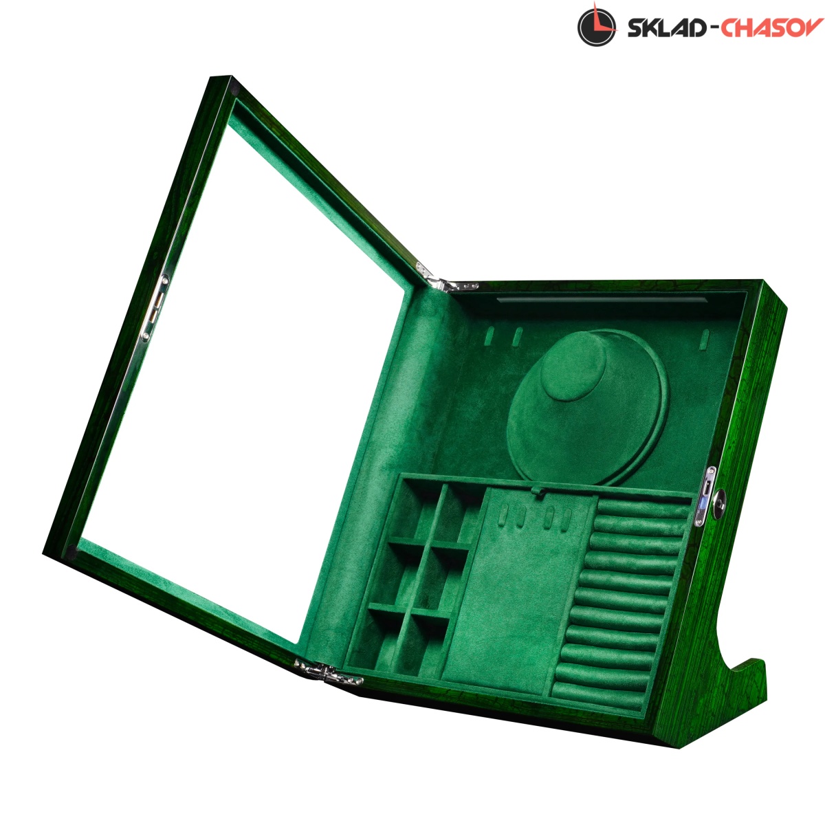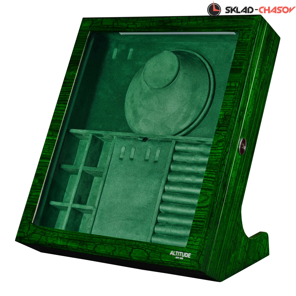 Выразительная и необычная, шкатулка Altitude YS012-GE в отделке под зелёный дуб станет акцентной деталью интерьера и надёжным хранилищем для украшений. Модель Altitude YS012-GE выполнена из дерева с глянцевой лакировкой ярко-зелёного оттенка и выразительной текстурой дуба. Элегантная вертикальная конструкция с наклоном и стеклянной крышкой гармонично сочетает функциональность и стиль. Крышка из закалённого стекла закрывается на ключ, а внутри шкатулка обтянута мягким зелёным велюром, создающим благородное цветовое единство. Организация пространства включает: 6 компактных ячеек для серёжек, запонок и мелких украшений, секцию с крючками для цепочек и подвесок, центральное отделение с крышкой для хранения колье, отдел для колец и запонок с мягкими валиками. Встроенная LED-подсветка автоматически включается при открытии крышки, подчёркивая насыщенность цвета и форму украшений. Питание подсветки возможно как от сети 220В, так и от батареек; кнопка включения расположена на задней панели корпуса.