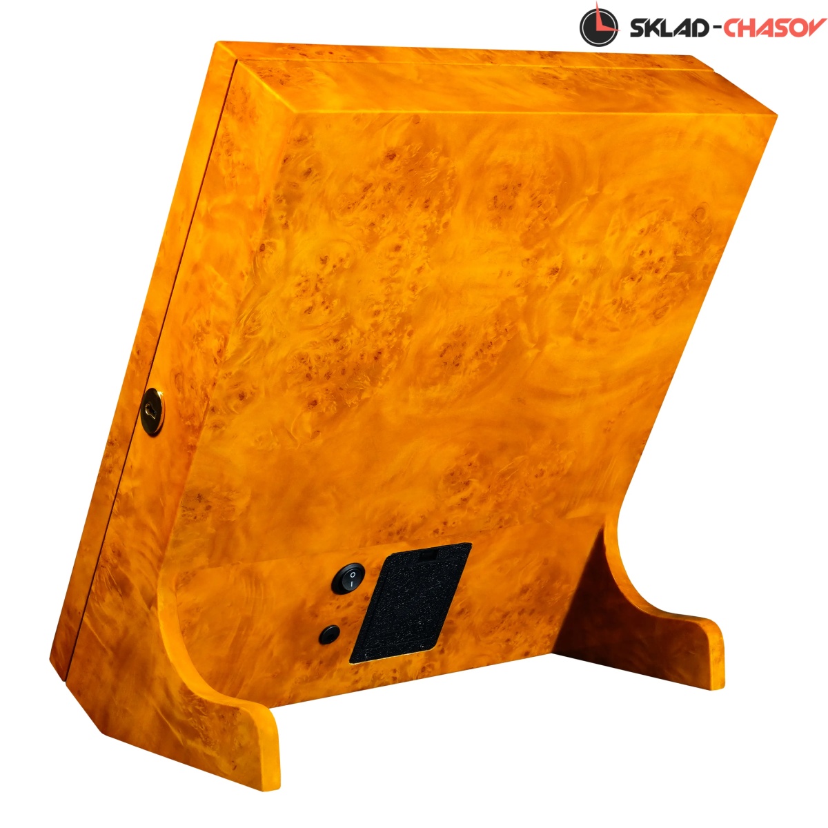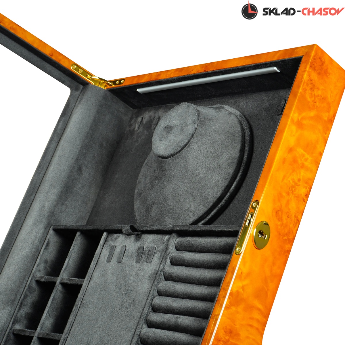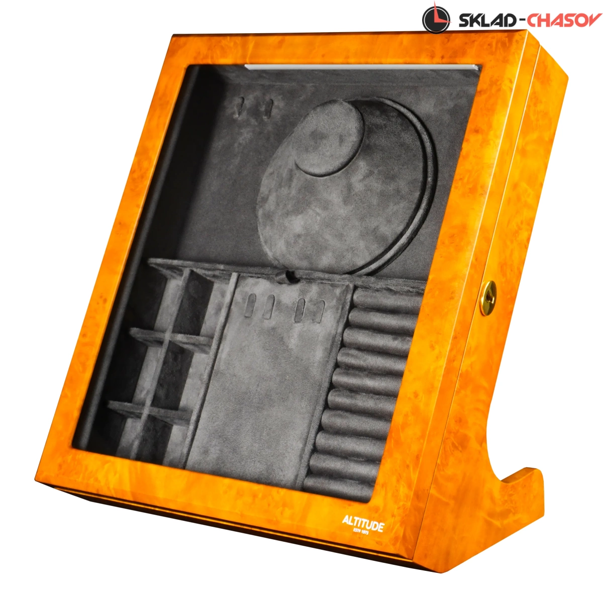 Элегантная шкатулка Altitude YS012-Y создаёт атмосферу уюта и стиля, обеспечивая бережное хранение ваших украшений. Шкатулка для украшений Altitude YS012-Y выполнена в глянцевом янтарном дереве Амбойна. Её вертикальная форма с наклоном и стеклянной крышкой делает изделие не только практичным, но и выразительным элементом интерьера. Прочная стеклянная крышка закрывается на ключ, защищая содержимое от пыли и постороннего доступа. Внутри — мягкая велюровая отделка в тёмно-сером цвете и тщательно продуманная организация: 6 ячеек для мелких украшений (серьги, подвески), секцию с крючками для цепочек и ожерелий, центральное отделение с крышкой для хранения колье, отдел для колец и запонок с мягкими валиками. В верхней части встроена автоматическая LED-подсветка, которая срабатывает при открытии крышки и красиво подсвечивает украшения внутри. Питание подсветки возможно как от сети 220В, так и от