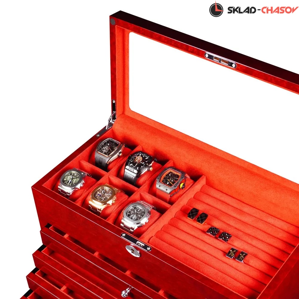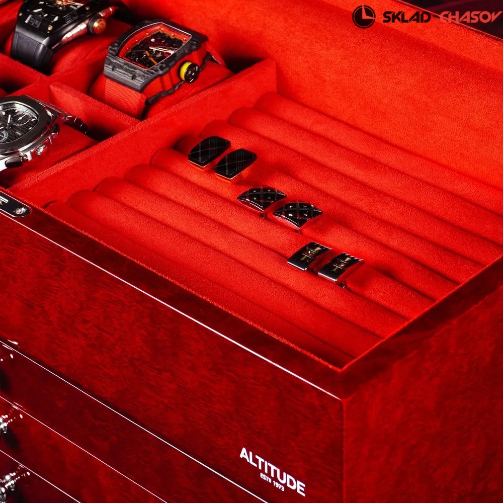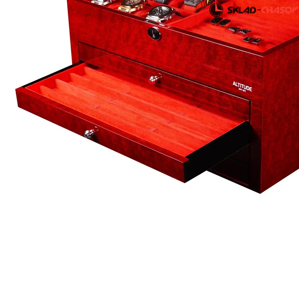 Верхнее отделение вмещает до 6 часов, размещённых на мягких подушках, и включает боковые секции для хранения браслетов, цепочек, зажимов и мелких аксессуаров. Внутреннее оформление выполнено в насыщенном красном велюре, который создаёт тёплый визуальный акцент и бережно оберегает изделия от повреждений.