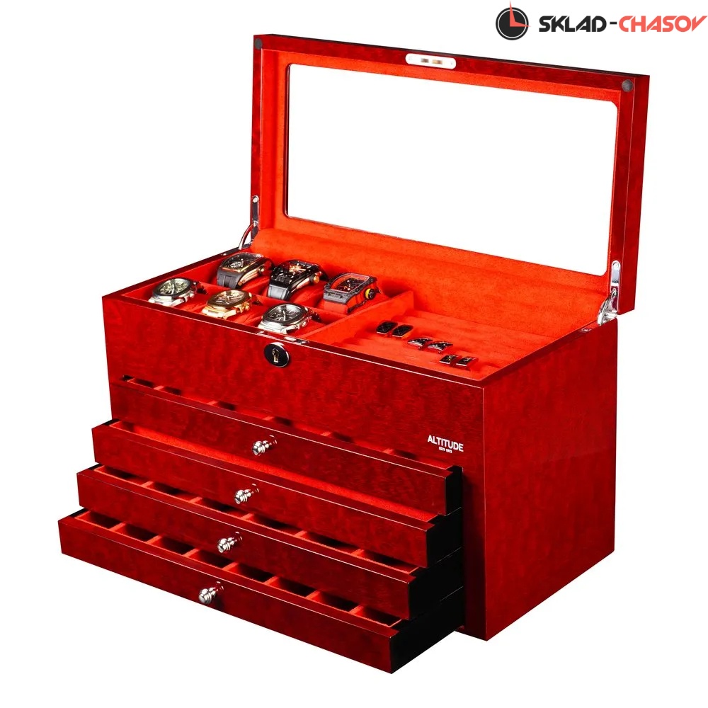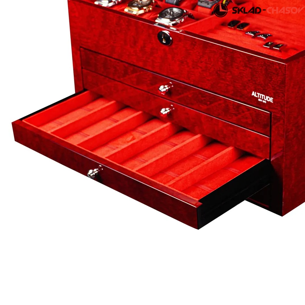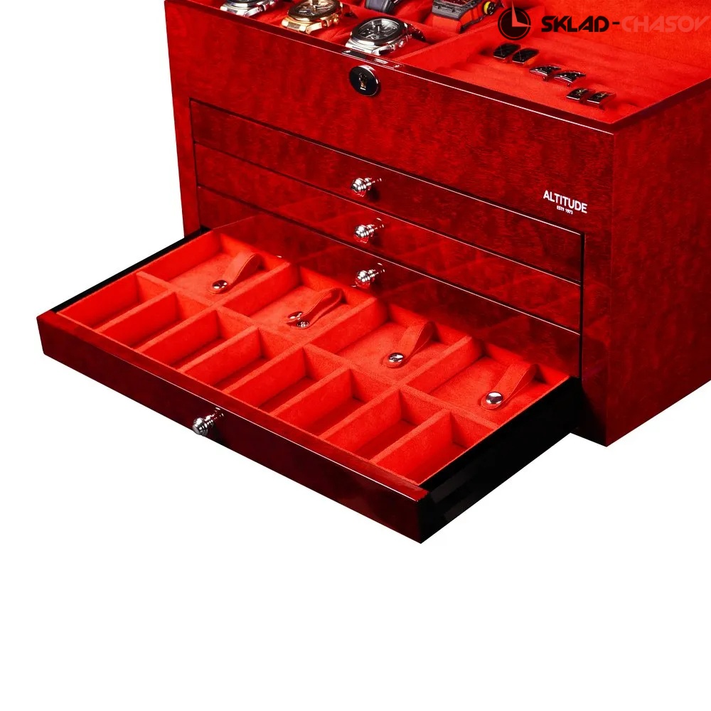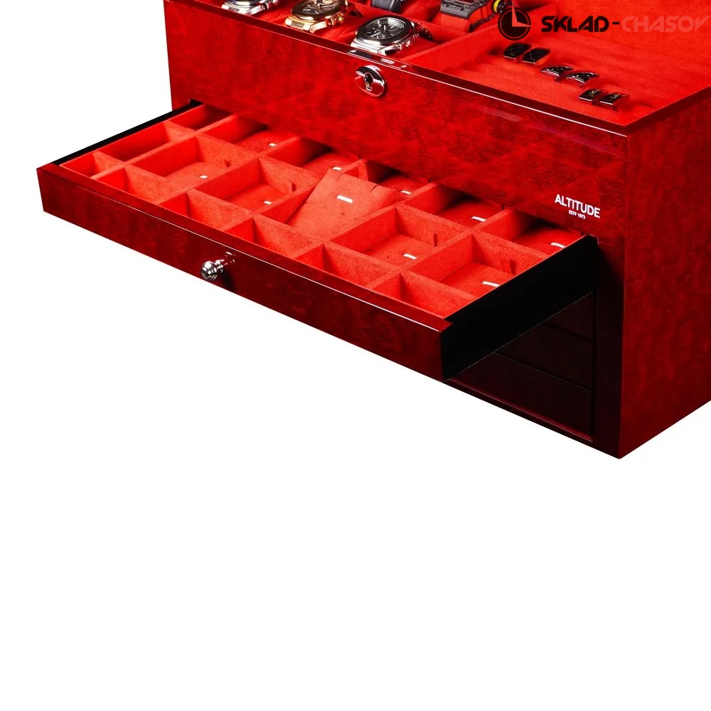 Верхнее отделение вмещает до 6 часов, размещённых на мягких подушках, и включает боковые секции для хранения браслетов, цепочек, зажимов и мелких аксессуаров. Внутреннее оформление выполнено в насыщенном красном велюре, который создаёт тёплый визуальный акцент и бережно оберегает изделия от повреждений.