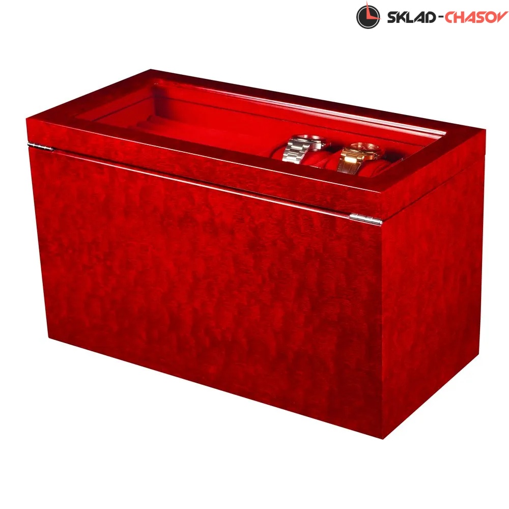 Корпус изготовлен из природного красного тополя с уникальной текстурой и покрыт глянцевым лаком, подчёркивающим благородную игру древесных волокон. Крышка оснащена прозрачной вставкой, через которую можно с восхищением наблюдать за коллекцией часов, не открывая шкатулку.