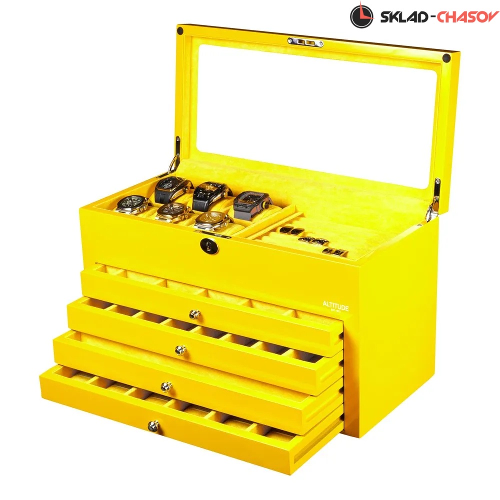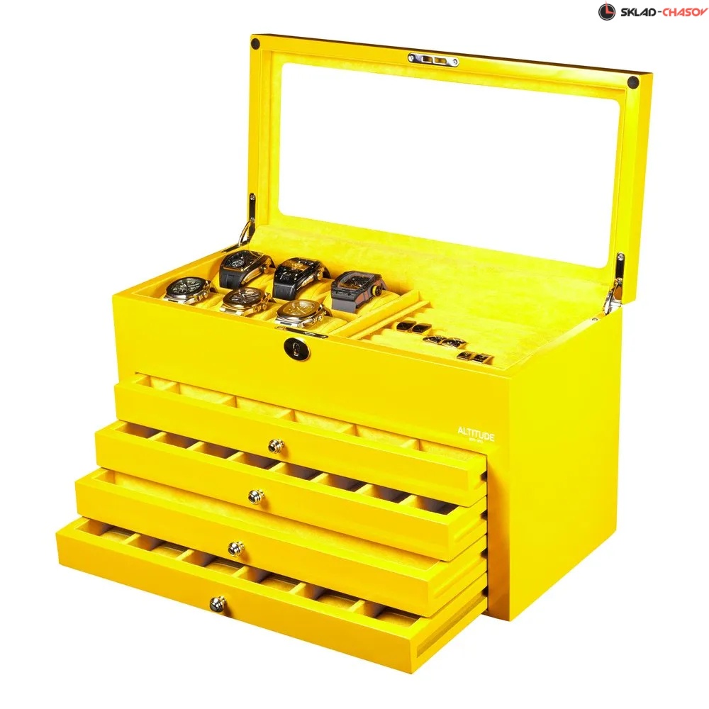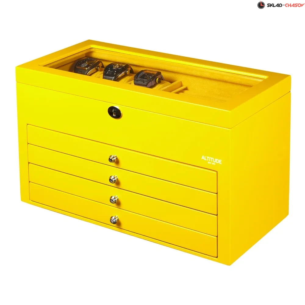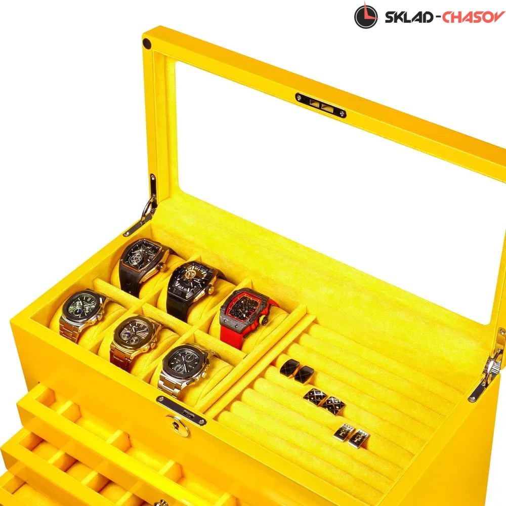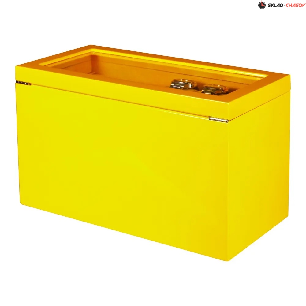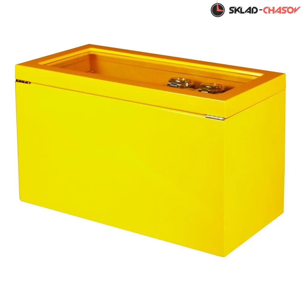 Корпус выполнен из дерева и покрыт гладким жёлтым лаком насыщенного оттенка с глянцевой поверхностью. Такая отделка делает шкатулку выразительным акцентом в современном интерьере. Крышка оснащена прозрачной вставкой, которая позволяет наслаждаться видом коллекции часов, не открывая изделие.