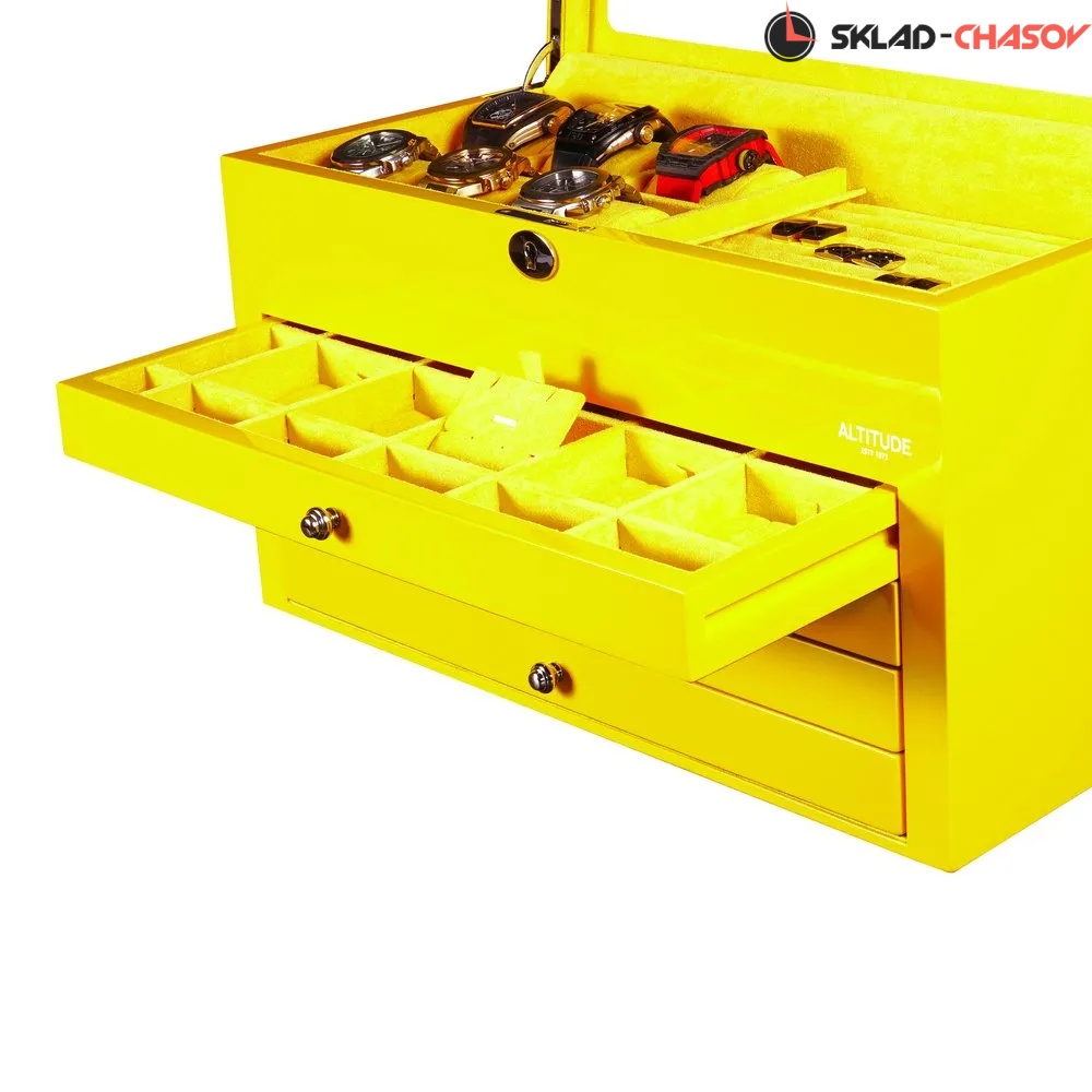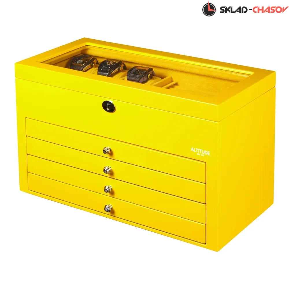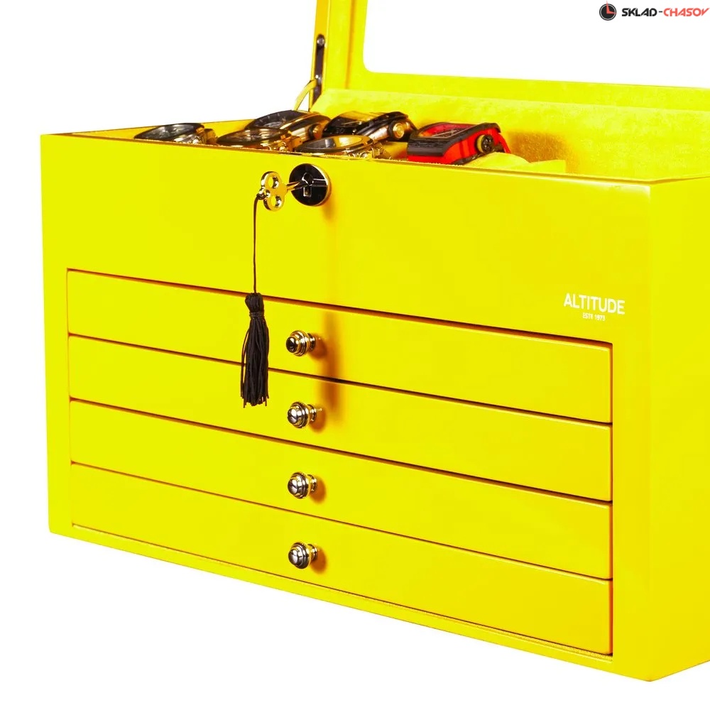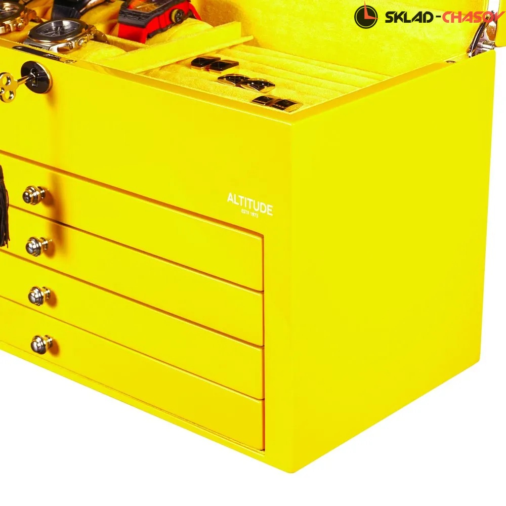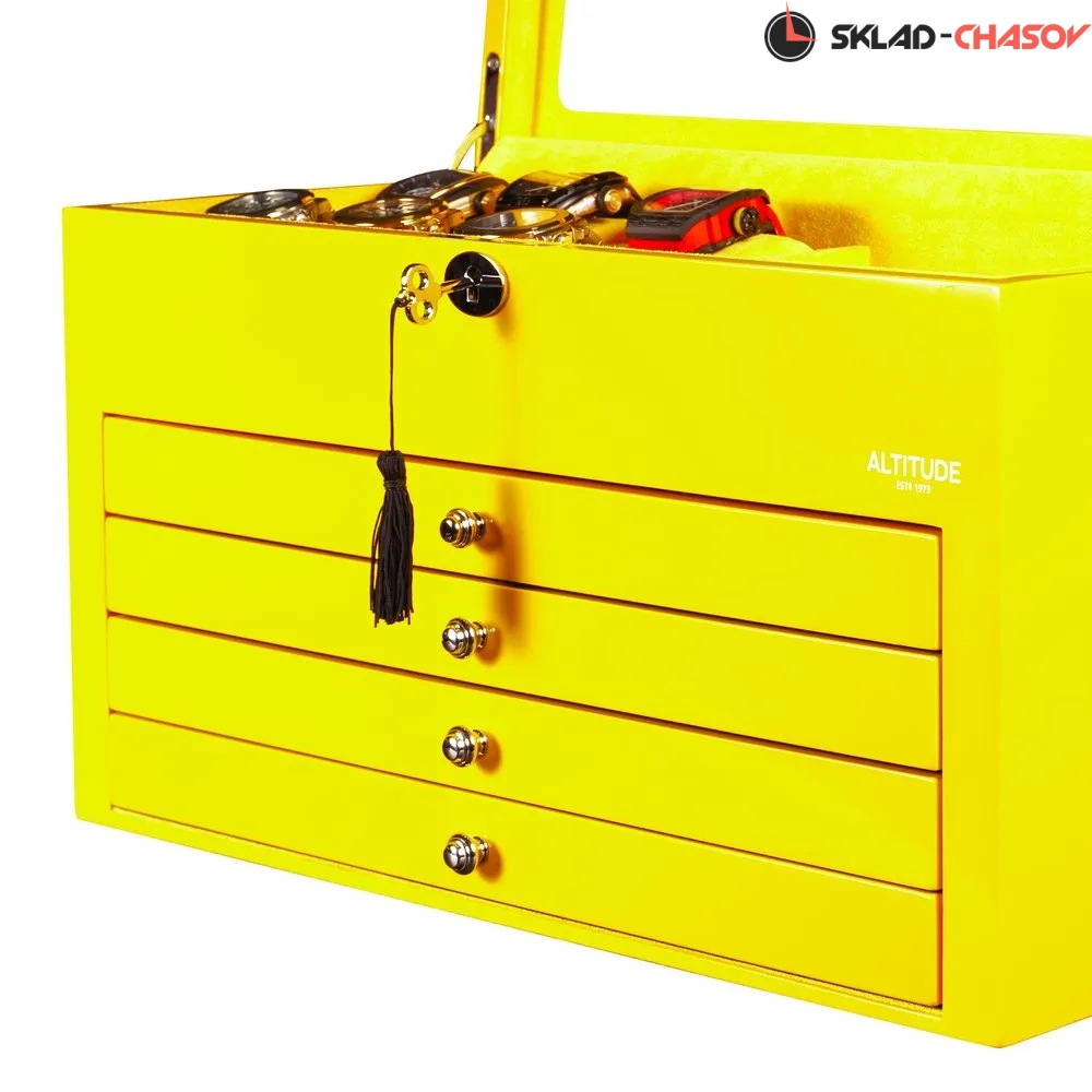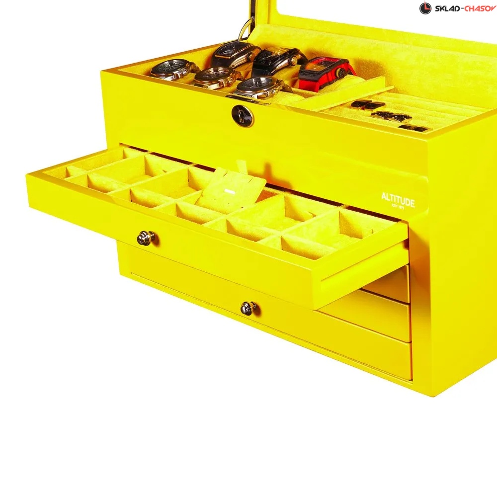 Корпус выполнен из дерева и покрыт гладким жёлтым лаком насыщенного оттенка с глянцевой поверхностью. Такая отделка делает шкатулку выразительным акцентом в современном интерьере. Крышка оснащена прозрачной вставкой, которая позволяет наслаждаться видом коллекции часов, не открывая изделие.