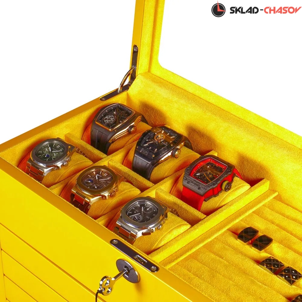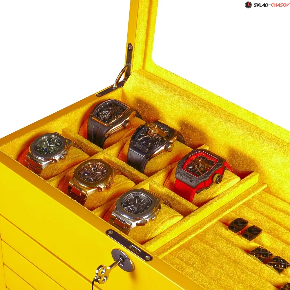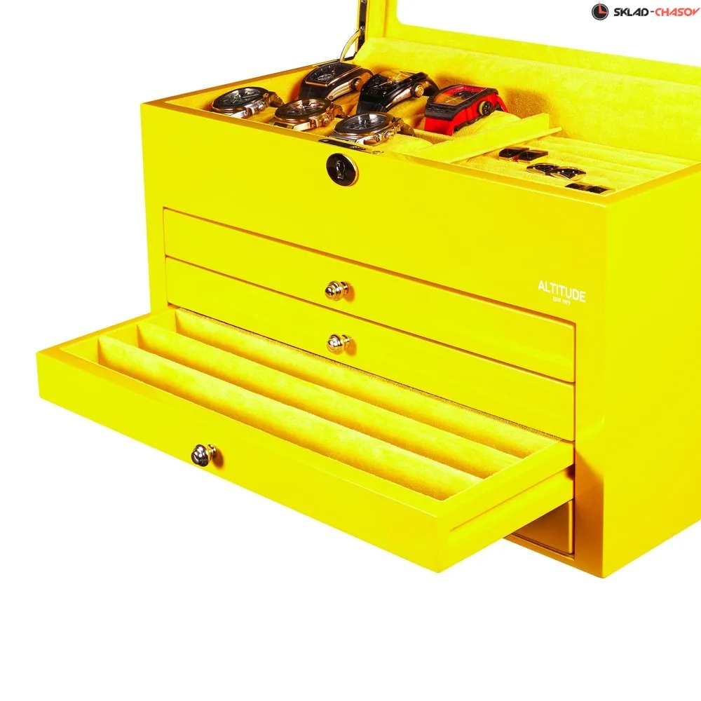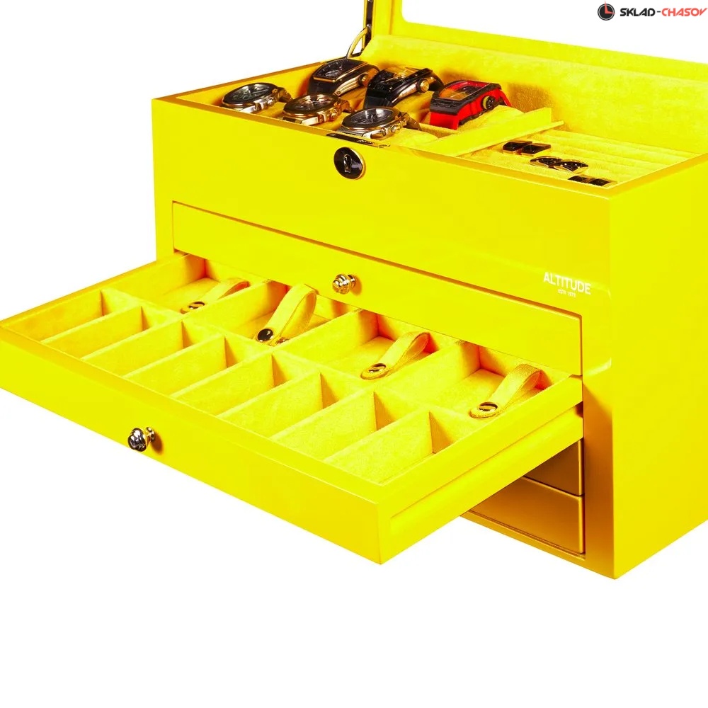 Верхнее отделение предназначено для хранения до 6 часов, уложенных на мягкие подушечки, и содержит дополнительные секции для украшений, браслетов и зажимов. Внутренняя отделка выполнена в тон корпуса — бархатистый велюр солнечного жёлтого цвета, создающий единую дизайнерскую концепцию и мягко оберегающий аксессуары.