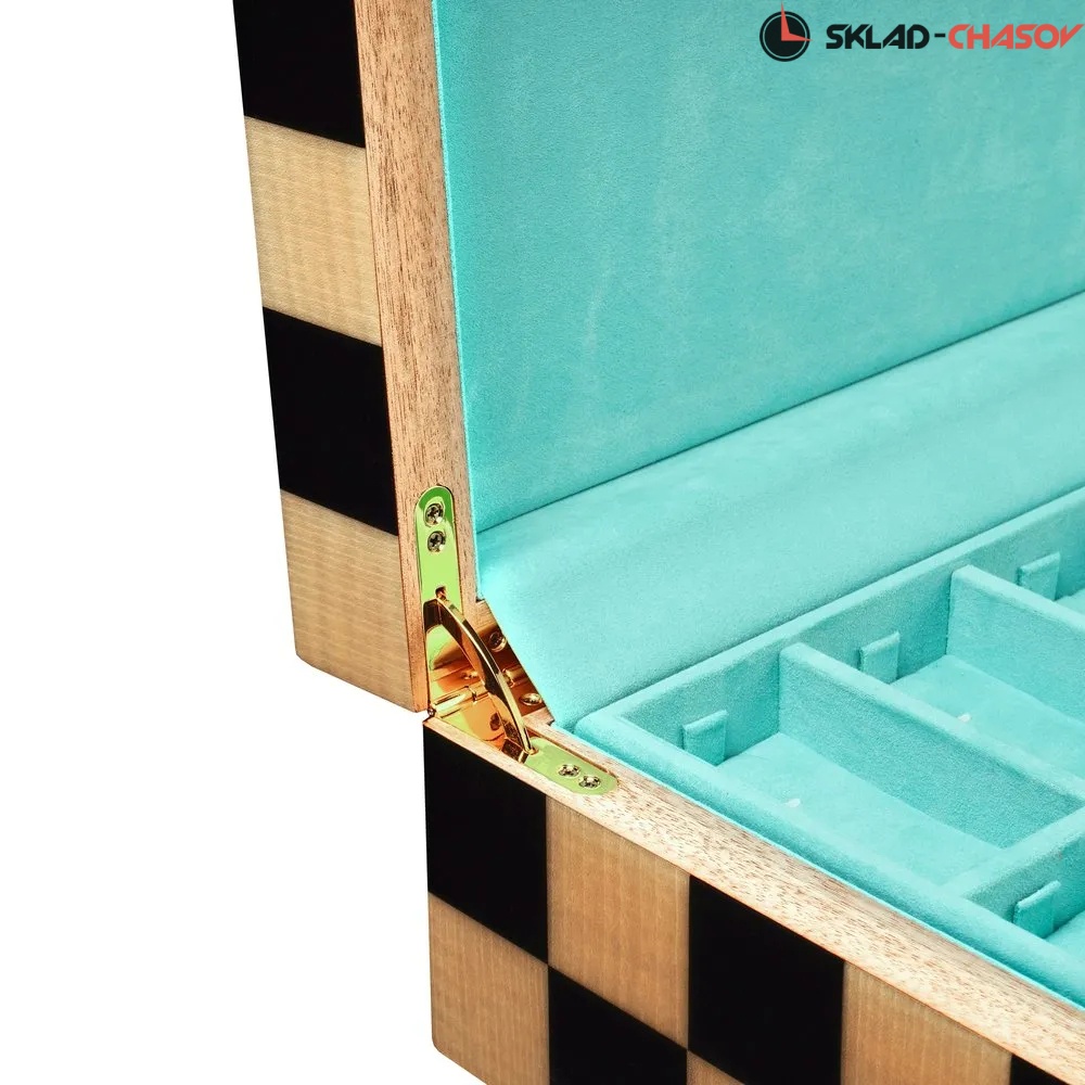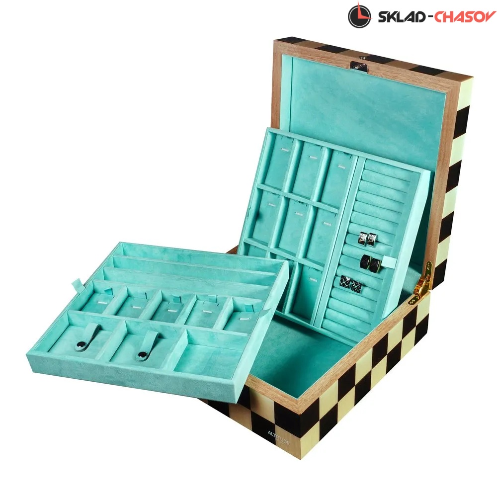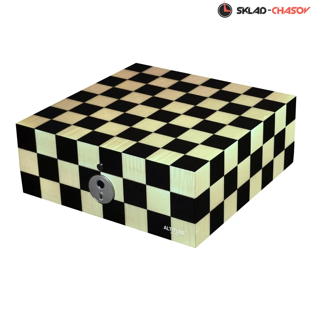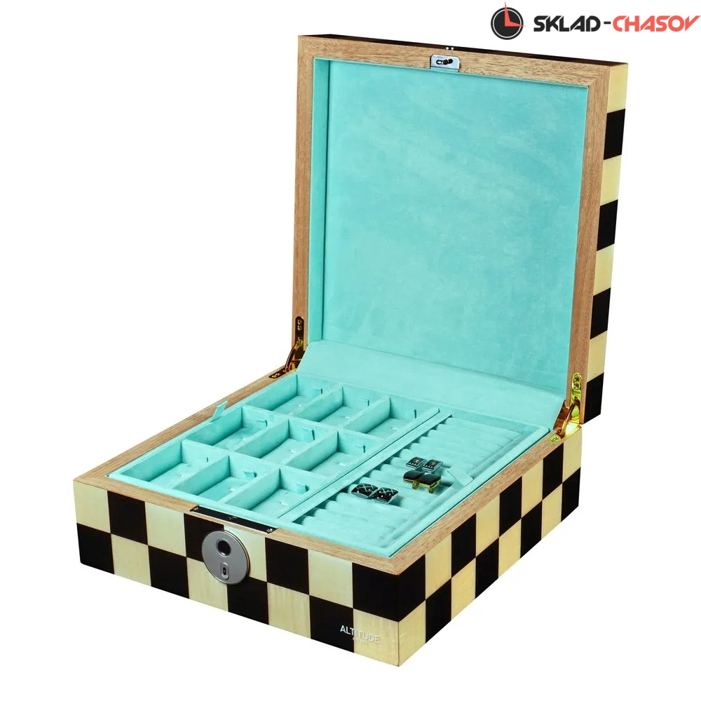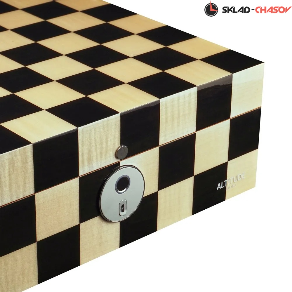 Шкатулка для украшений Altitude Chess — это эффектное сочетание выразительного дизайна и высокой степени безопасности. Корпус выполнен из прочного дерева, покрытого глянцевым лаком с графичным шахматным узором в чёрно-бежевой гамме. Геометрия и симметрия создают визуальную динамику, делая шкатулку ярким интерьерным акцентом.
