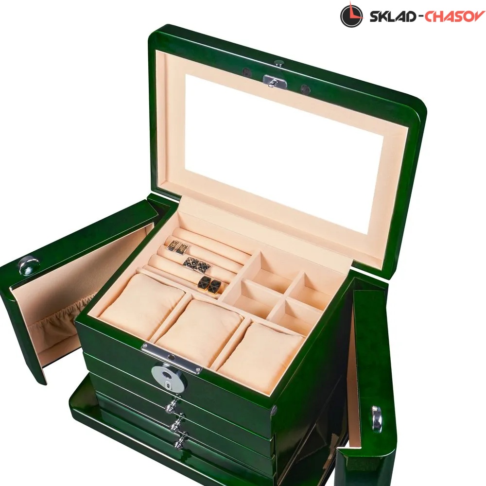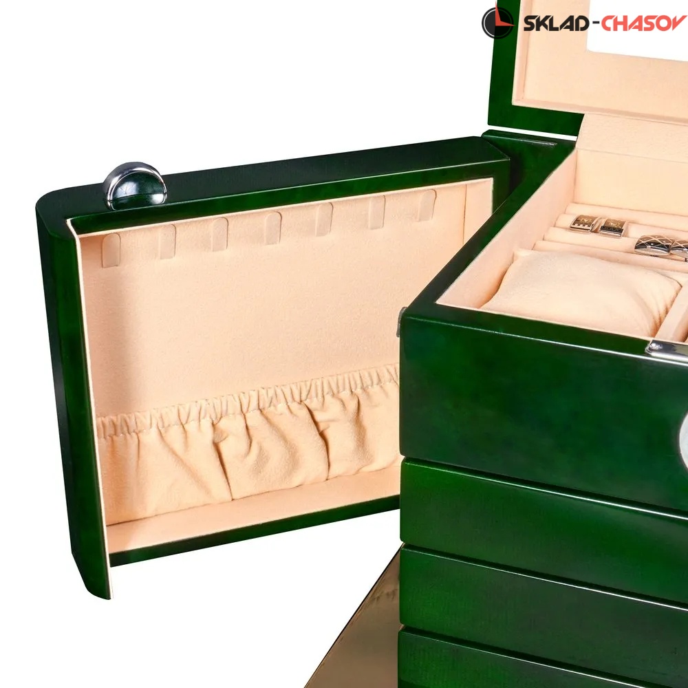 центральным отделением с мягкими подушечками для хранения часов, а также секциями для колец, серёг и запонок;