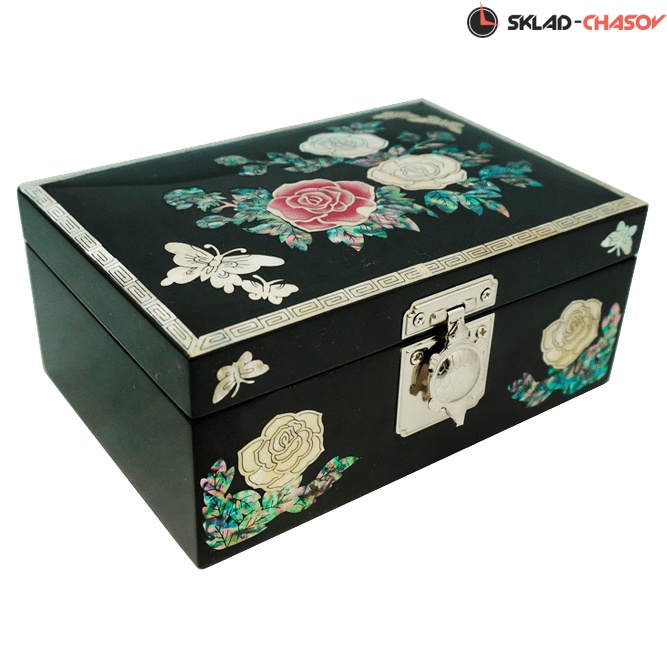 Черная шкатулка «Розы» имеет средние размеры и легко помещается на туалетном столике. Она искусно отделана натуральным перламутром и напоминает старинные корейские предметы декора. Изделие выполнено прославленным мастером О Мён Хо и может стать отличным подарком.