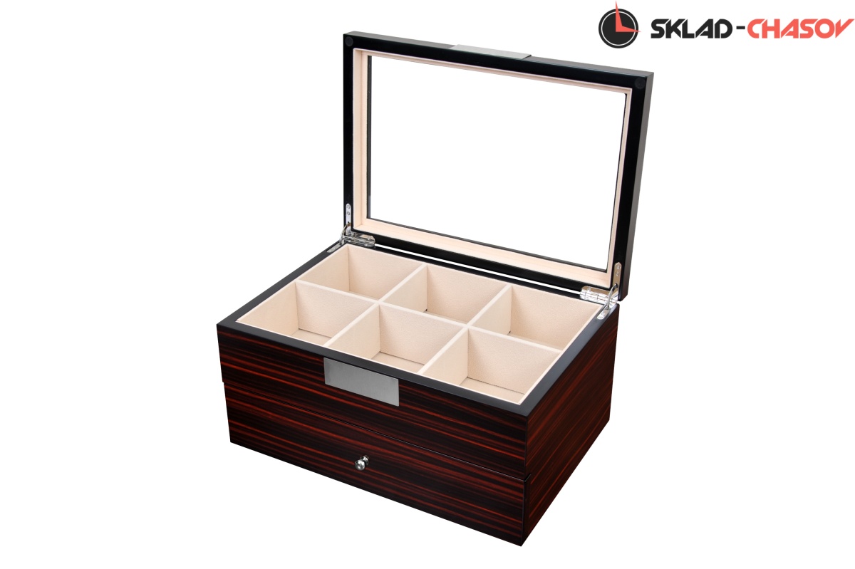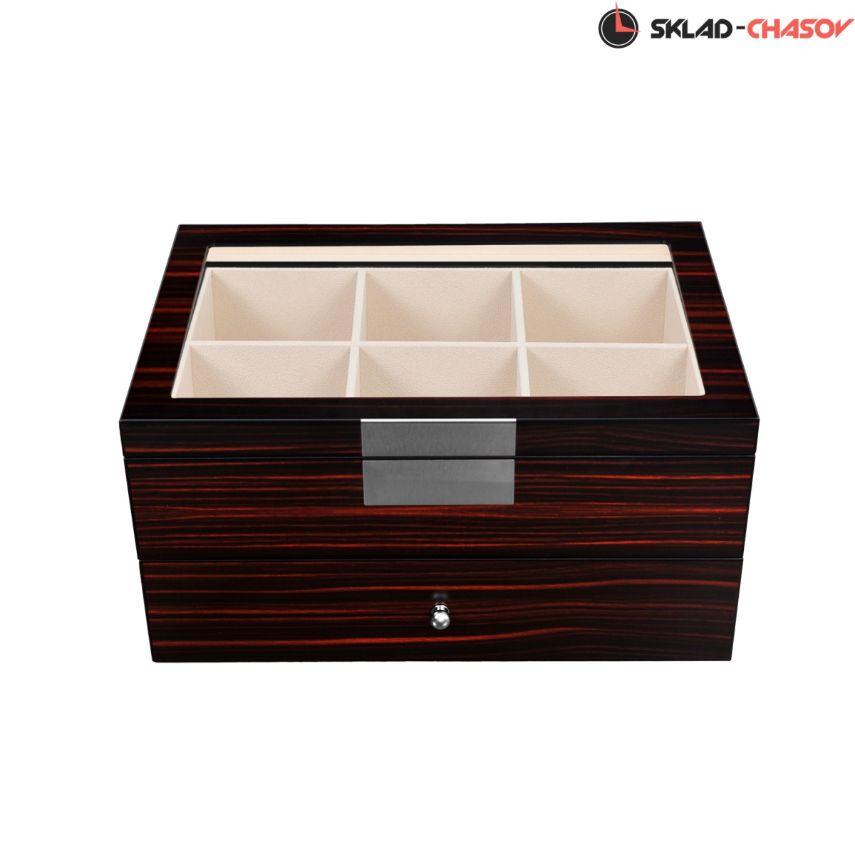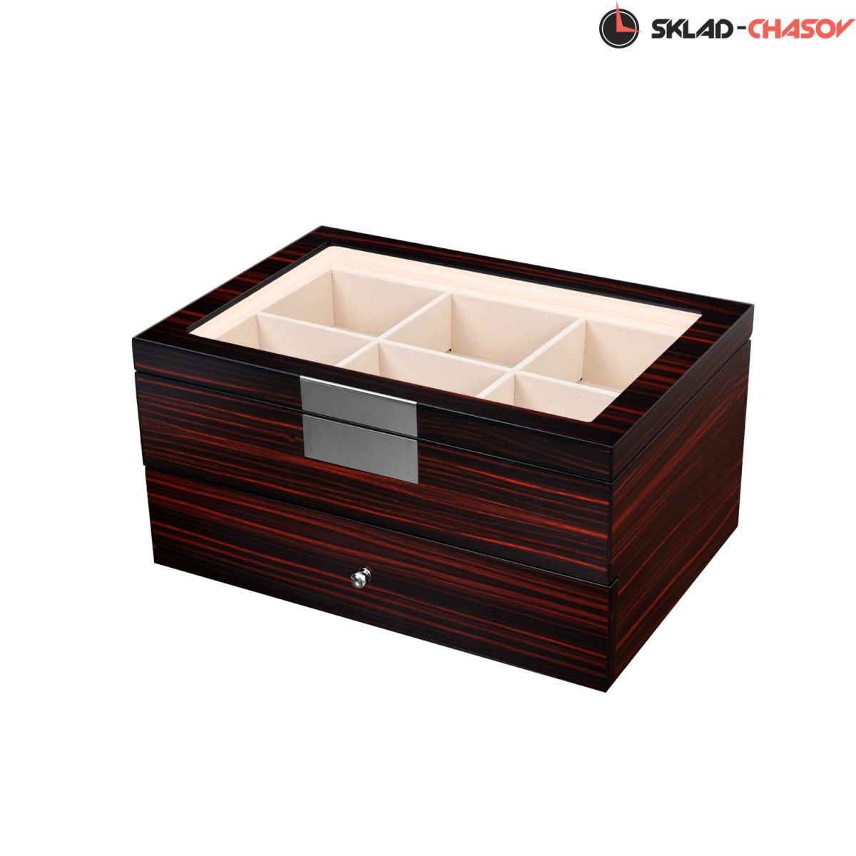 Через стеклянную крышку шкатулки можно любоваться коллекцией из 6-ти галстуков, а еще 6-ть можно хранить в выдвижном ящике. Исполнение экстерьера в дереве Макассар является новизной, а покрытие множественными слоями высококачественного матового лака придает изящность.