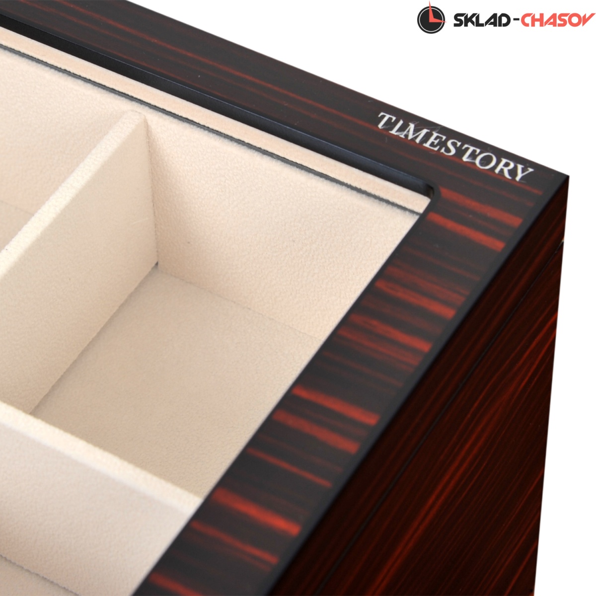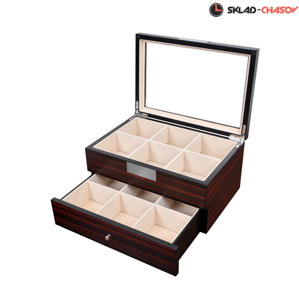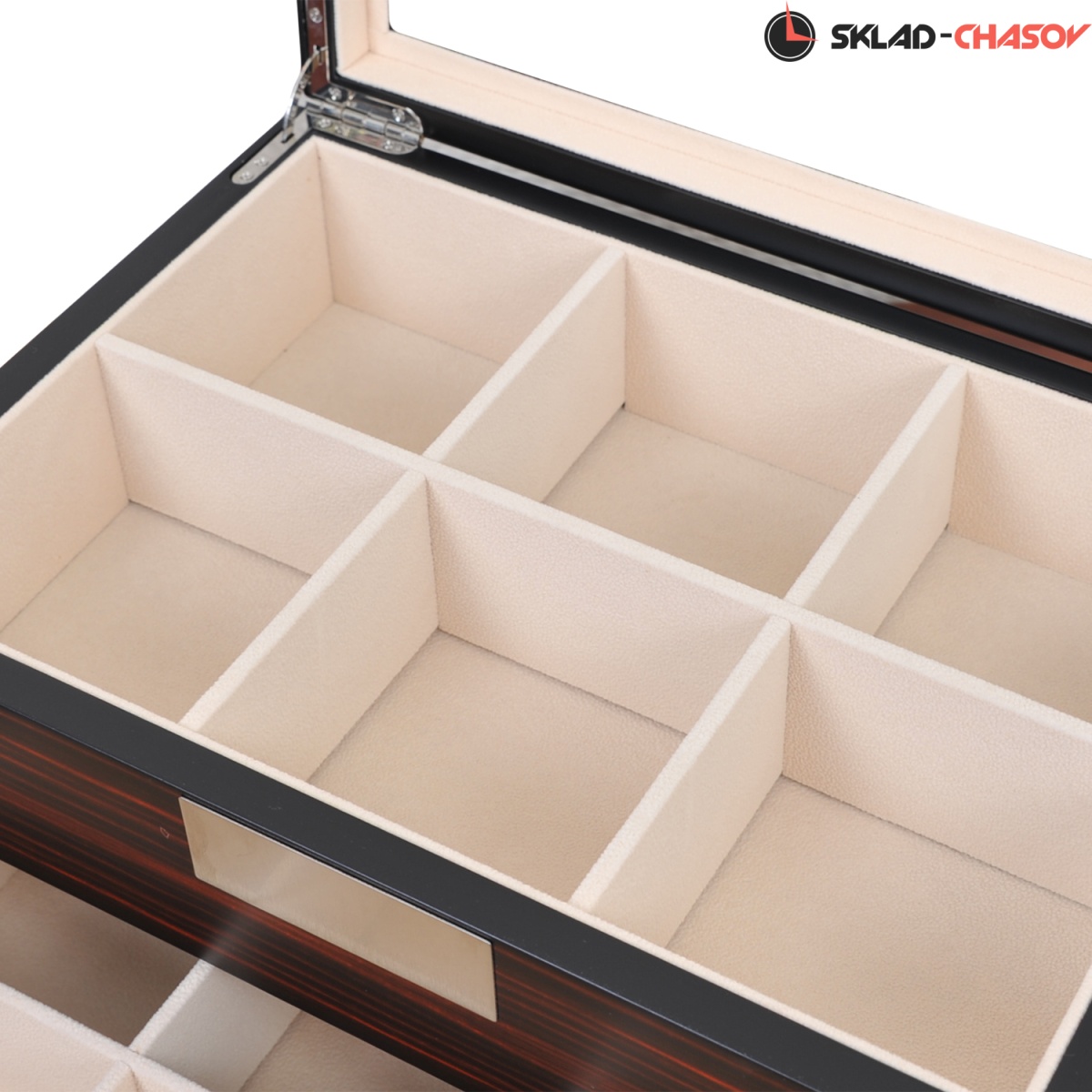 Через стеклянную крышку шкатулки можно любоваться коллекцией из 6-ти галстуков, а еще 6-ть можно хранить в выдвижном ящике. Исполнение экстерьера в дереве Макассар является новизной, а покрытие множественными слоями высококачественного матового лака придает изящность.