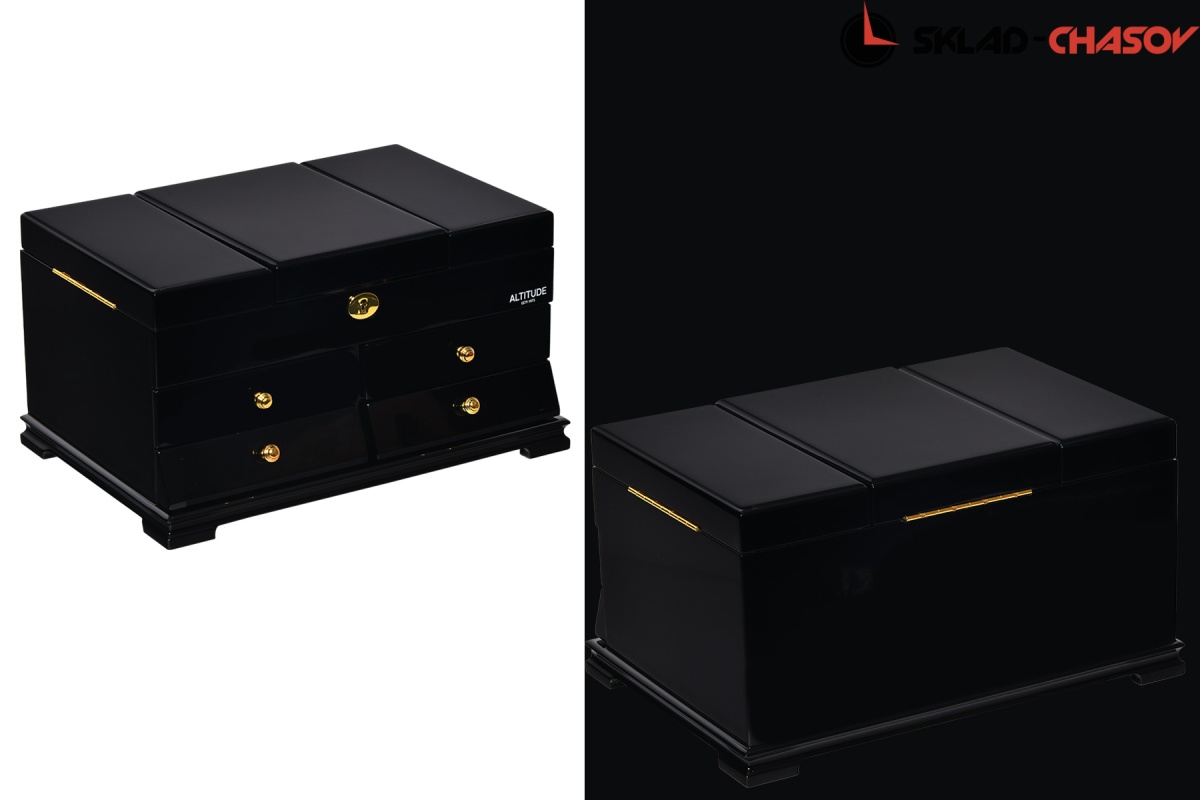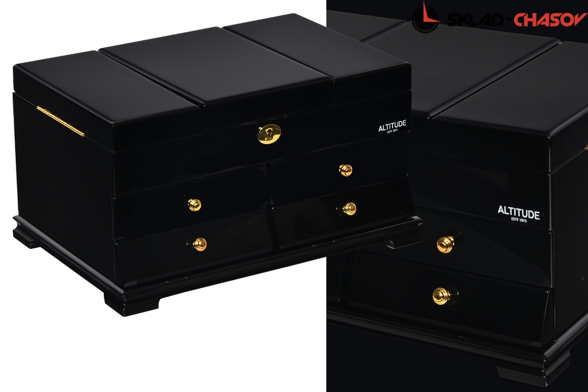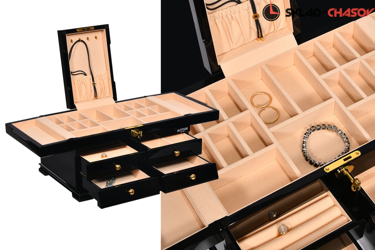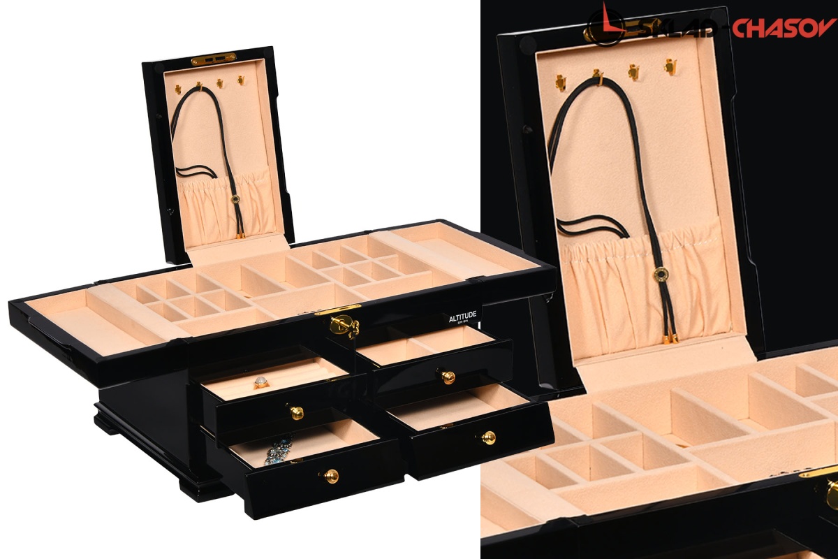 Model Elite. Выполнена из чёрного полированного дерева венге, внутри обшита светлой тканью, множество вариантов хранения ваших ювелирных украшений, а также 4 ящичка для доп хранения. Современная система открытия с помощью ключика. Красивая и стильная модель Elite приятно впишется в любой интерьер квартиры или загородного дома.