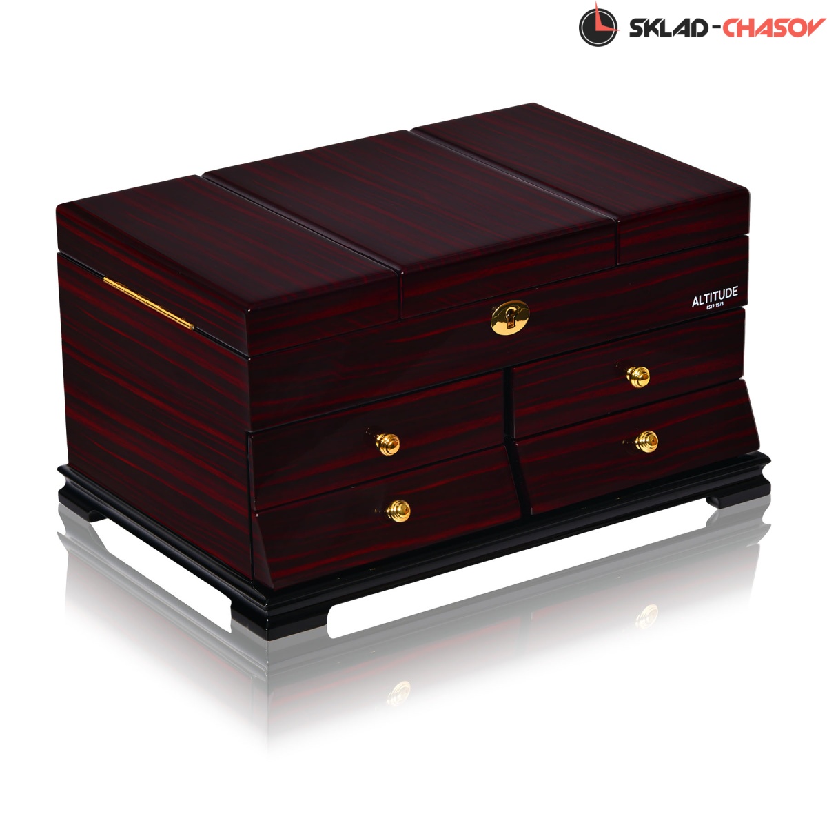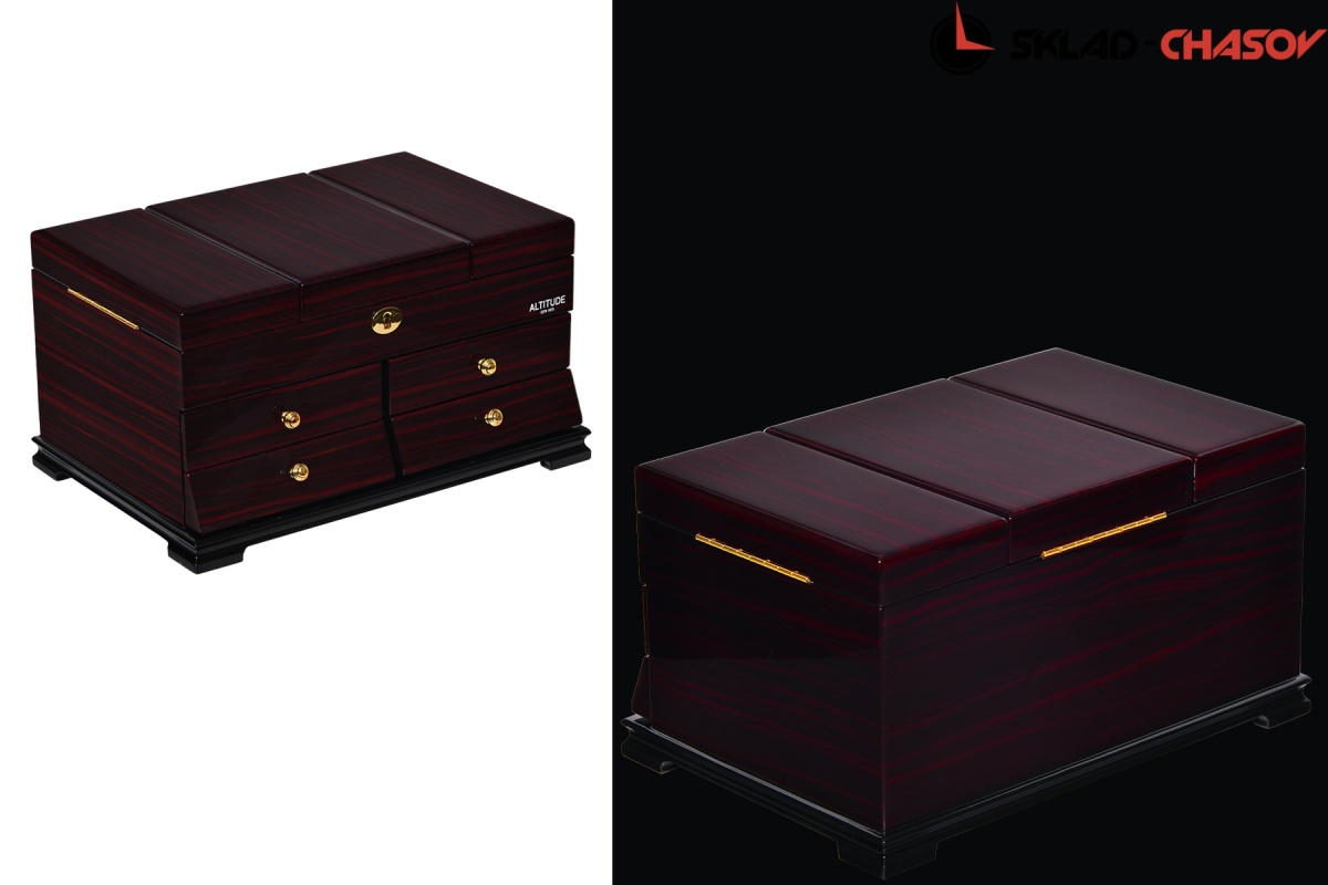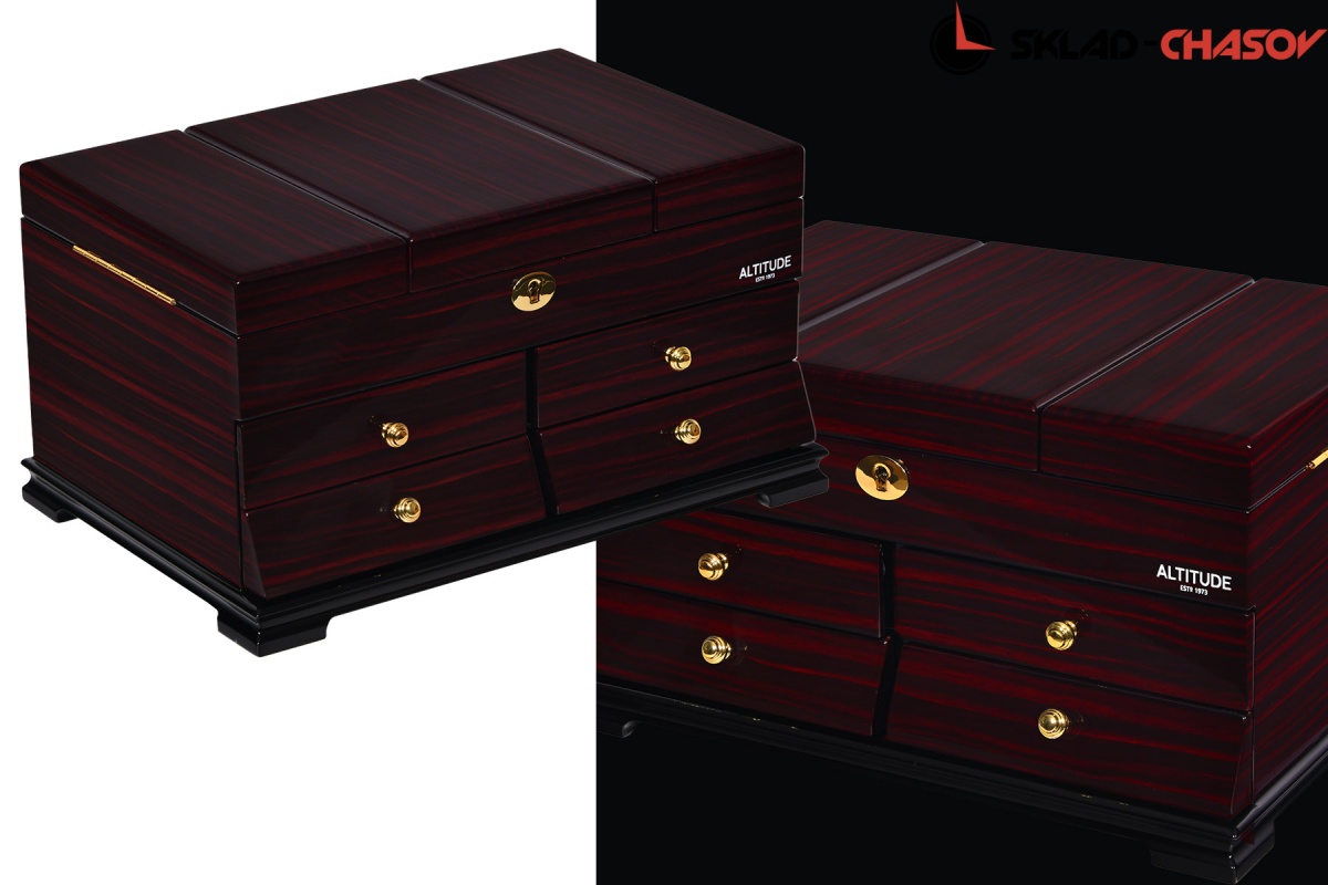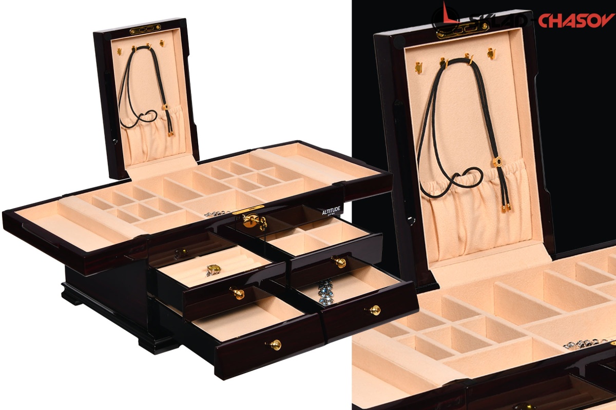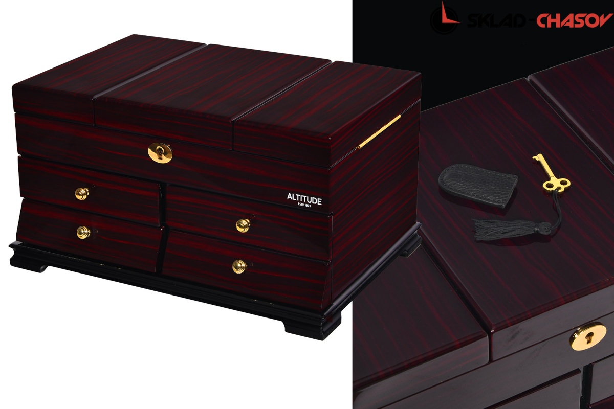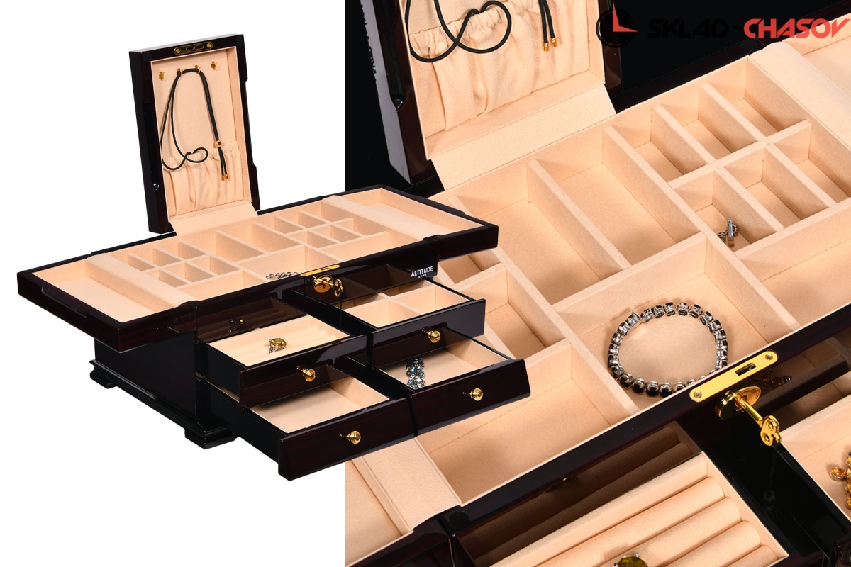Model Elite. Выполнена из коричневого полированного дерева макасар, внутри обшита светлой тканью, множество вариантов хранения ваших ювелирных украшений, а также 4 ящичка для доп хранения. Современная система открытия с помощью ключика. Красивая и стильная модель Elite приятно впишется в любой интерьер квартиры или загородного дома.