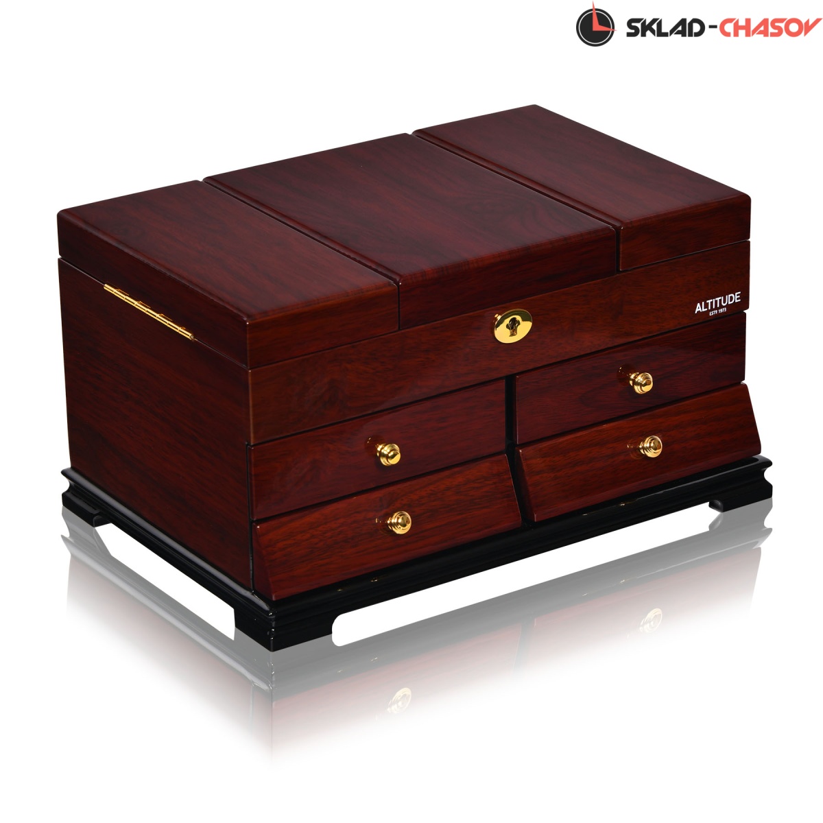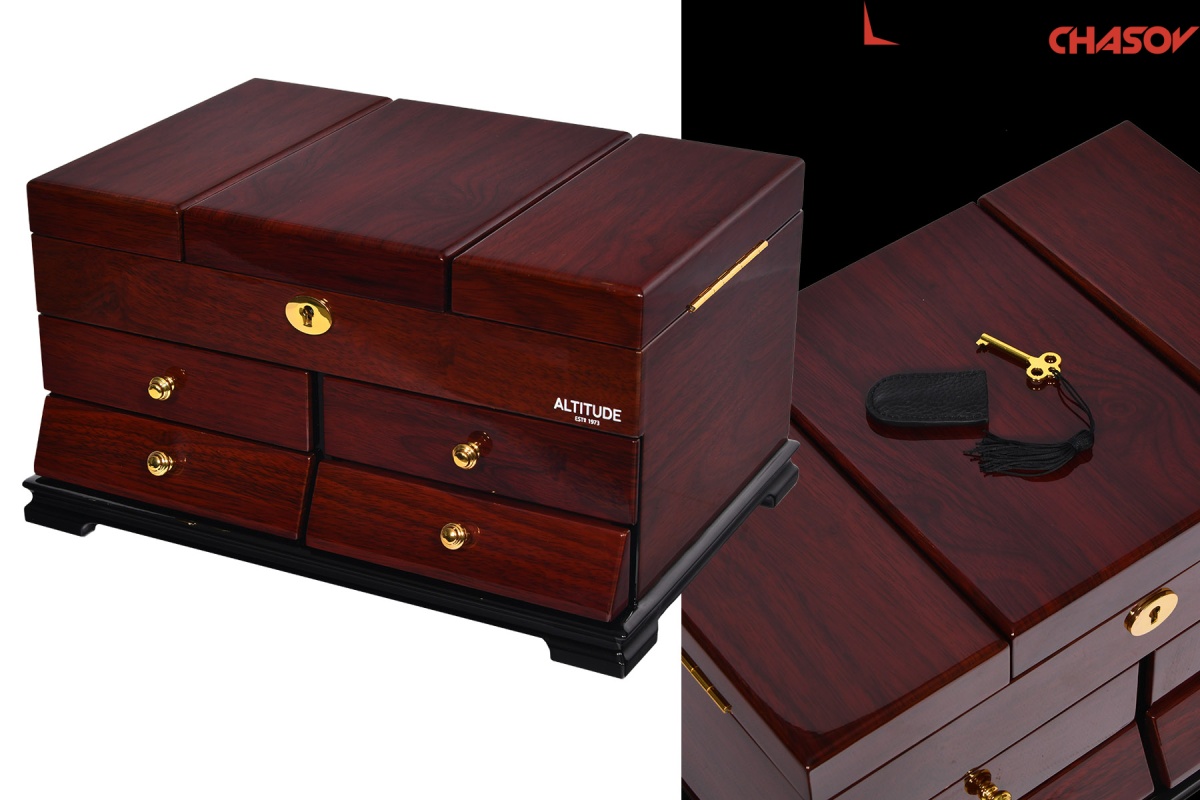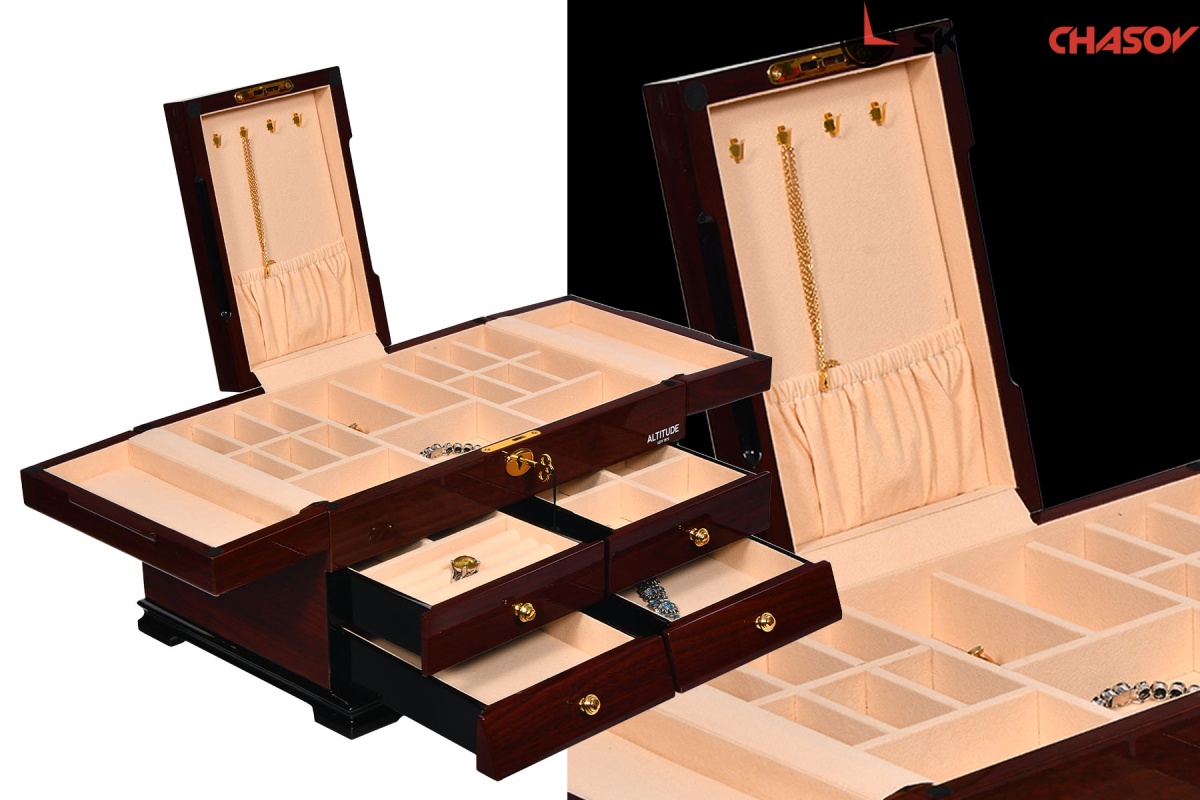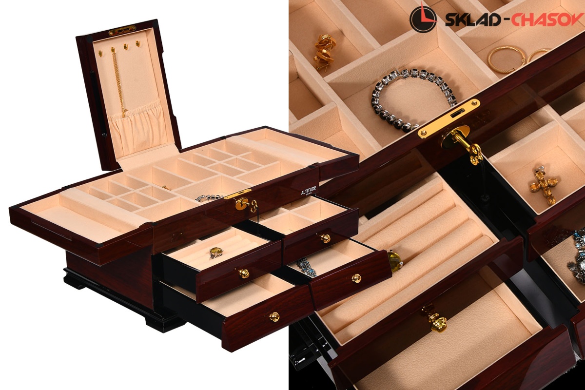 Model Elite. Выполнена из коричневого полированного дерева тополь, внутри обшита светлой тканью, множество вариантов хранения ваших ювелирных украшений, а также 4 ящичка для доп хранения. Современная система открытия с помощью ключика. Красивая и стильная модель Elite приятно впишется в любой интерьер квартиры или загородного дома.