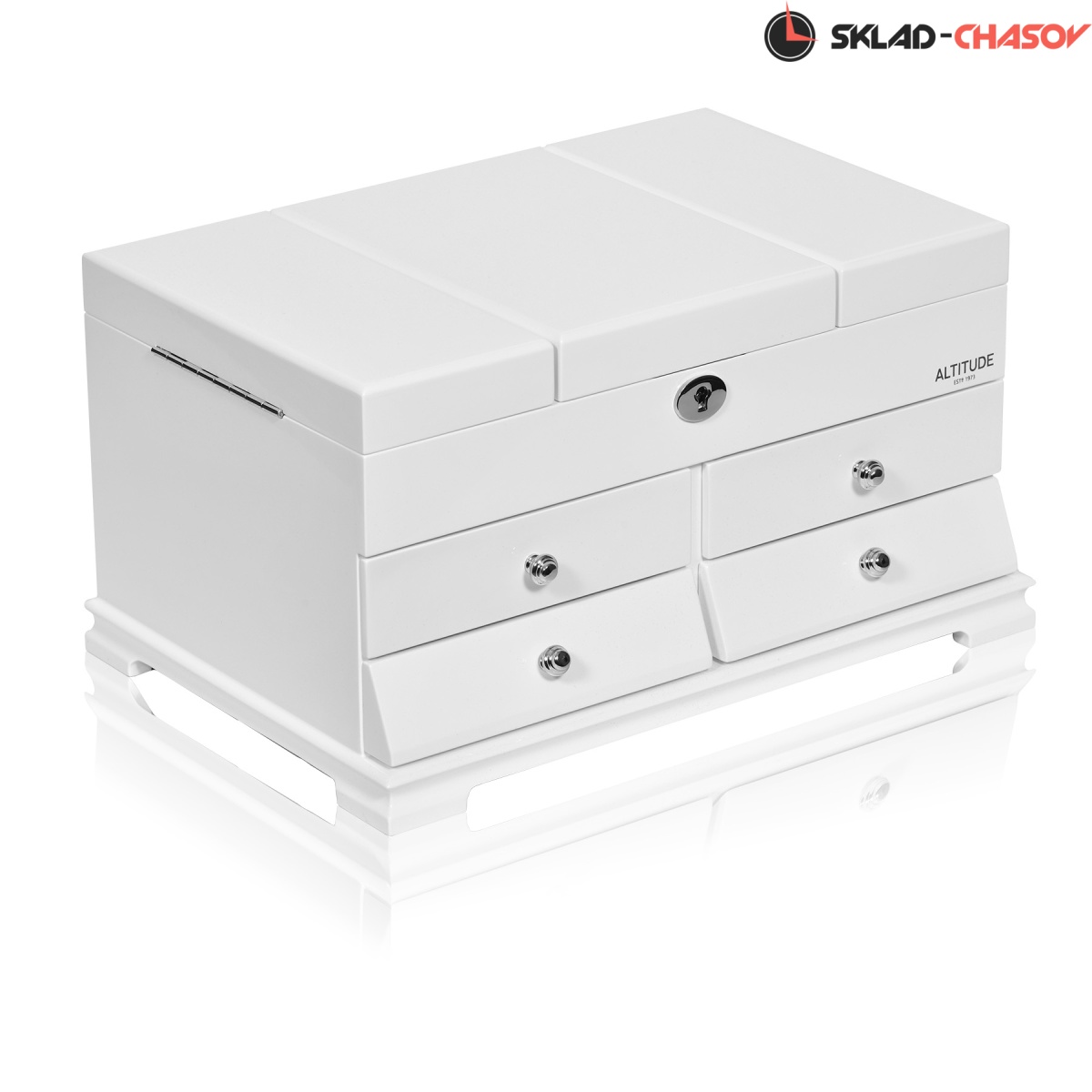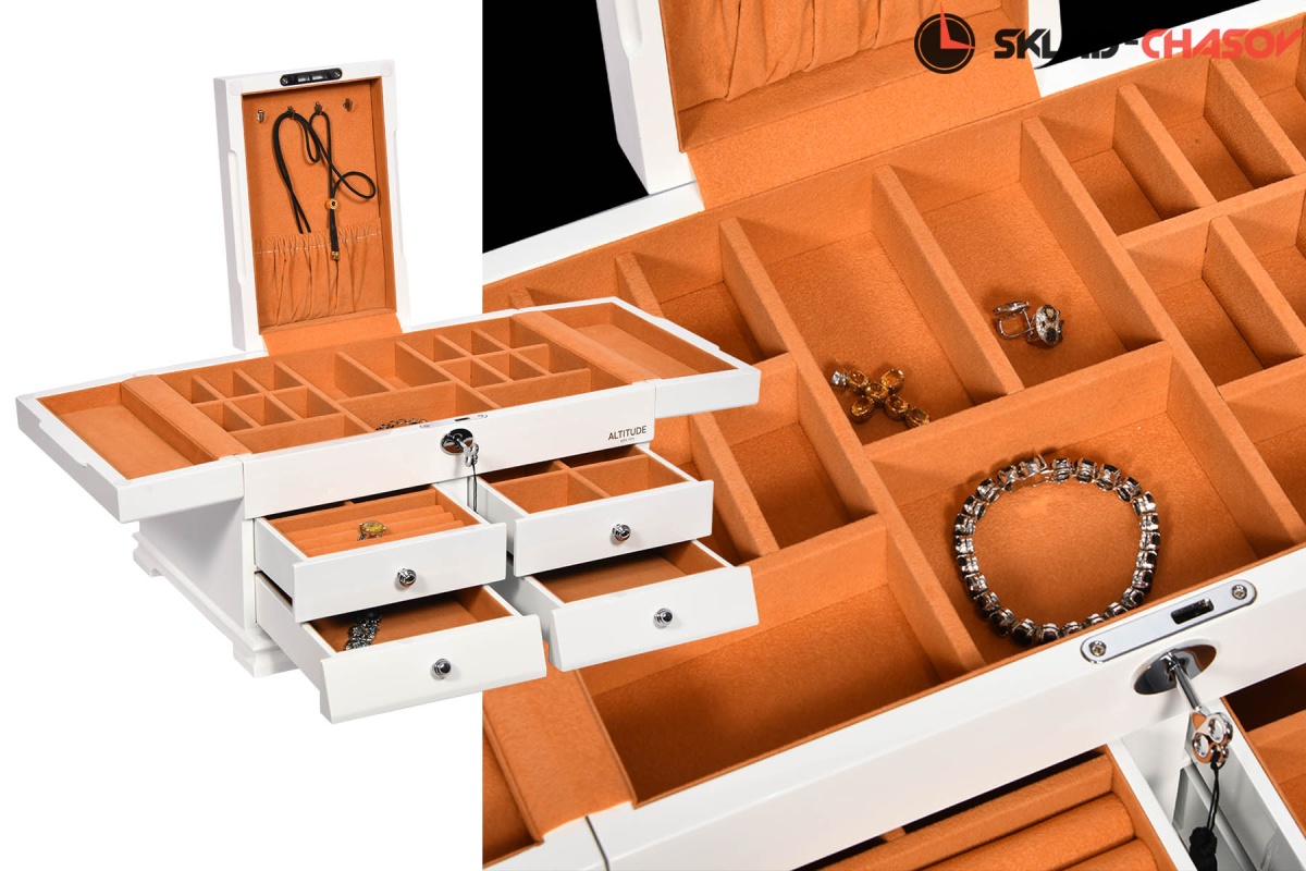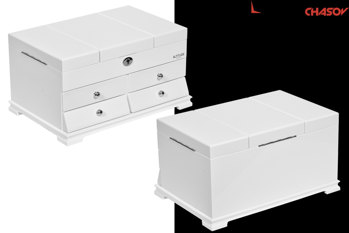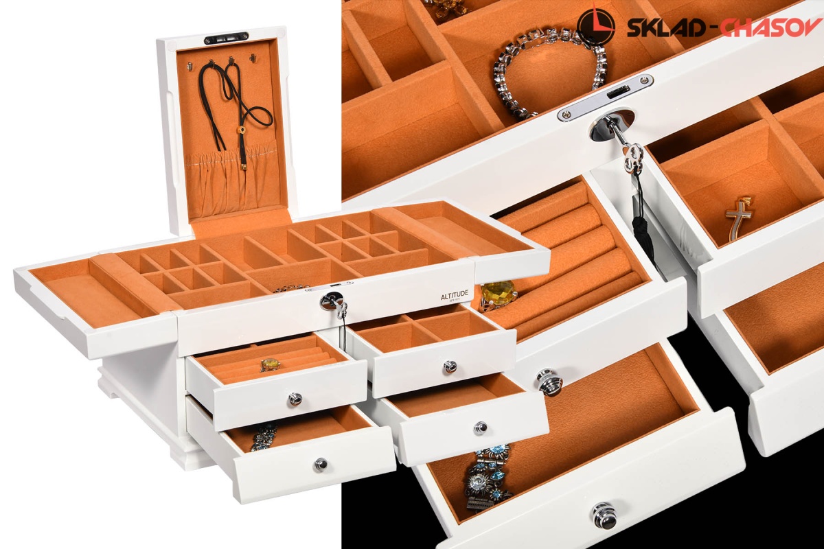 Model Elite. Выполнена из белого полированного дерева тополь, внутри обшита светло-коричневой тканью, множество вариантов хранения ваших ювелирных украшений, а также 4 ящичка для доп хранения. Современная система открытия с помощью ключика. Красивая и стильная модель Elite приятно впишется в любой интерьер квартиры или загородного дома.