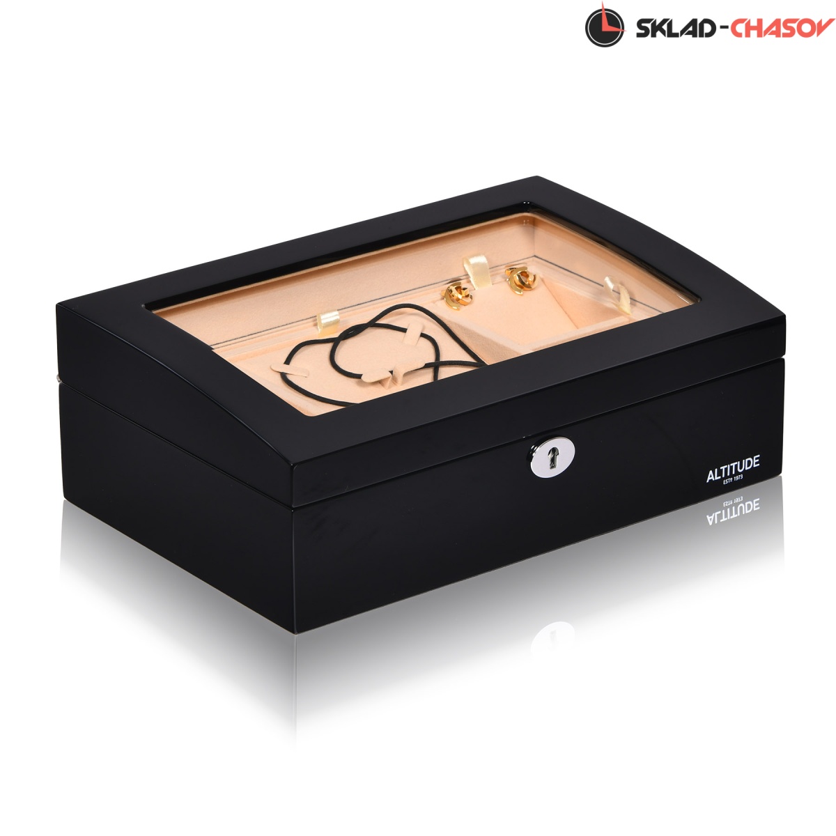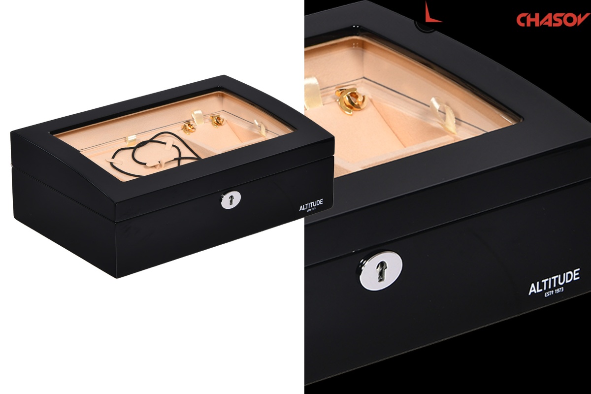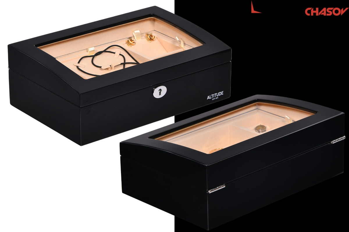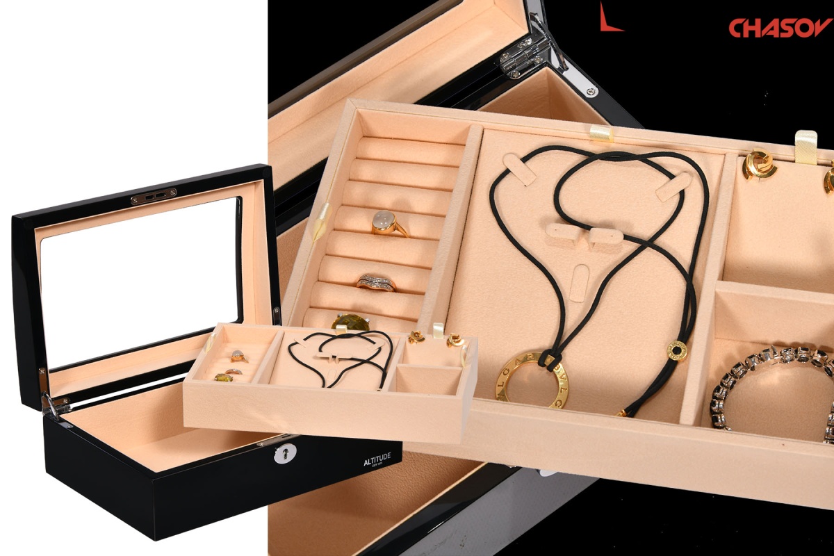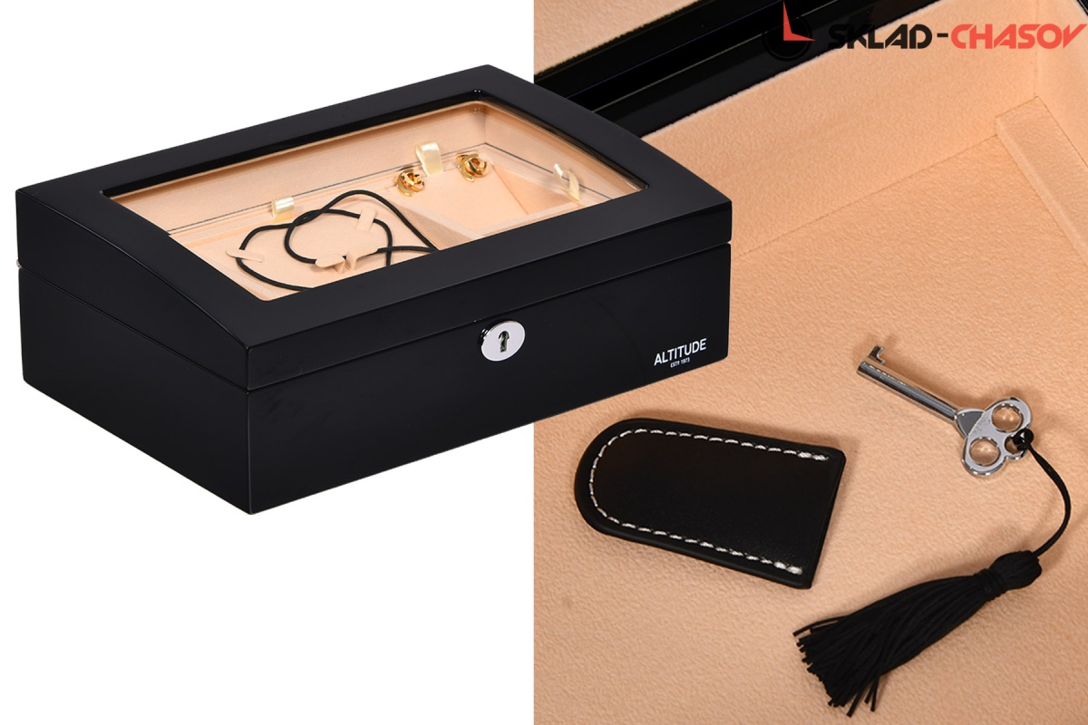 Модель «Crown». Новая, среднего размера полноценно удобная шкатулочка для украшений выполнена в чёрном лакированном дереве «тополь», внутри выстлано светлой тканью (можно чистить щеточкой), множество отделений для разных украшений, прозрачное внешнее стёклышко, закрывается на ключик (хранение в кожаном чехольчике).