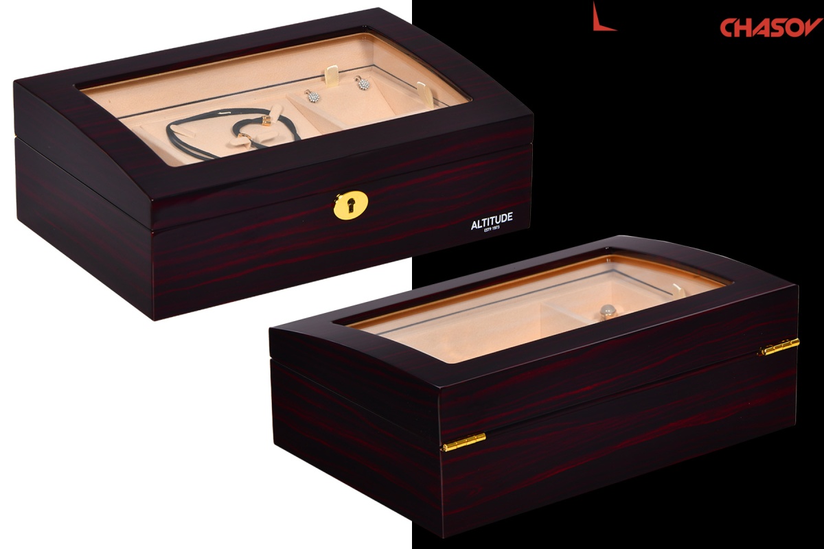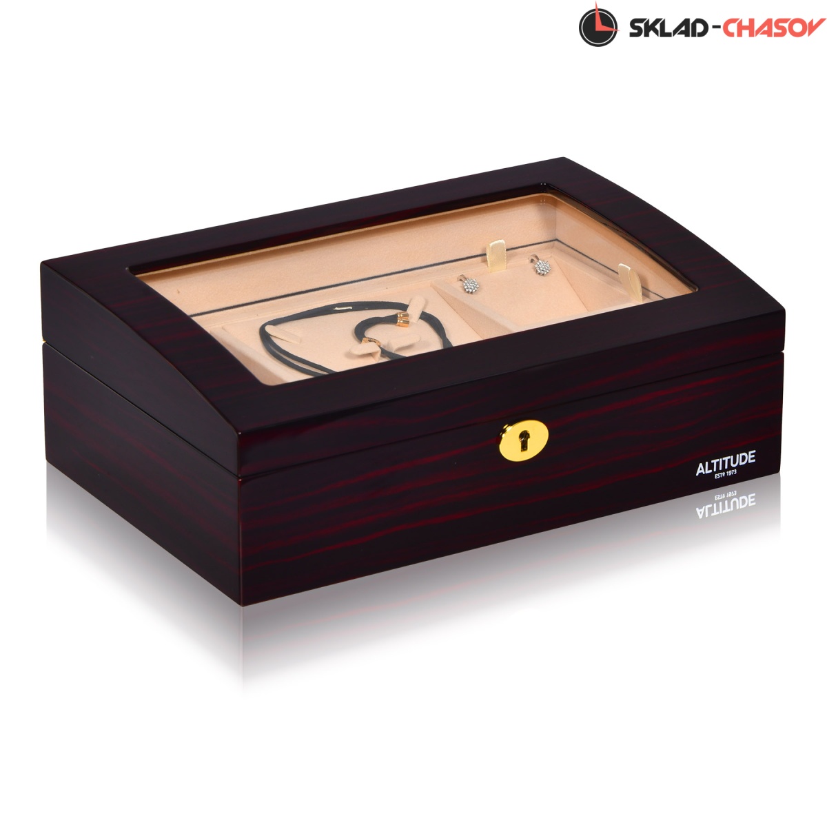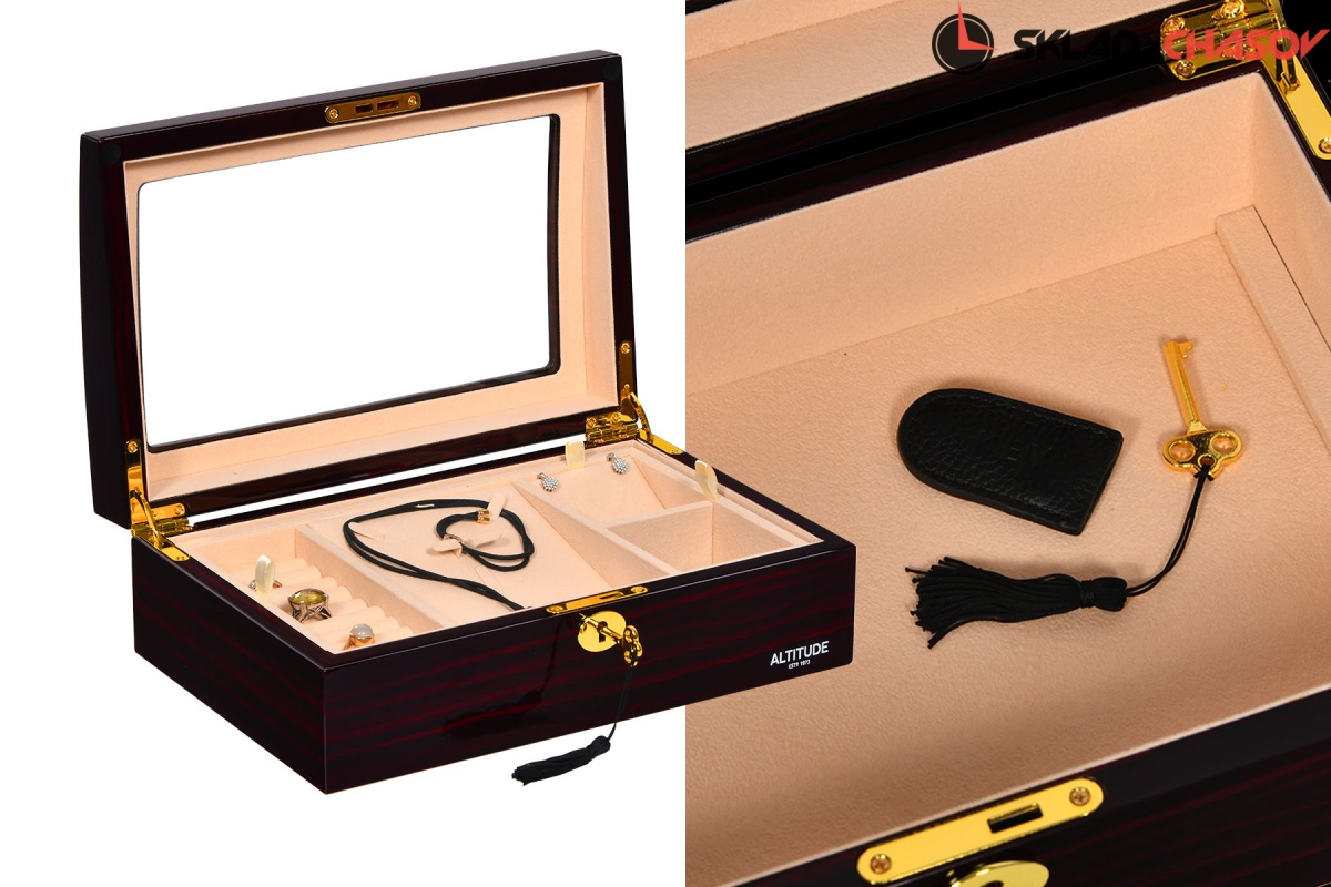 Модель «Crown». Новая, среднего размера полноценно удобная шкатулочка для украшений выполнена в темно-коричневом лакированном дереве «венге», внутри выстлано светлой тканью (можно чистить щеточкой), множество отделений для разных украшений, прозрачное внешнее стёклышко, закрывается на ключик (хранение в кожаном чехольчике).