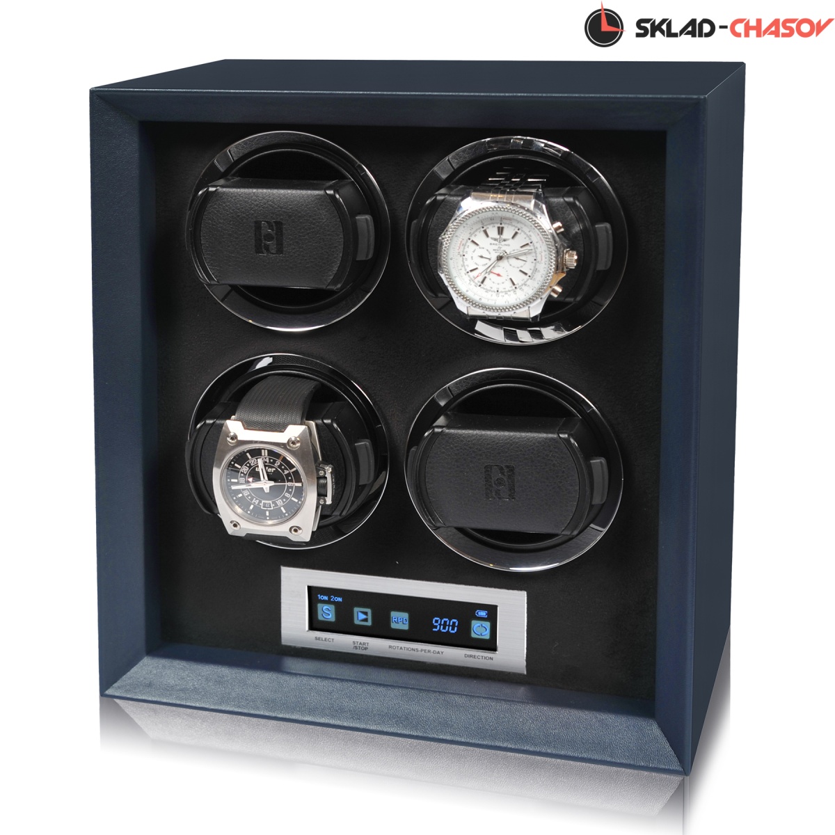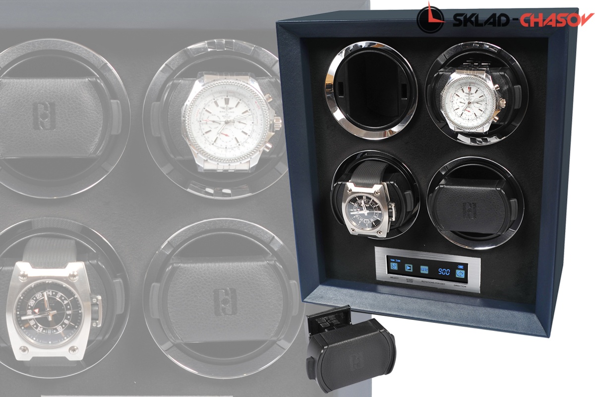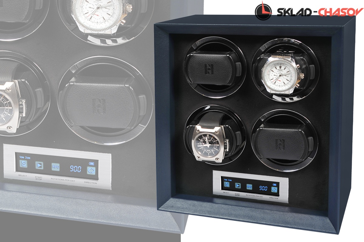 Шкатулка нового поколения, не большого размера для удобства использования и перемещения, выполнена из дерева и покрыта темно- синей кожей, открытый доступ к вашим часам, внутри выстлана чёрной микрофиброй (материал удобен для очистки от загрязнений), возможность встраиваемости в сейф или гардеробную, металлические колечки вокруг держателя последнего поколения, которые идеально регулируется под маленькие и большие браслеты а также фиксируются внутри стакана, держатель с каучуковой основой, независимые моторы с регулировкой 3-х направлений вращения и выбора количества оборотов 600,900,1200,1500,1800,2100 в сутки. Удобный и небольшой вариант для подзавода часов в вашей квартире или загородном доме. Фирменная - подарочная упаковка и комплект с карточкой прилагается. Гарантия расширенная 18 месяцев.