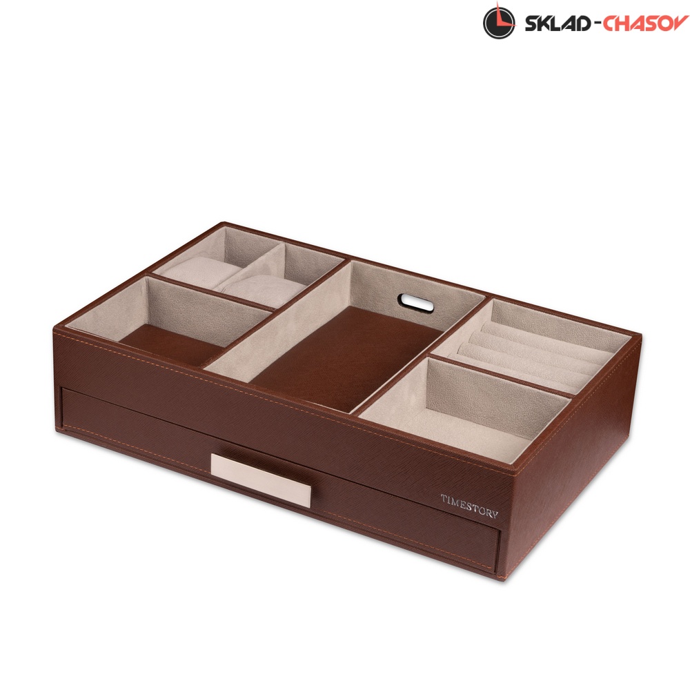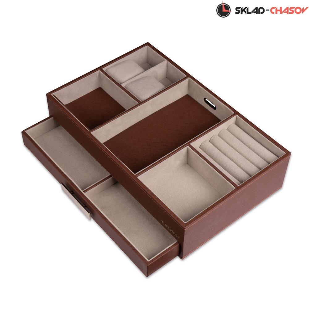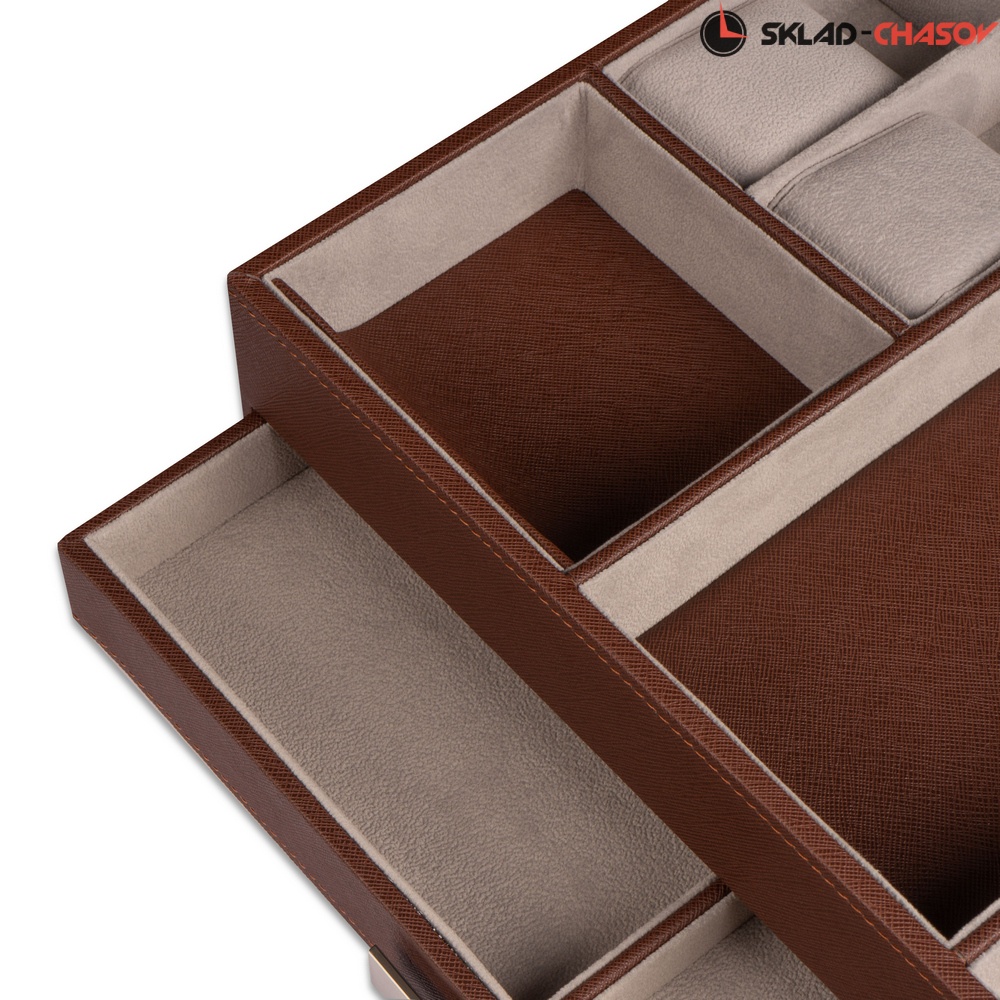 Невероятно прочный и стойкий к небольшим механическим воздействиям вкладыш, предназначен для хранении 2-х часов и разного вида ювелирных украшений. Эргономичные две подушки позволят с максимальным комфортом и удобством застегнуть на них часы любых размеров. Отделение с мягкими полосками подходит для удобного хранения колец, сережек и запонок. В дополнении к элегантности, у вкладыша есть дополнительный выдвижной ящик под хранение любых украшений.