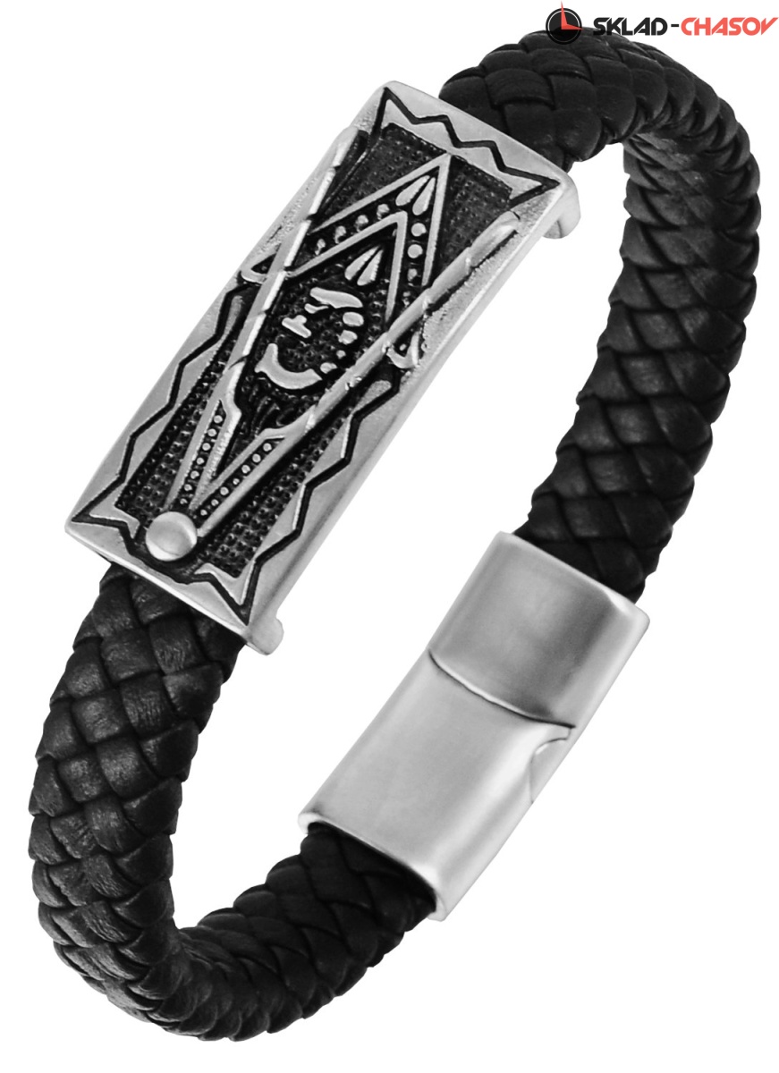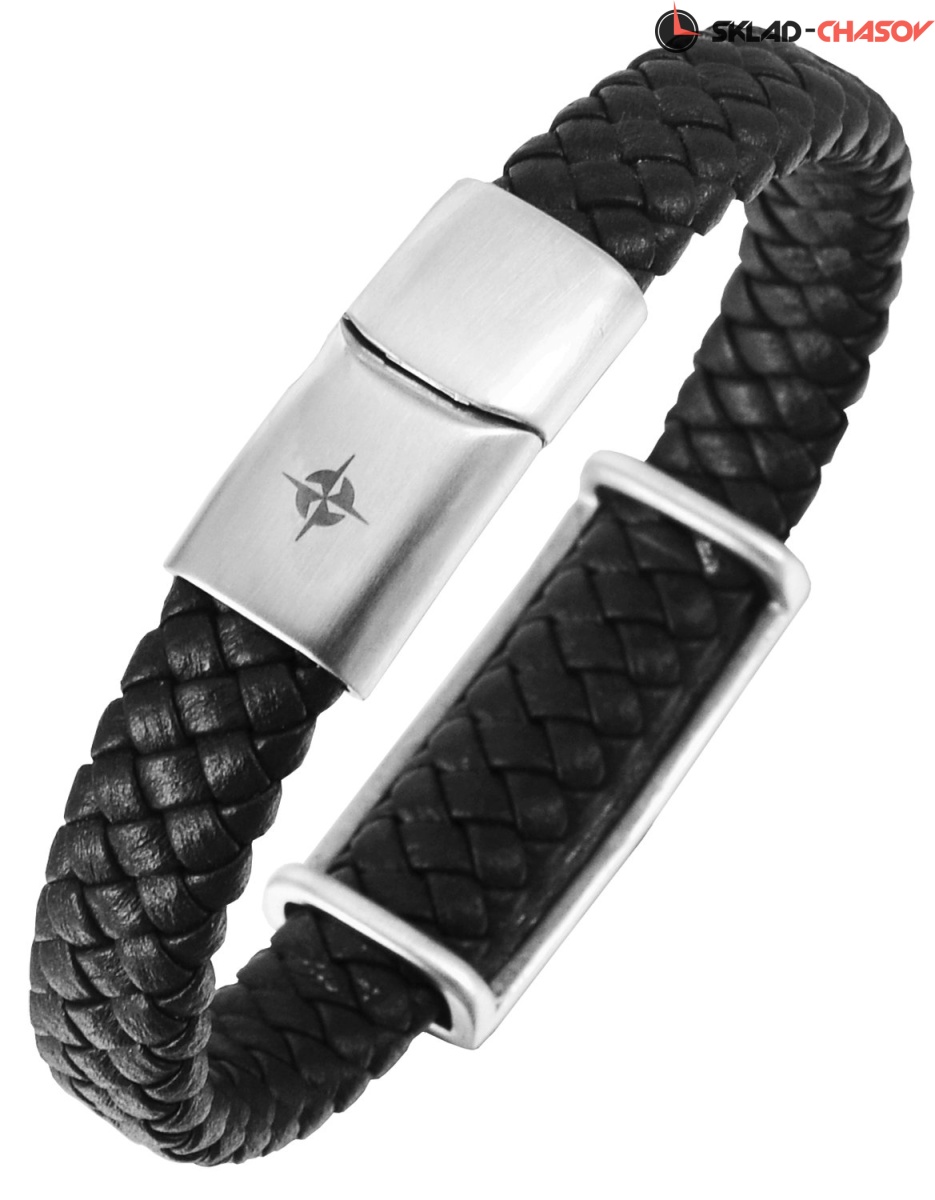 Браслет из натуральной кожи черного цвета. Он дополнен массивной пластиной из нержавеющей стали с гравировкой, центральное место в которой занимает латинская буква G — первая буква бренда Greenwich.