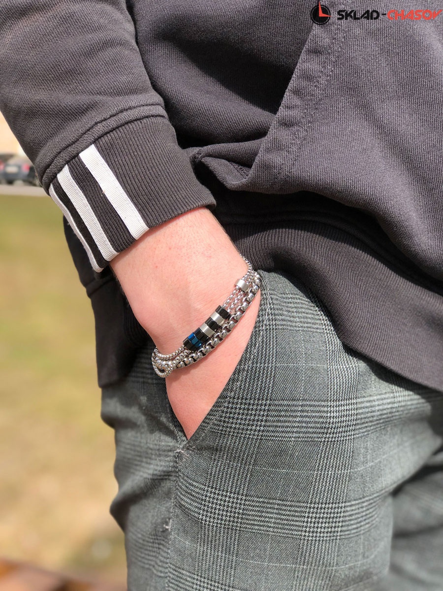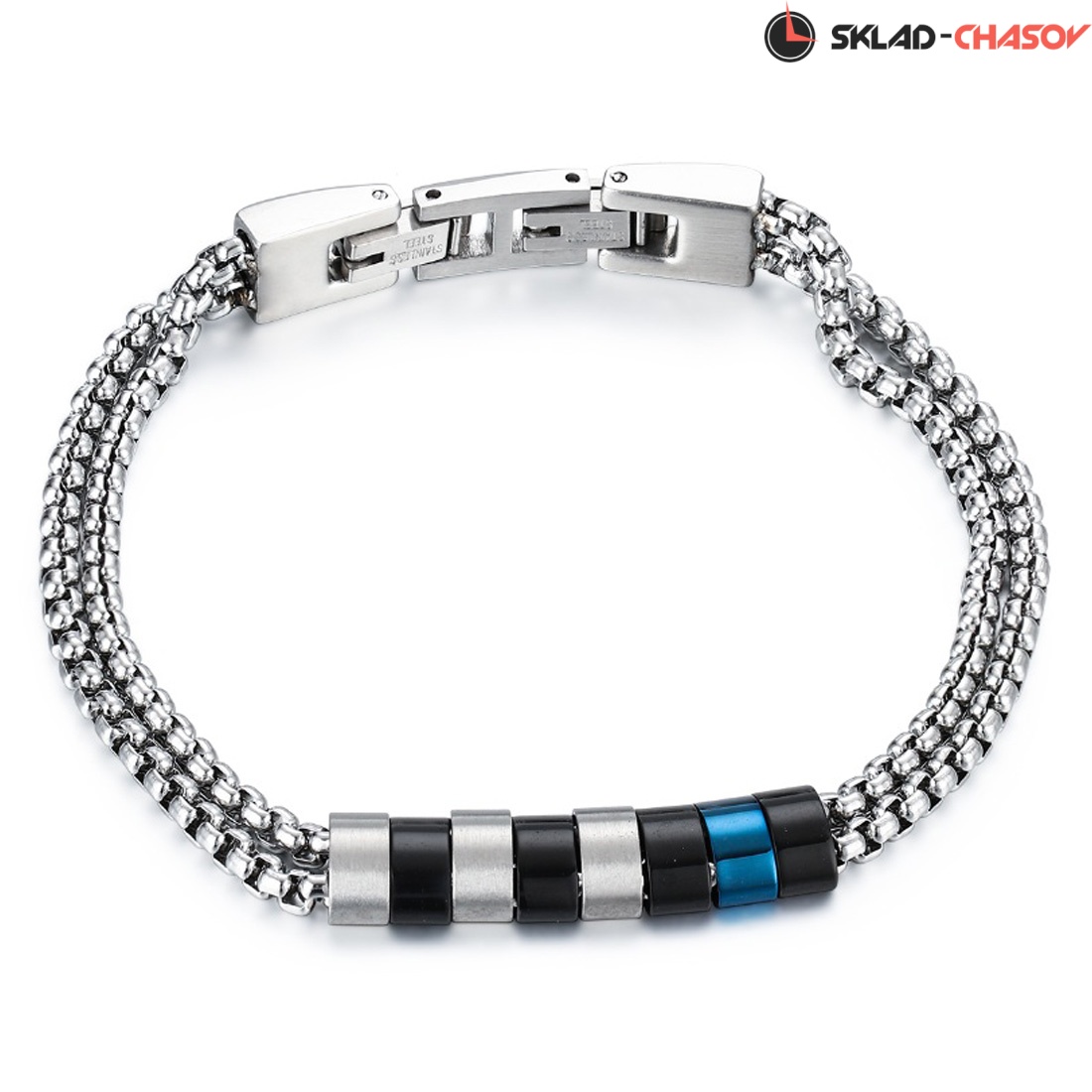 Браслет Greenwich в виде цепи оригинального плетения сделан из прочной нержавеющей стали, известной своими гипоаллергенными свойствами. Его украшают бусины с чередованием стали и PVD-покрытия черного и синего цветов.