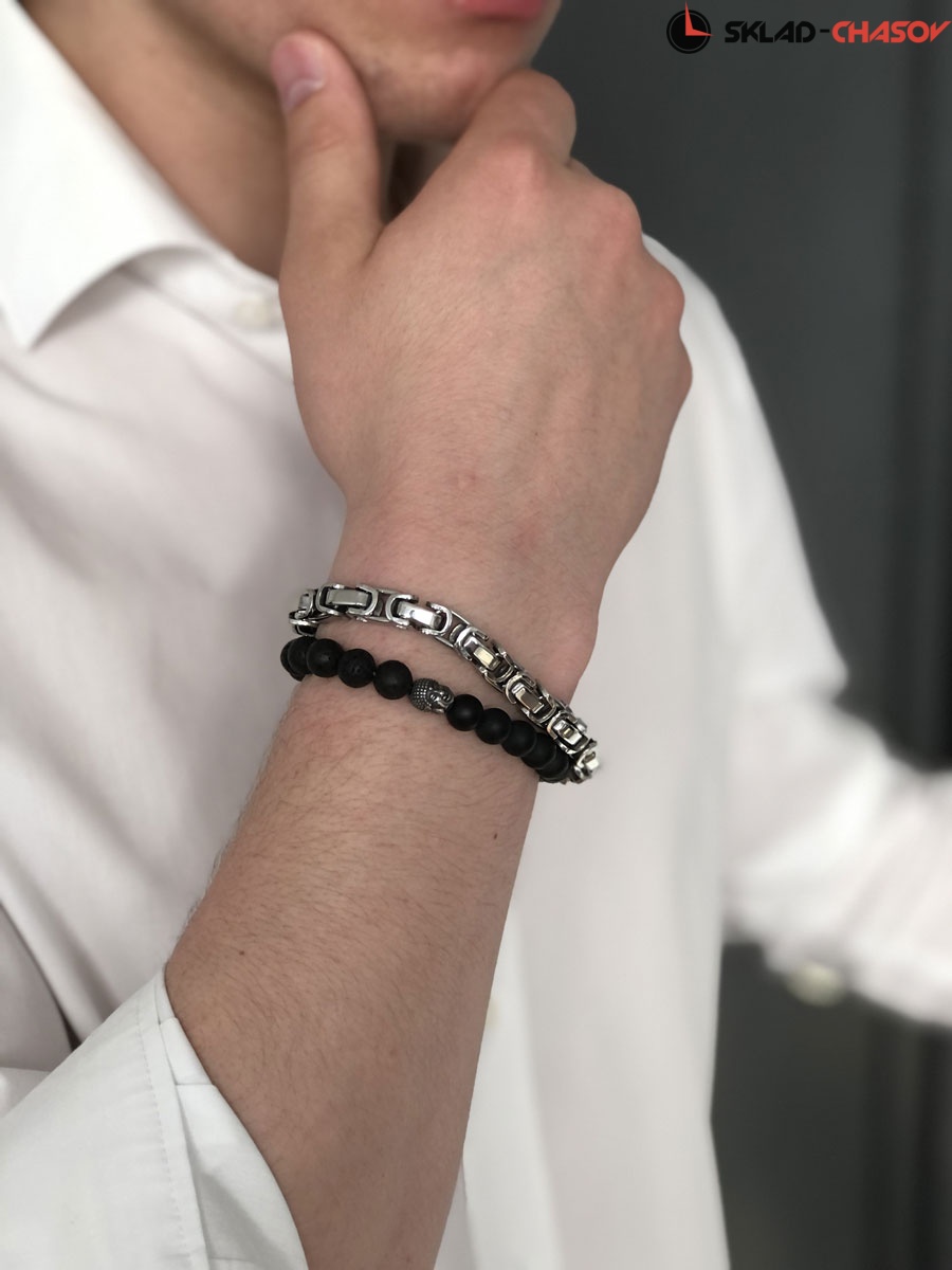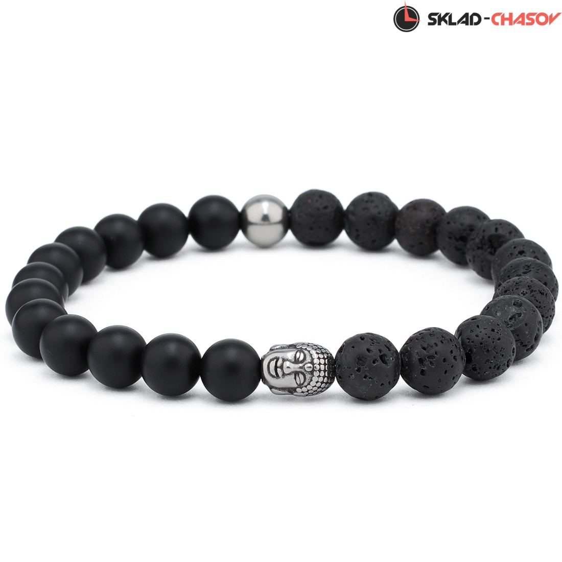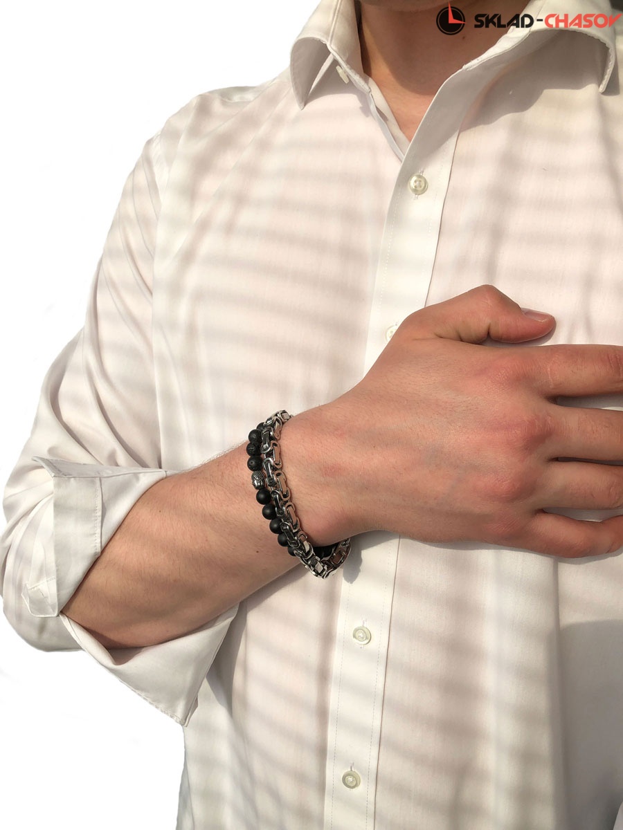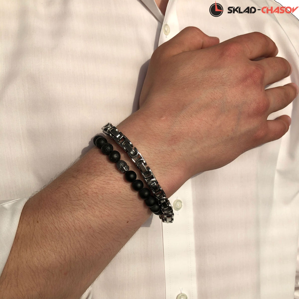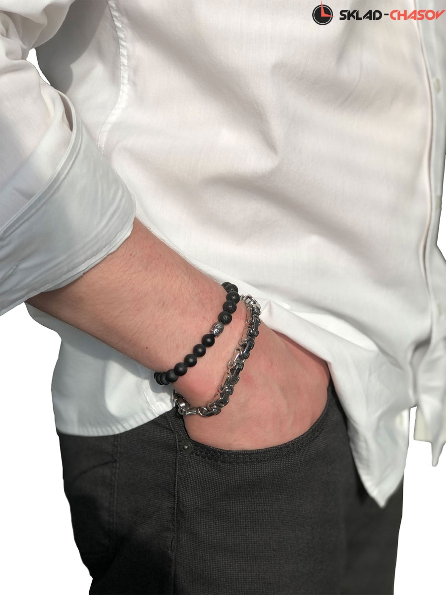 В браслете Greenwich прежде всего привлекает внимание эффектное сочетание гладких бусин из черного агата и шероховатых – из вулканической лавы.