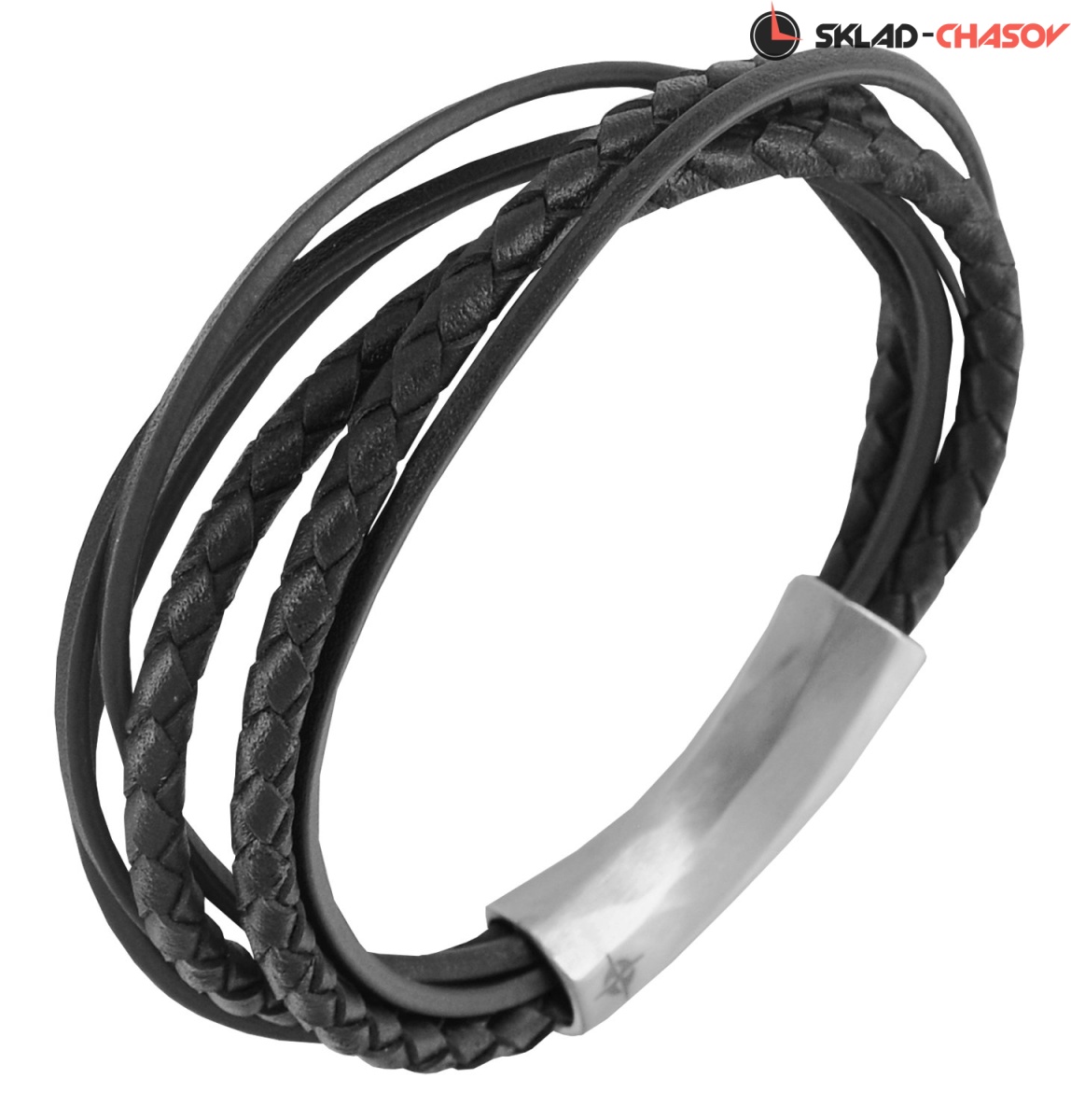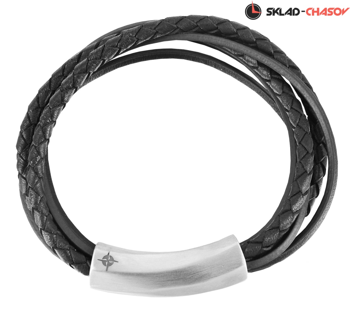 Браслет сделан из различных по толщине и плетению нитей из натуральной кожи черного цвета.