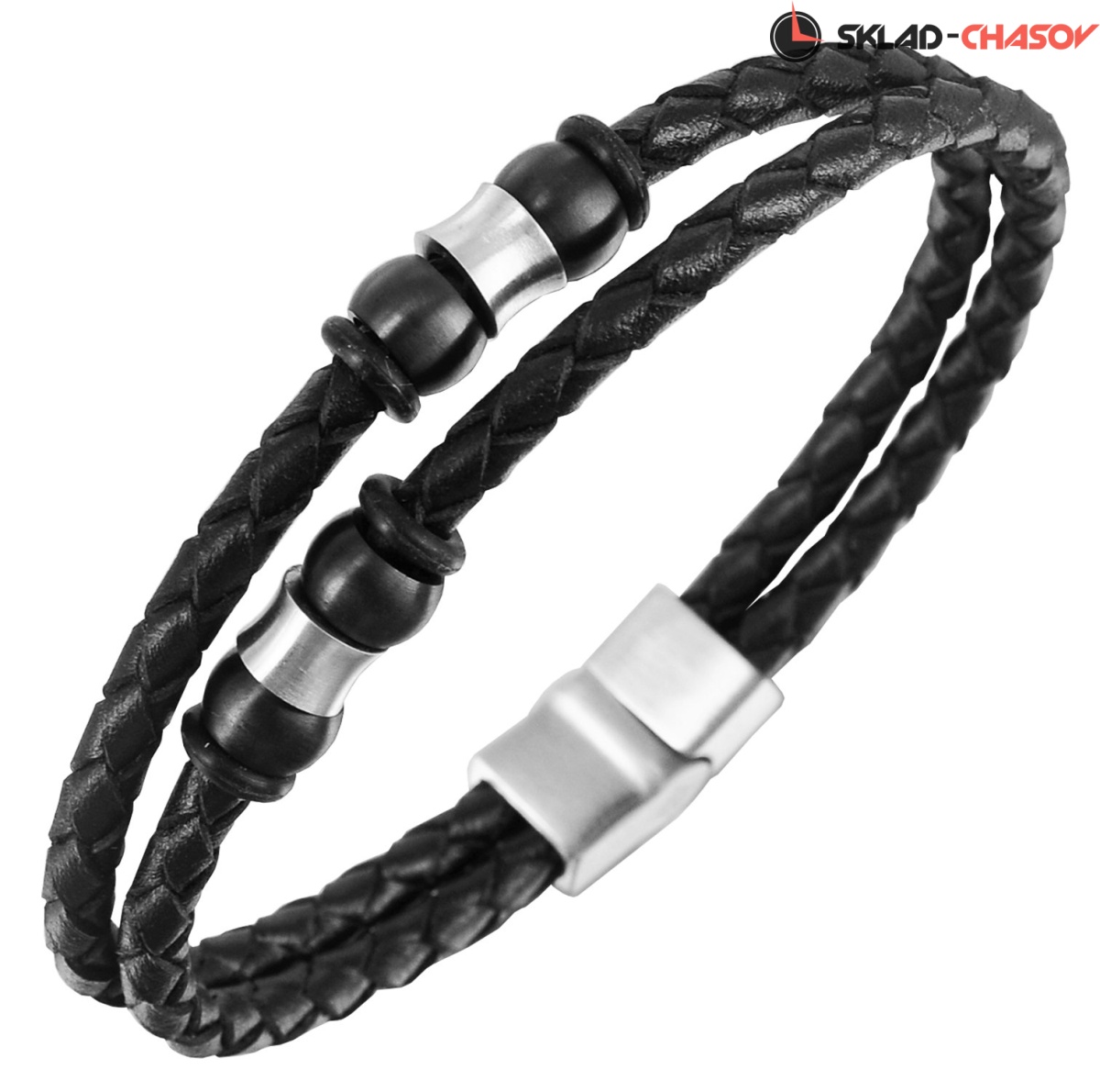 Браслет из плотных нитей выполнен из натуральной кожи черного цвета. Его дополняют бусины из нержавеющей стали: полированные и с черным PVD-покрытием.