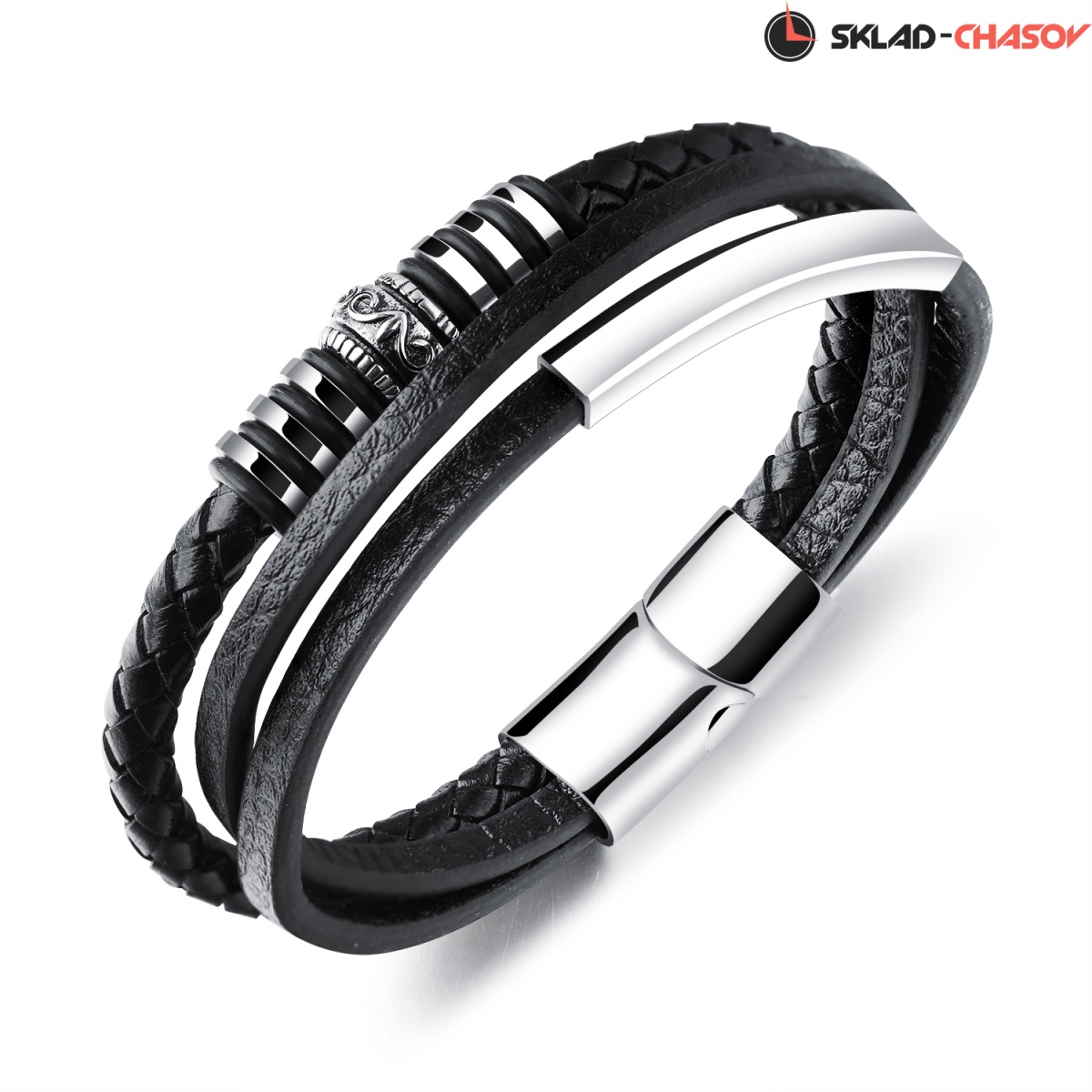 Браслет собран из натуральных кожаных нитей различных по толщине и плетению и дополнен декоративными элементами из нержавеющей стали с полировкой.