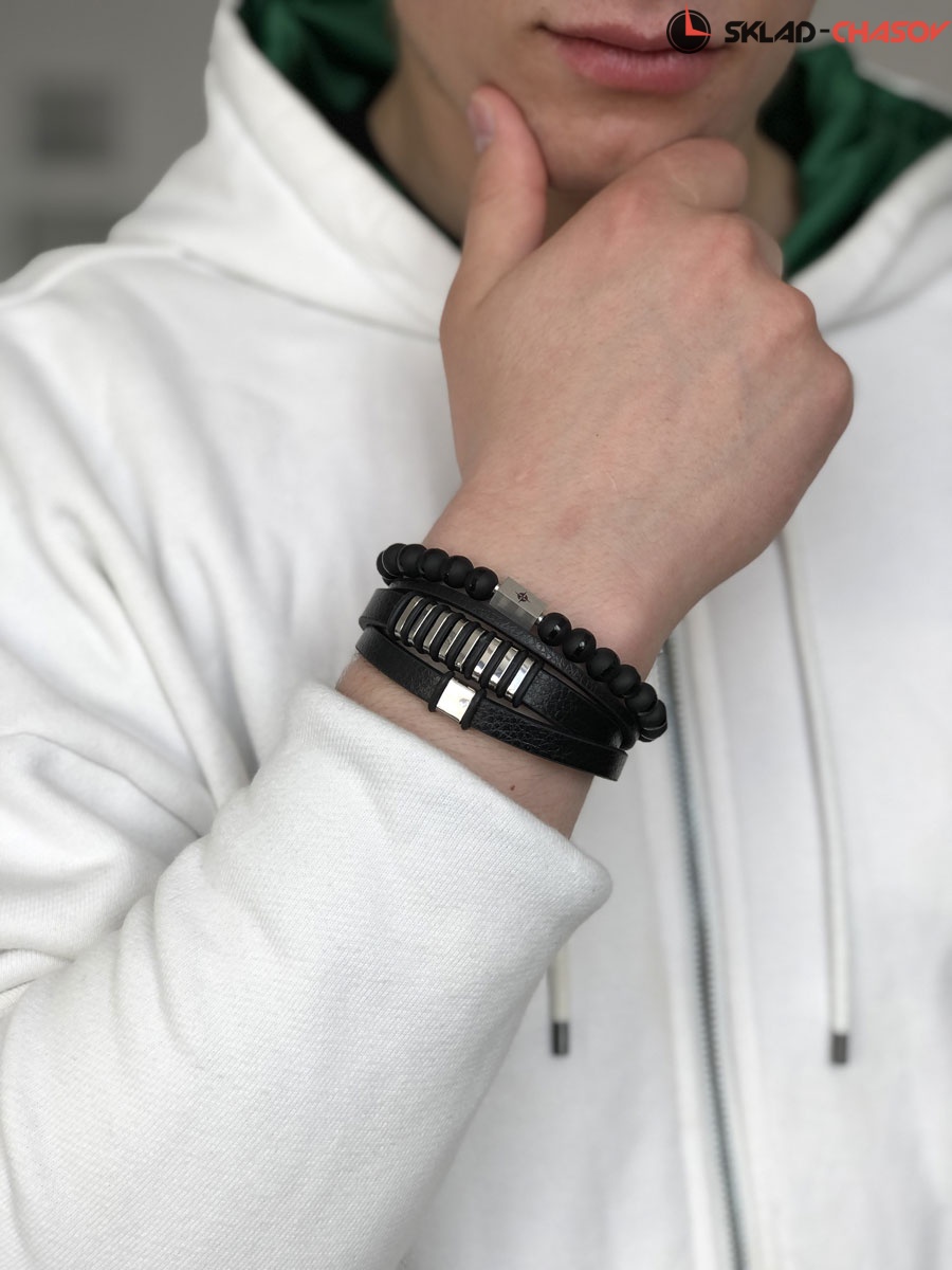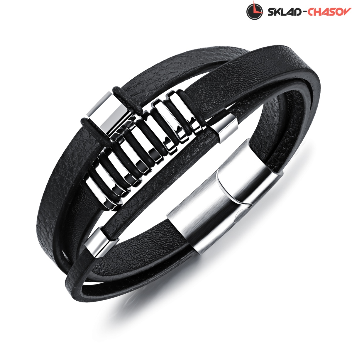 Браслет из натуральной кожи черного цвета дополнен декоративными элементами из нержавеющей стали с полировкой.