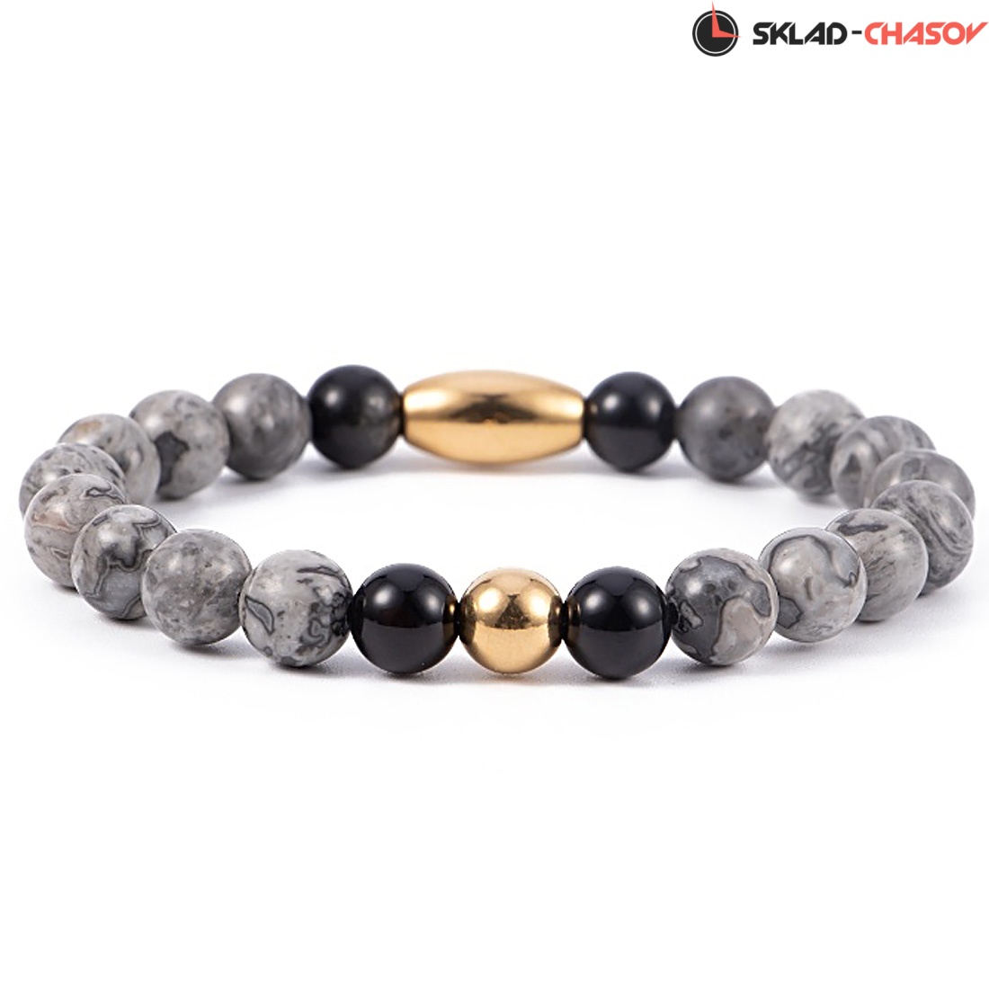 Элегантный браслет сочетает несколько видов бусин: из яшмы, черного агата и нержавеющей стали с PVD-покрытием из желтого золота.
