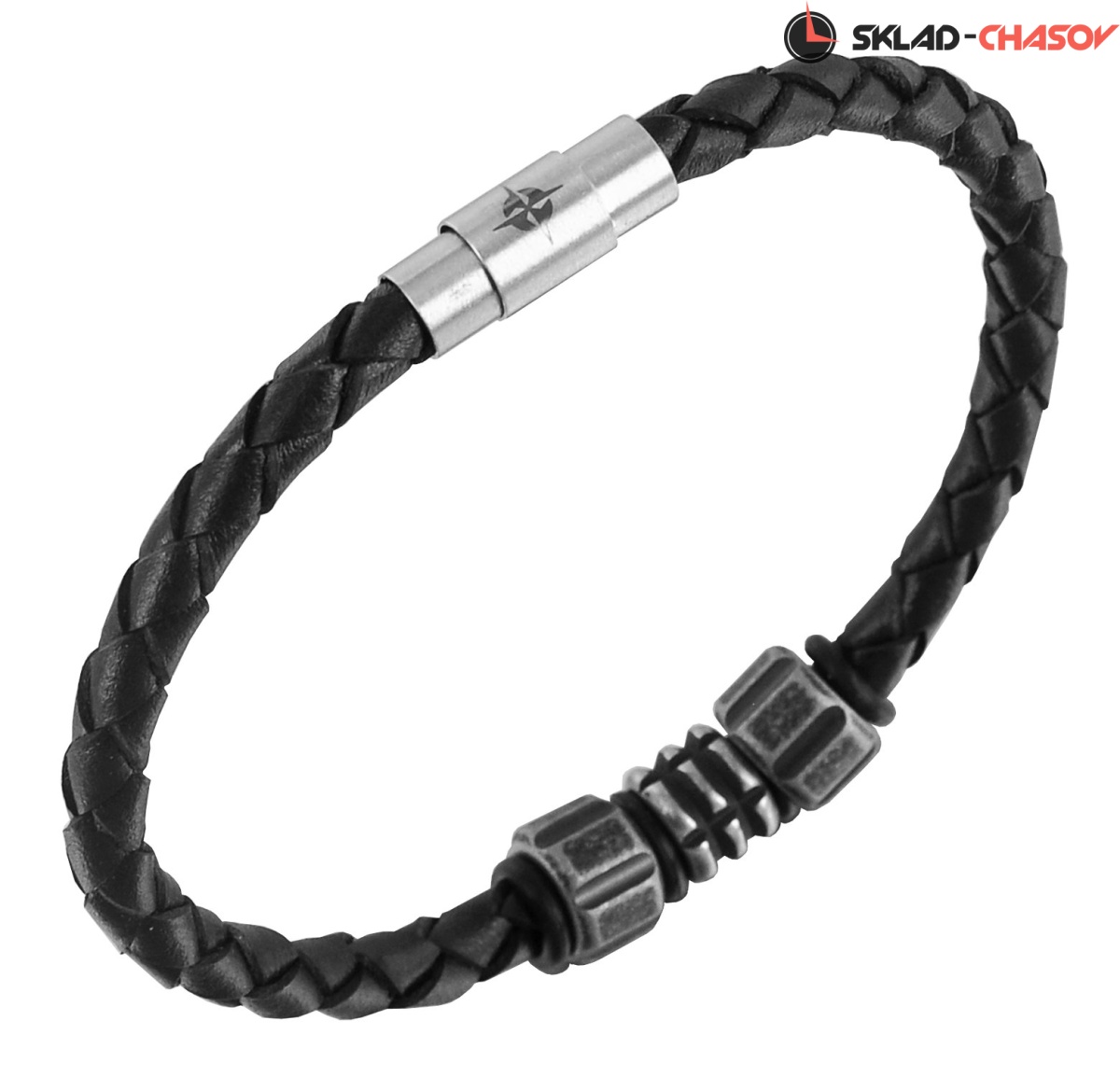 Браслет из натуральной кожи черного цвета достаточно тонкий, что бы дополнять и оттенять другие ваши аксессуары. Но, в то же время, прочный, благодаря круговому плетению кожаных нитей. Он дополнен элементами из нержавеющей стали, которые удерживаются на месте с помощью силиконовых колец. Стальная застежка с магнитным креплением — особое украшение этого стильного и лаконичного браслета.