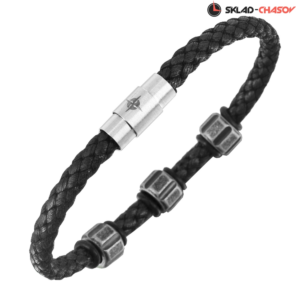 Браслет из натуральной кожи черного цвета достаточно тонкий, что бы дополнять и оттенять другие ваши аксессуары. Но, в то же время, прочный, благодаря круговому плетению кожаных нитей. Он дополнен элементами из нержавеющей стали, которые удерживаются на месте с помощью силиконовых колец. Стальная застежка с магнитным креплением — особое украшение этого стильного и лаконичного браслета.
