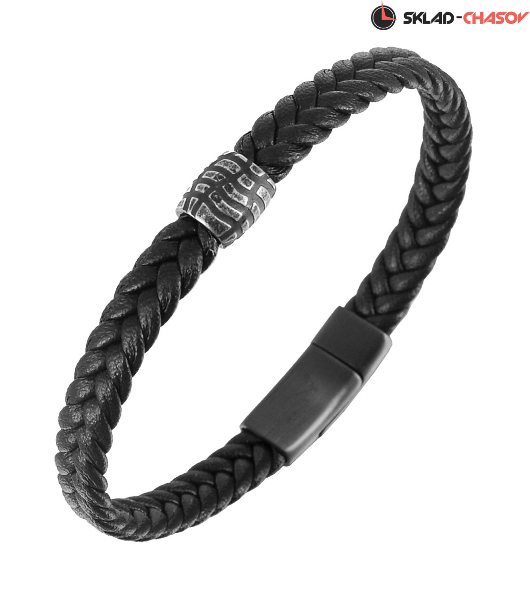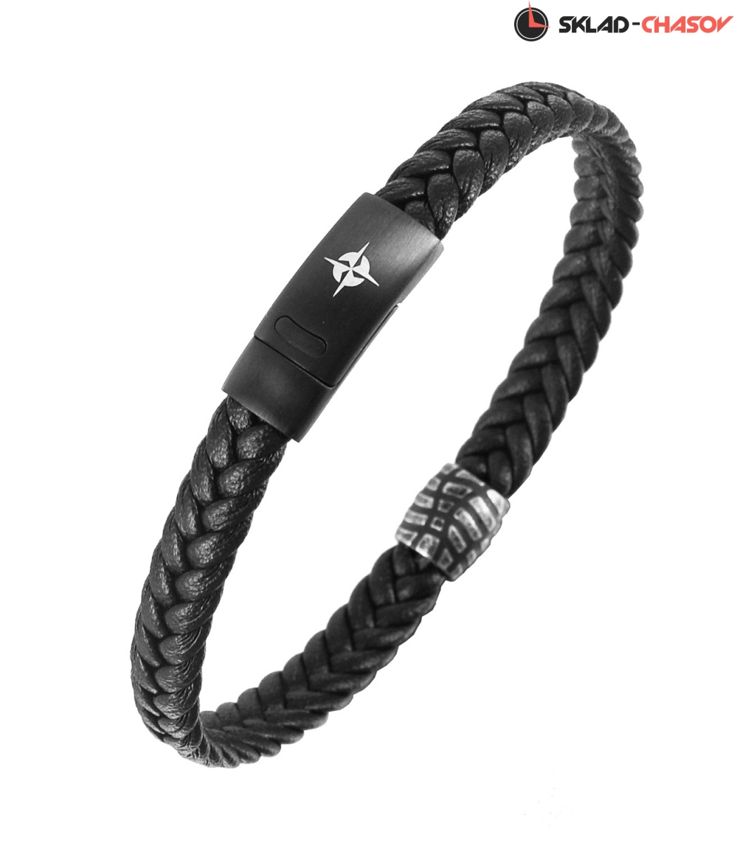 Браслет из натуральной кожи черного цвета, украшением которого служит объемный элемент из нержавеющей стали.