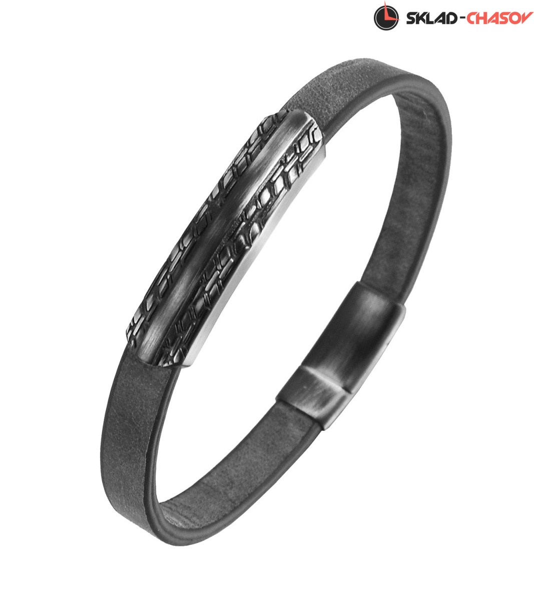 Браслет из мягкой и прочной натуральной кожи черного цвета. Его украшением служит декоративная пластина из нержавеющей стали с объемным рисунком.