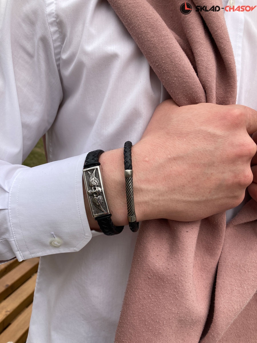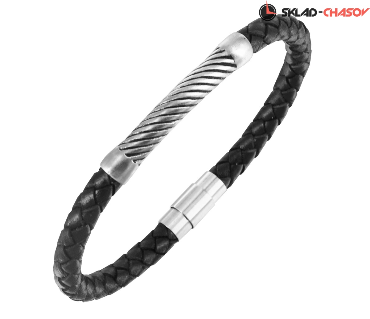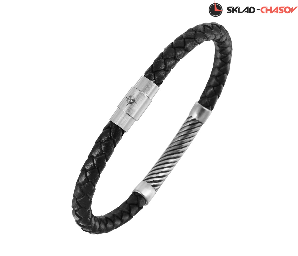 Браслет из натуральной кожи черного цвета. Он дополнен элементами из нержавеющей стали c гравировкой в виде спирали.