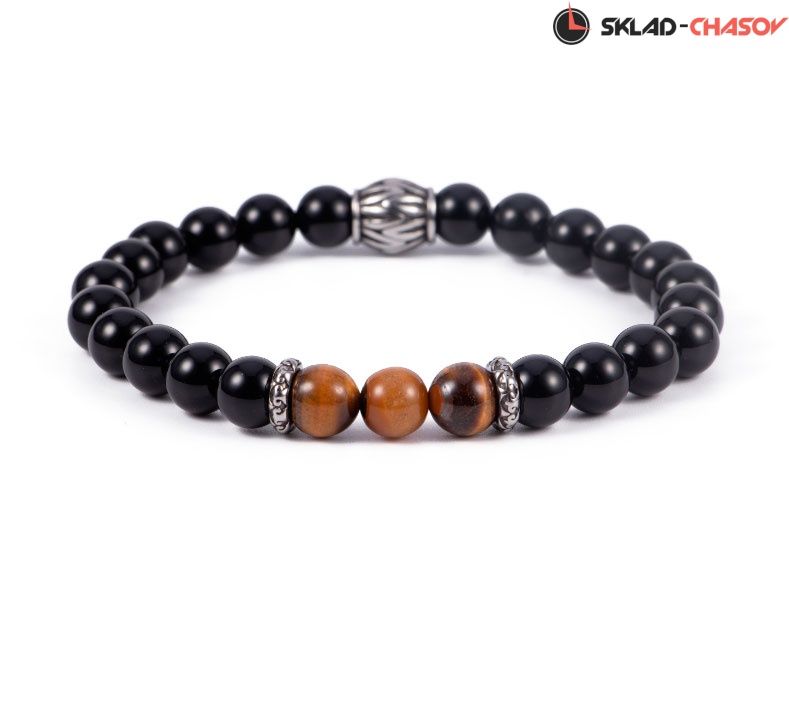Круглые бусины браслета Greenwich сделаны из кварца с эффектным окрасом «тигровый глаз» и черного агата. Украшением служат декоративные элементы из гипоаллергенной нержавеющей стали.