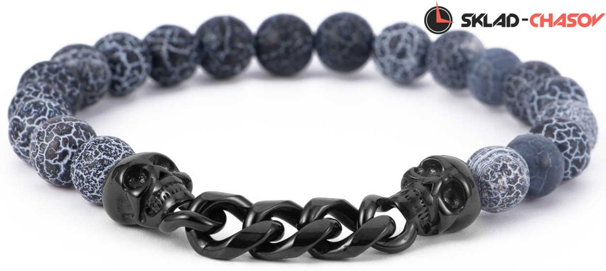 Считается, что этот камень способен наделить своего хозяина даром красноречия, нейтрализует неблагоприятное энергетическое влияние. Браслет из агата дополнен декоративными элементами в виде черепа из нержавеющей стали с PVD-покрытием.