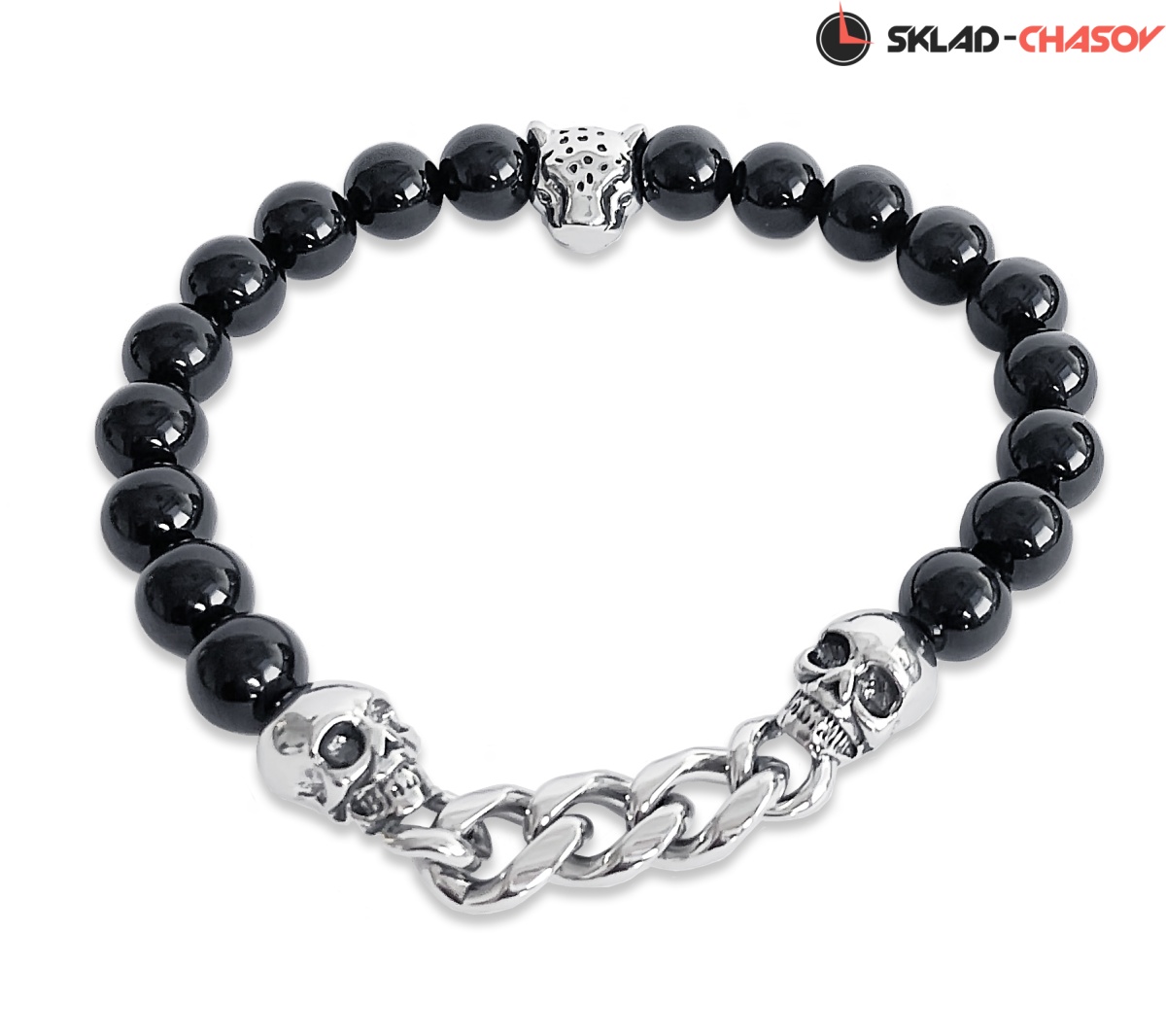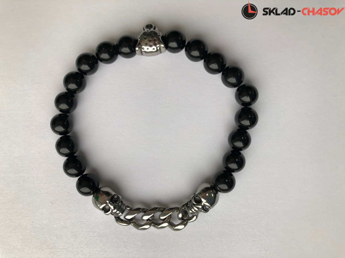 Браслет из черного оникса украшен декоративными элементами из нержавеющей стали.