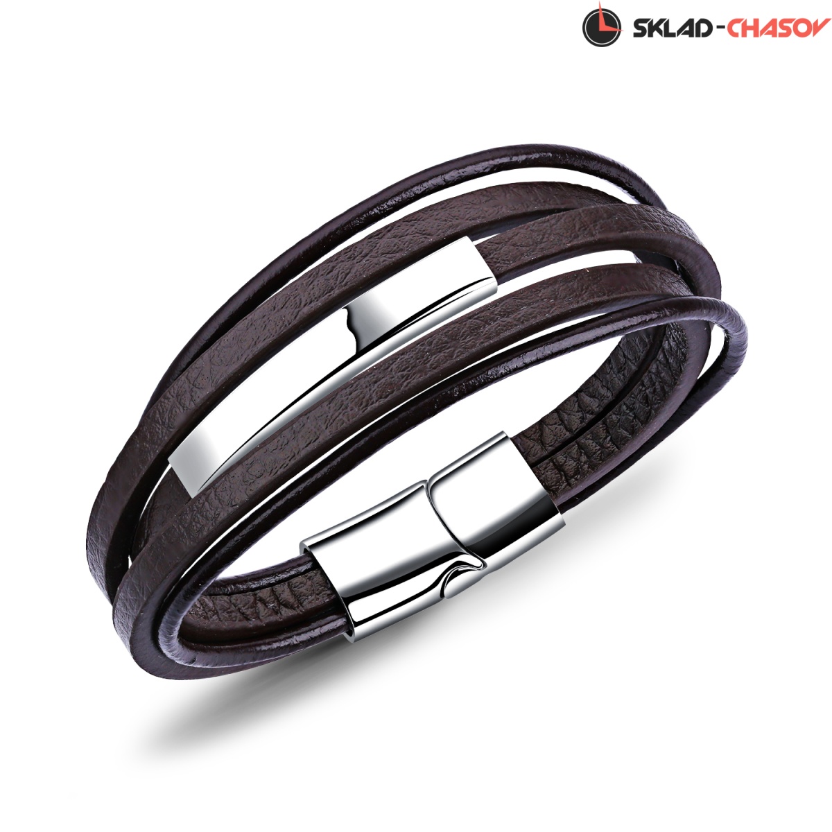 Браслет из натуральной кожи коричневого цвета с выигрышным сочетанием кожаных нитей разной толщины. Они дополнены декоративной пластиной из полированной нержавеющей стали.