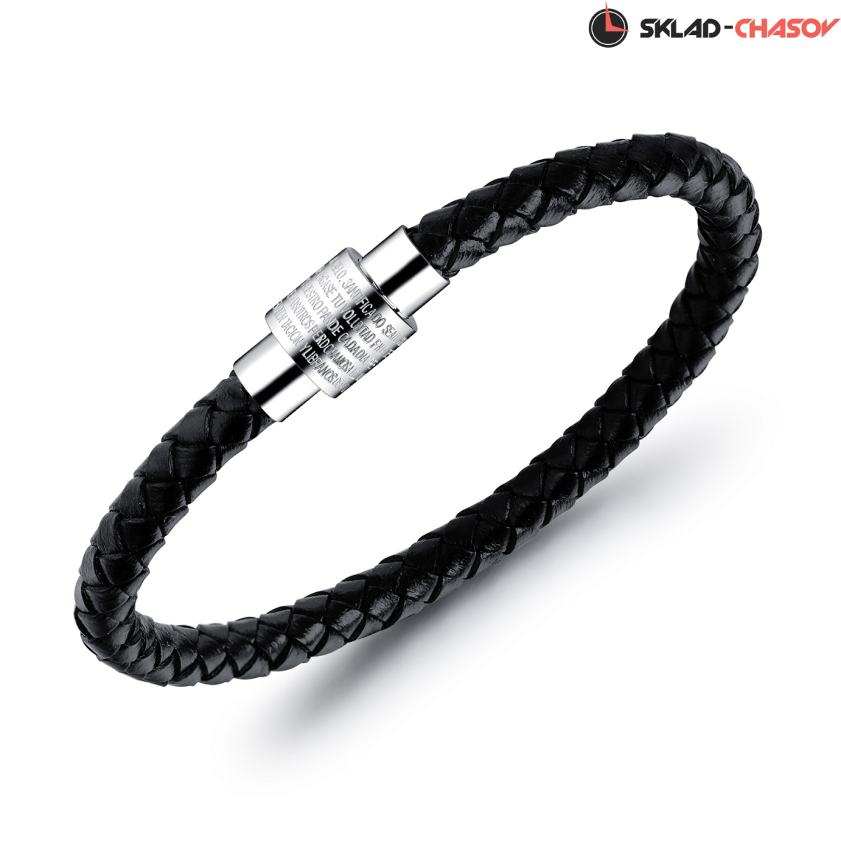 Браслет из натуральной кожи черного цвета. Его магнитная застежка из нержавеющей стали выполняет, так же, декоративную функцию и украшена гравировкой.