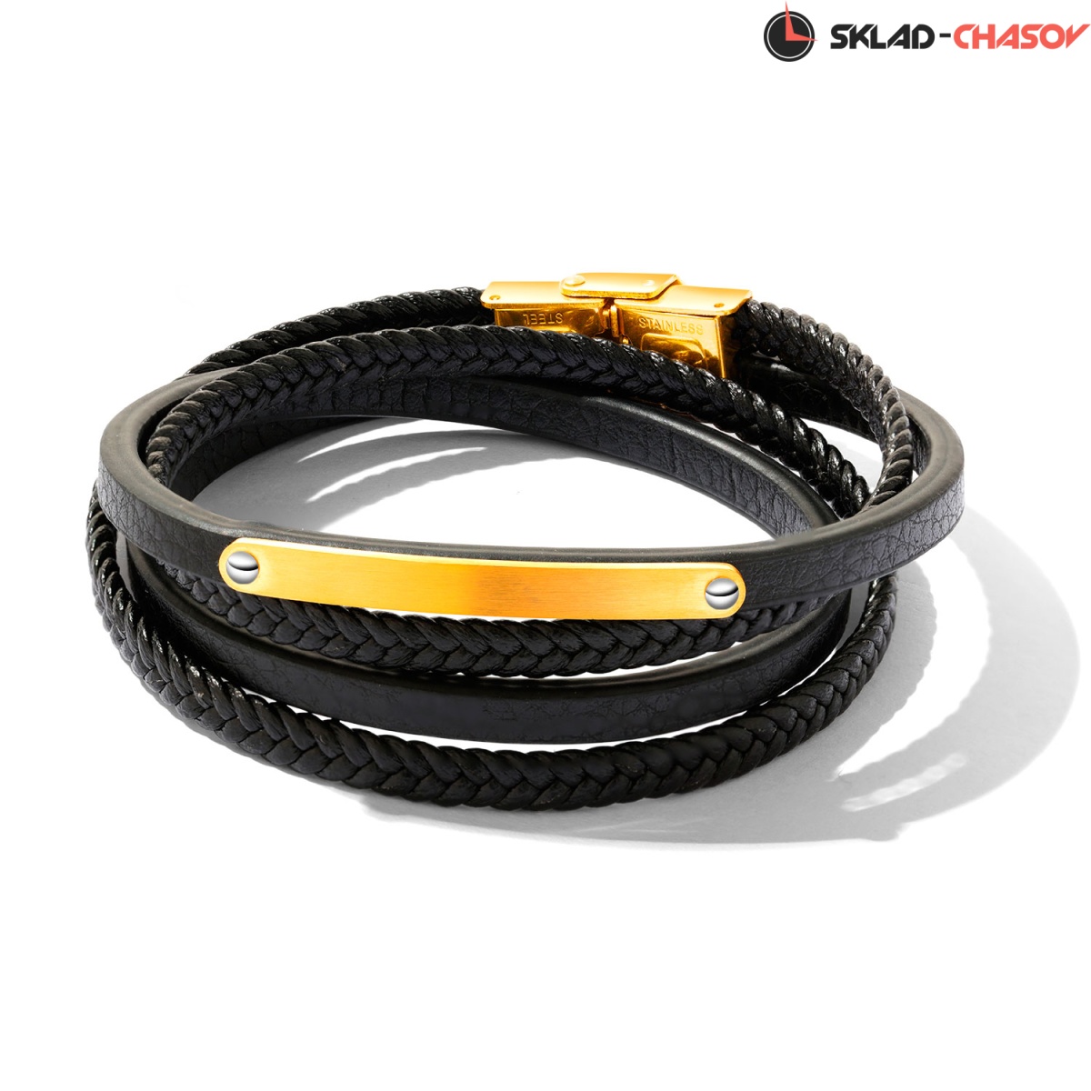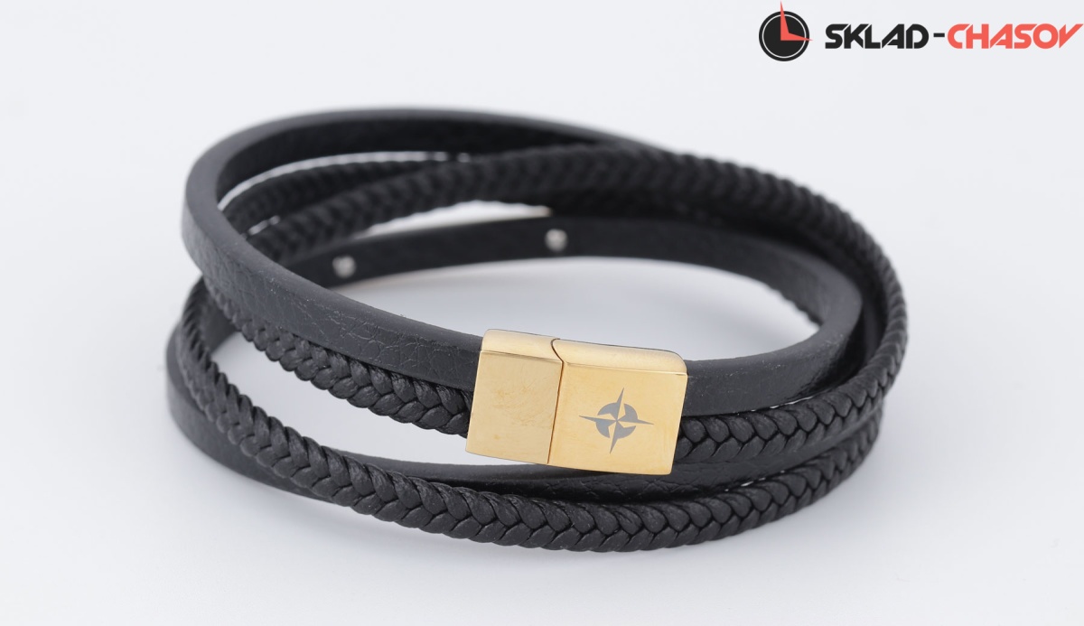 Браслет собран из множества нитей разной текстуры — все из натуральной кожи черного цвета. Он дополнен элементами из нержавеющей стали.