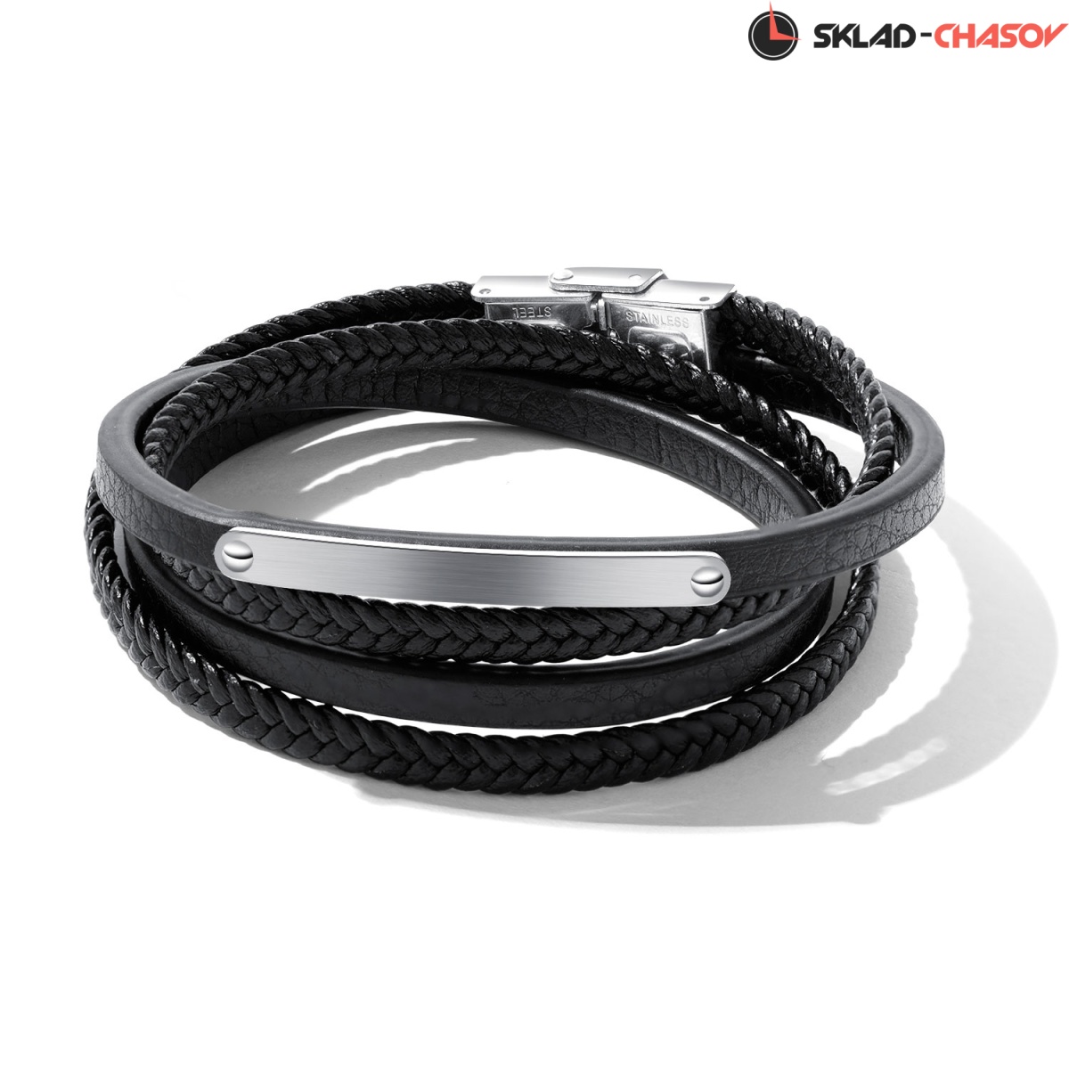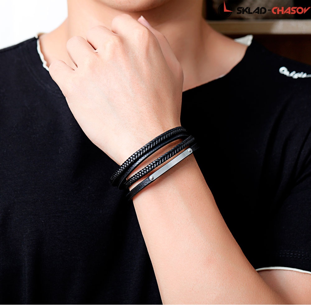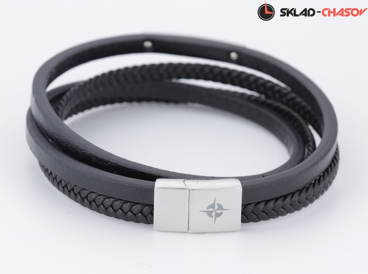 Браслет собран из множества нитей разной текстуры — все из натуральной кожи черного цвета. Он дополнен элементами из нержавеющей стали. На браслет установлена стальная застежка, украшенная логотипом бренда.