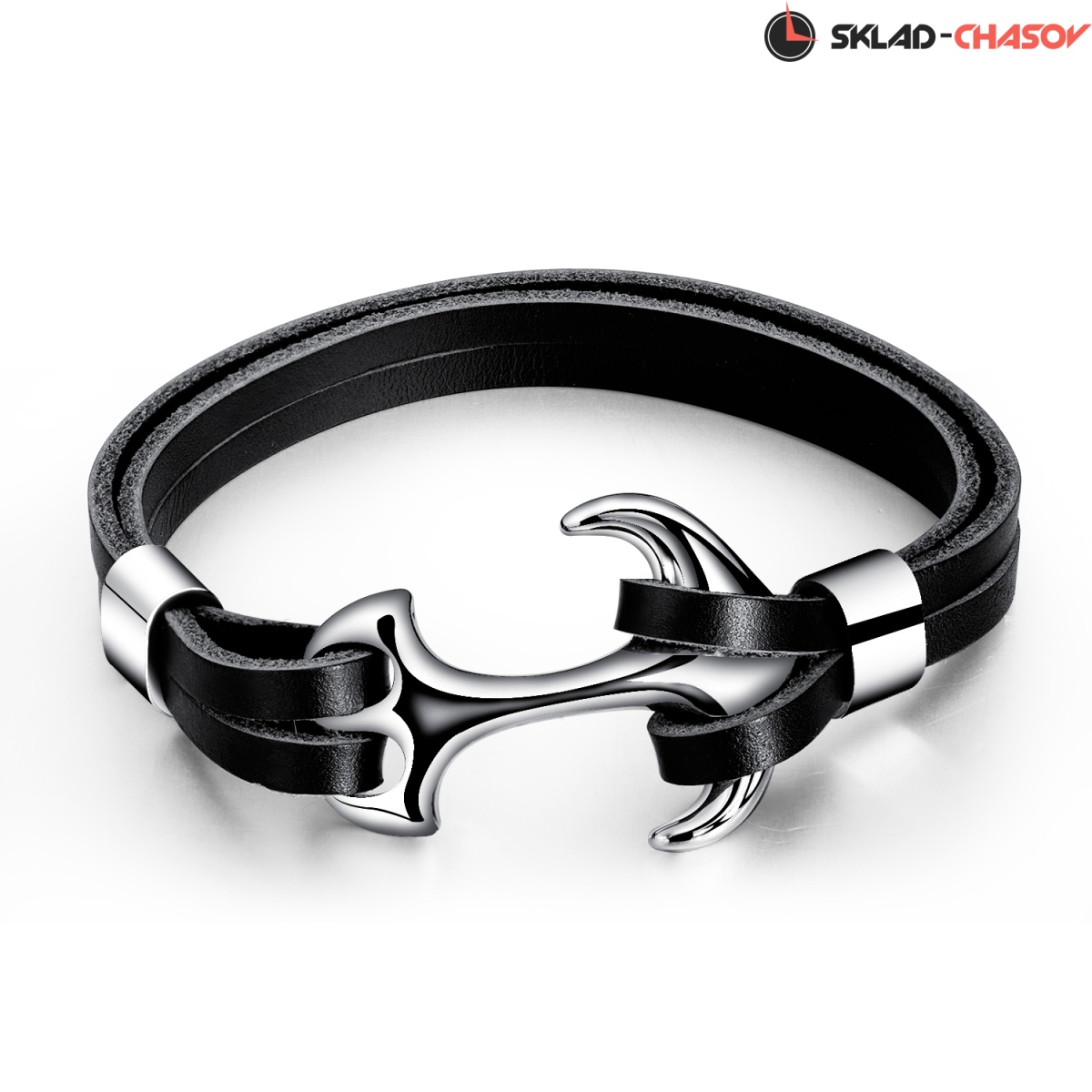 Браслет из натуральной кожи черного цвета. Центральный элемент в виде якоря сделан из полированной нержавеющей стали. Он выполняет, одновременно, и функцию застежки.