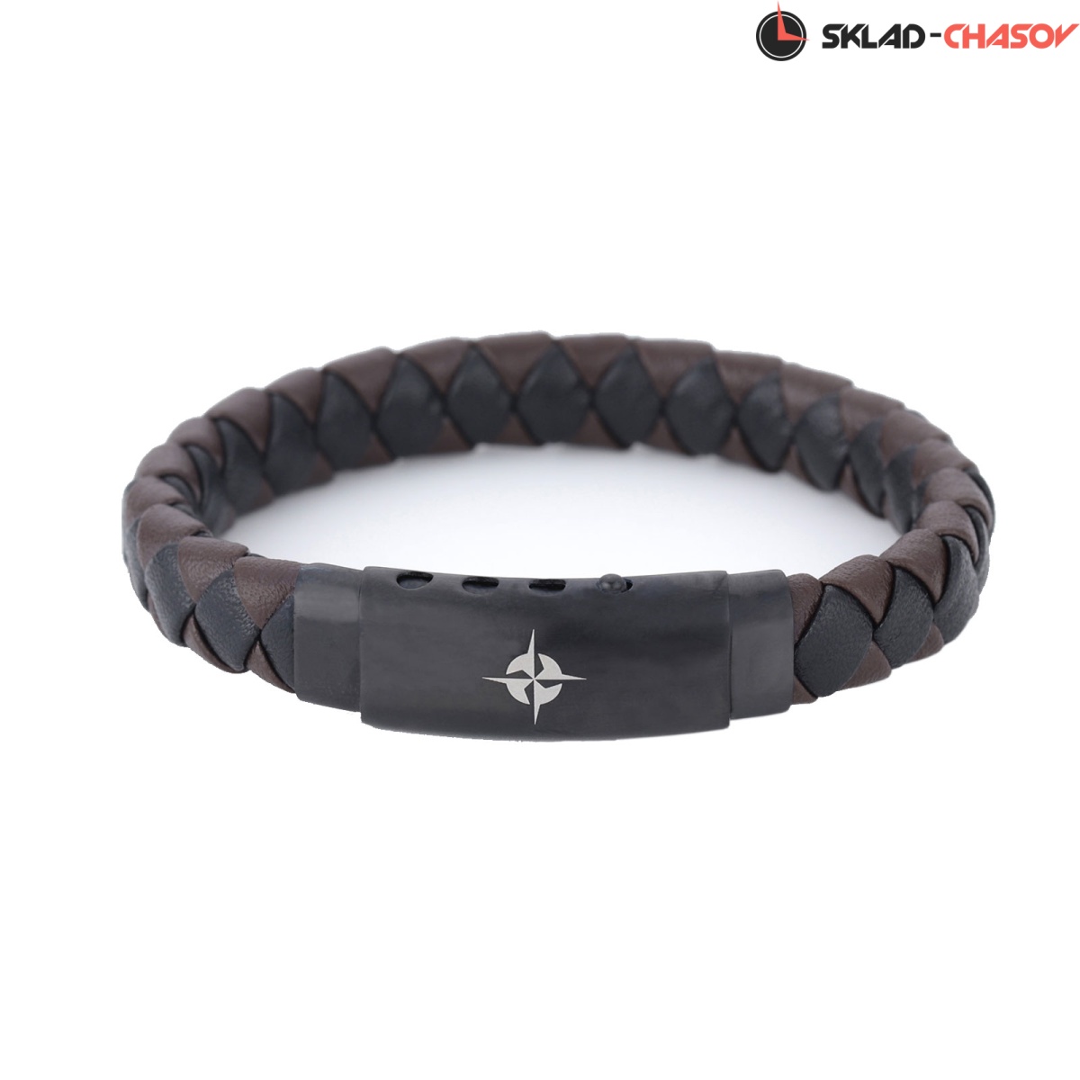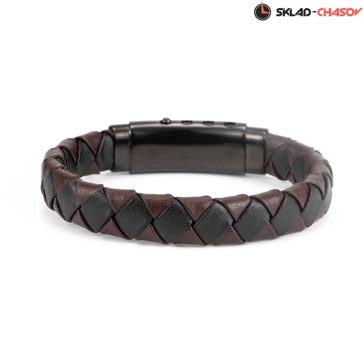 крашением браслета служит переплетение нитей из натуральной кожи коричневого и черного цветов. Матовая застежка сделана из гипоаллергенной нержавеющей стали с PVD-покрытием.