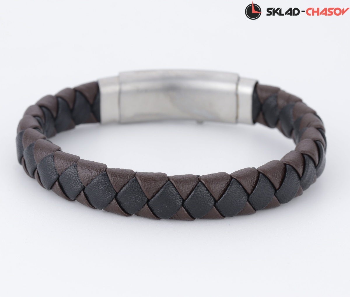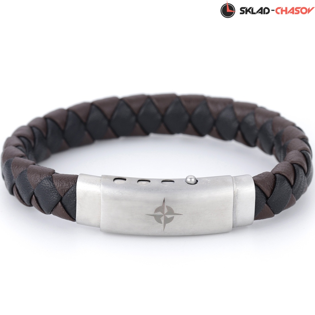 Украшением браслета служит переплетение нитей из натуральной кожи коричневого и черного цветов. Надежная застежка сделана из гипоаллергенной нержавеющей стали.