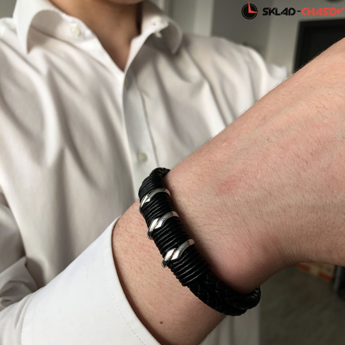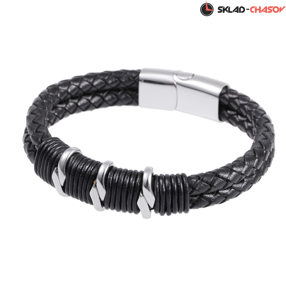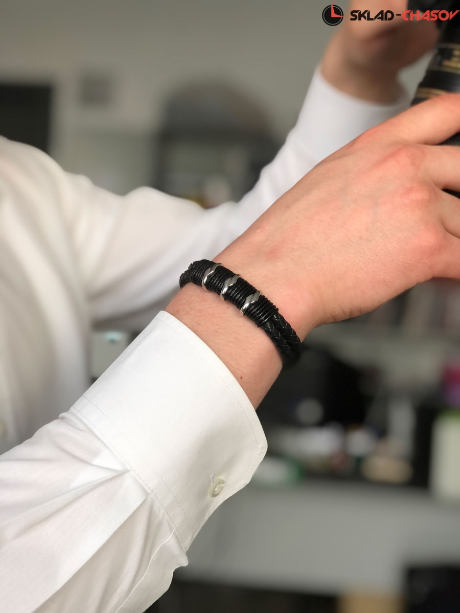 Браслет из натуральной кожи черного цвета дополняют декоративные элементы из прочной нержавеющей стали с полировкой.