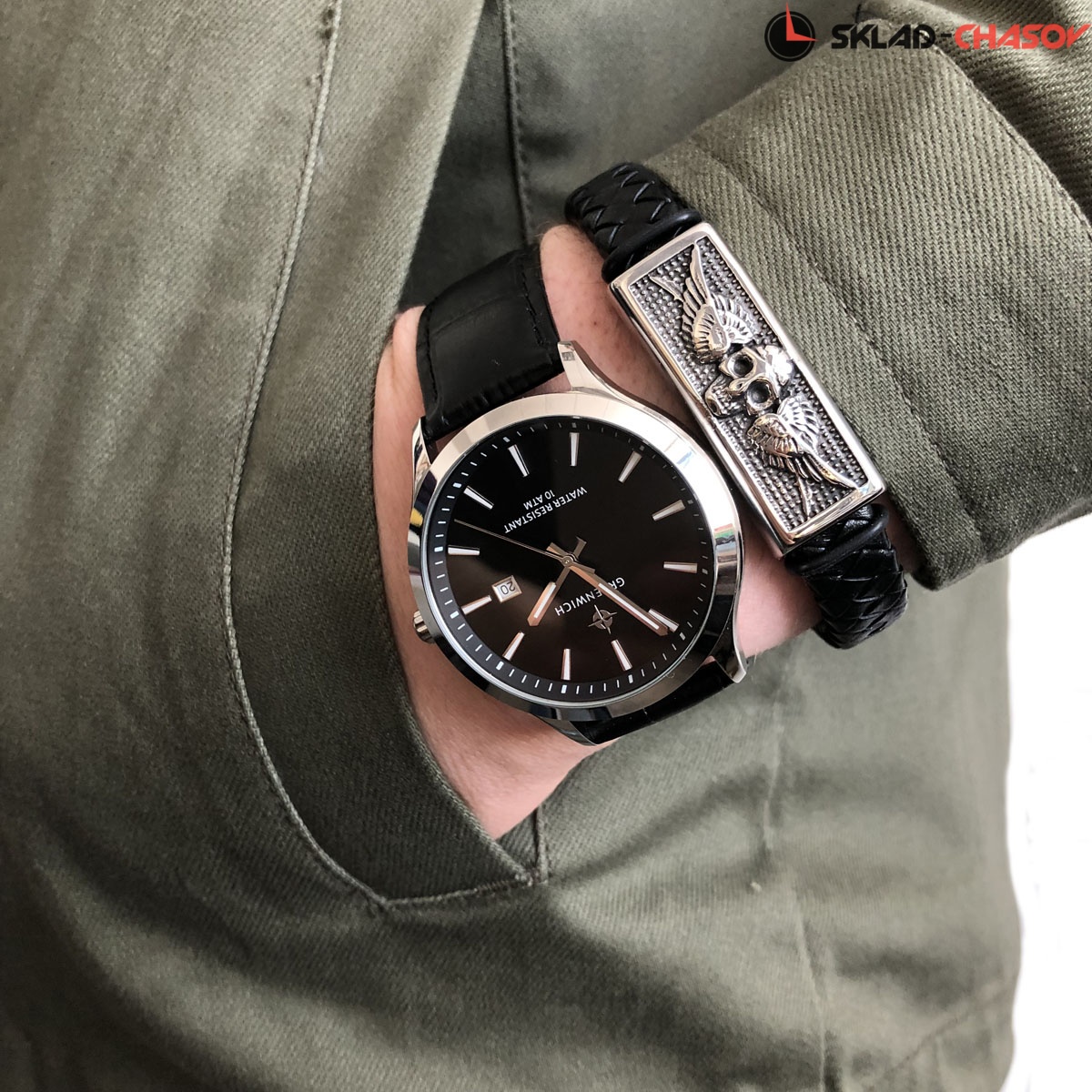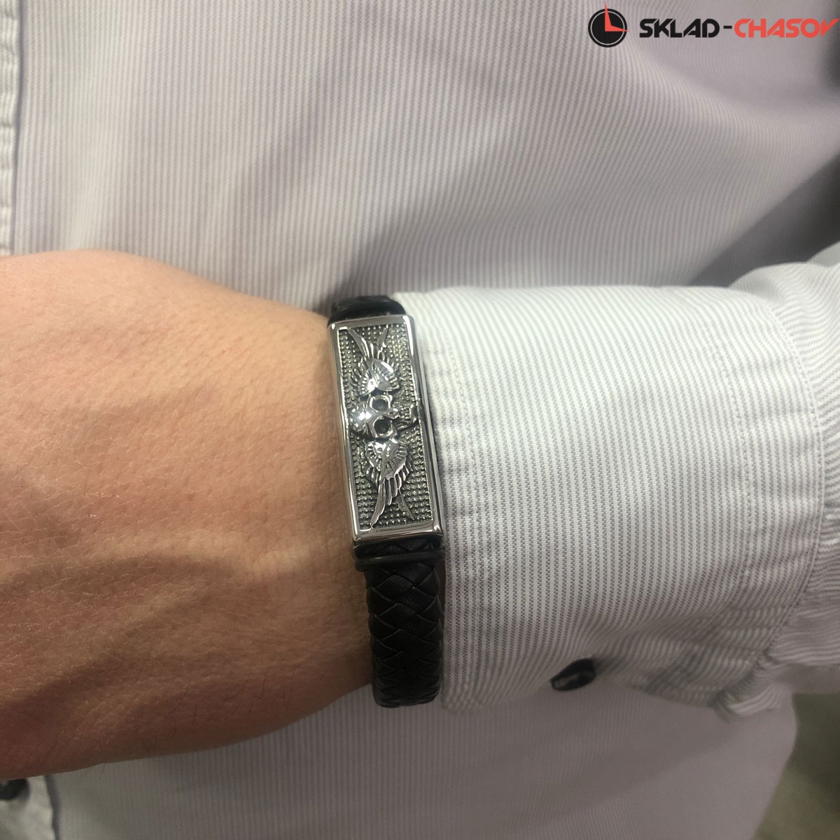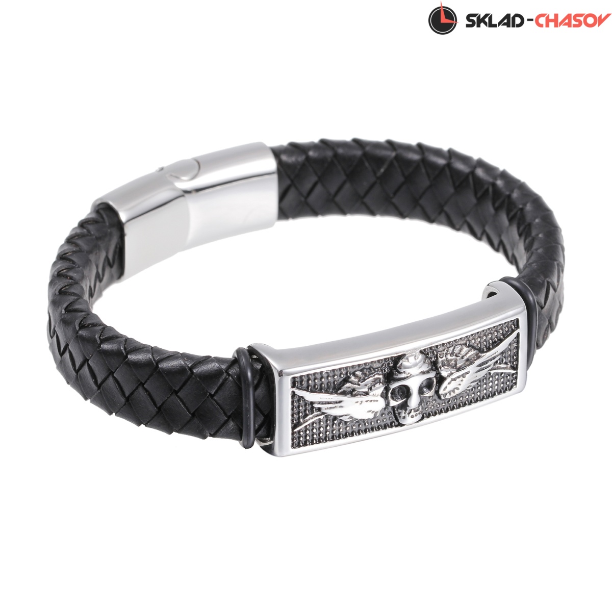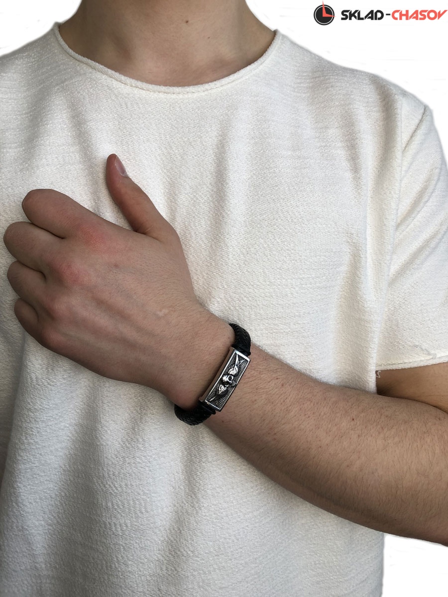 Браслет из натуральной кожи черного цвета дополняют декоративные элементы из прочной нержавеющей стали. Объемное изображение черепа и крыльев добавляет брутальности образу и вызывает ассоциации с древними воинами, викингами. Череп — яркий символ, имеющий много трактовок. Некоторые верят, что он приносит победу и дарит защиту. В древности его считали вместилищем души.