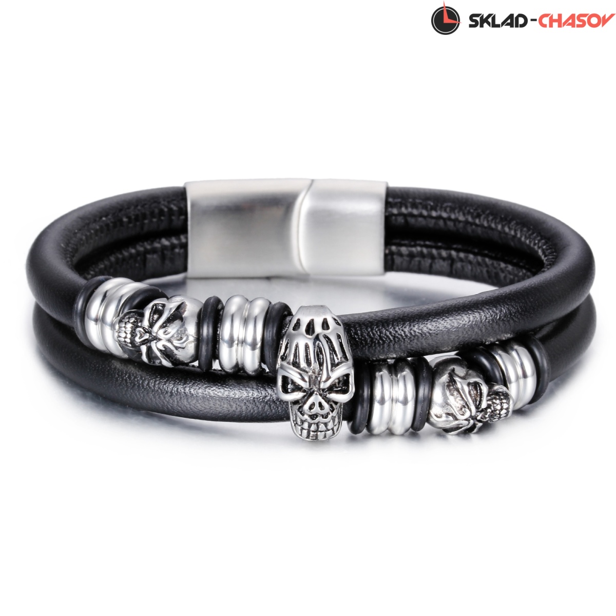 Браслет из натуральной кожи черного цвета дополняют декоративные элементы из прочной нержавеющей стали. Череп — яркий символ, имеющий много трактовок. Некоторые верят, что он приносит победу и дарит защиту. В древности его считали вместилищем души.