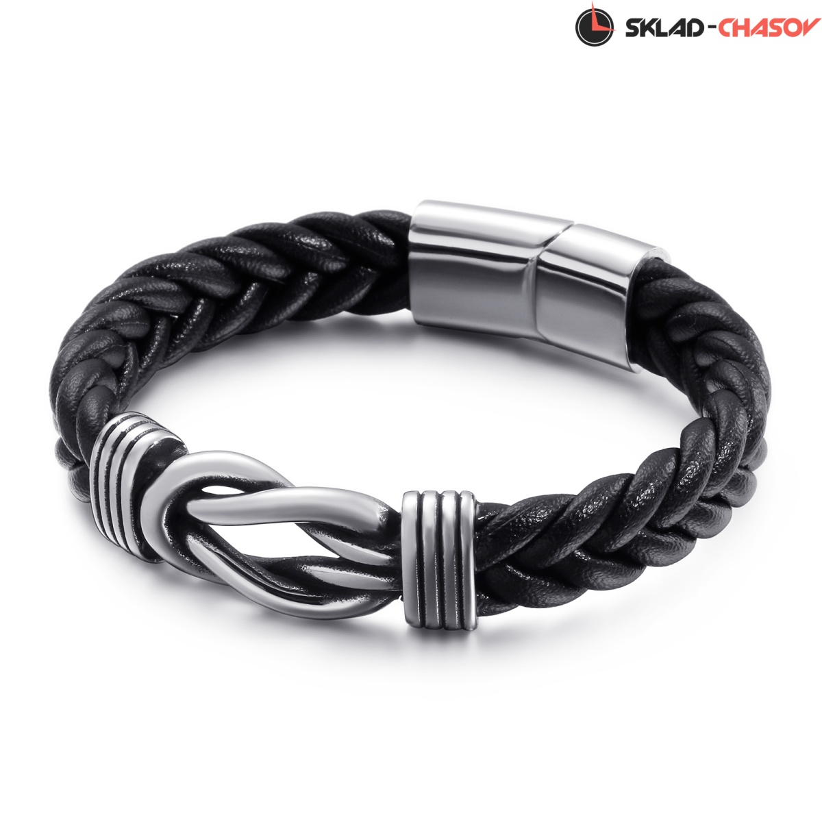 Браслет из натуральной кожи черного цвета украшен декоративными элементами из нержавеющей стали в виде стилизованного изображения знака бесконечности - символа единства и гармонии.